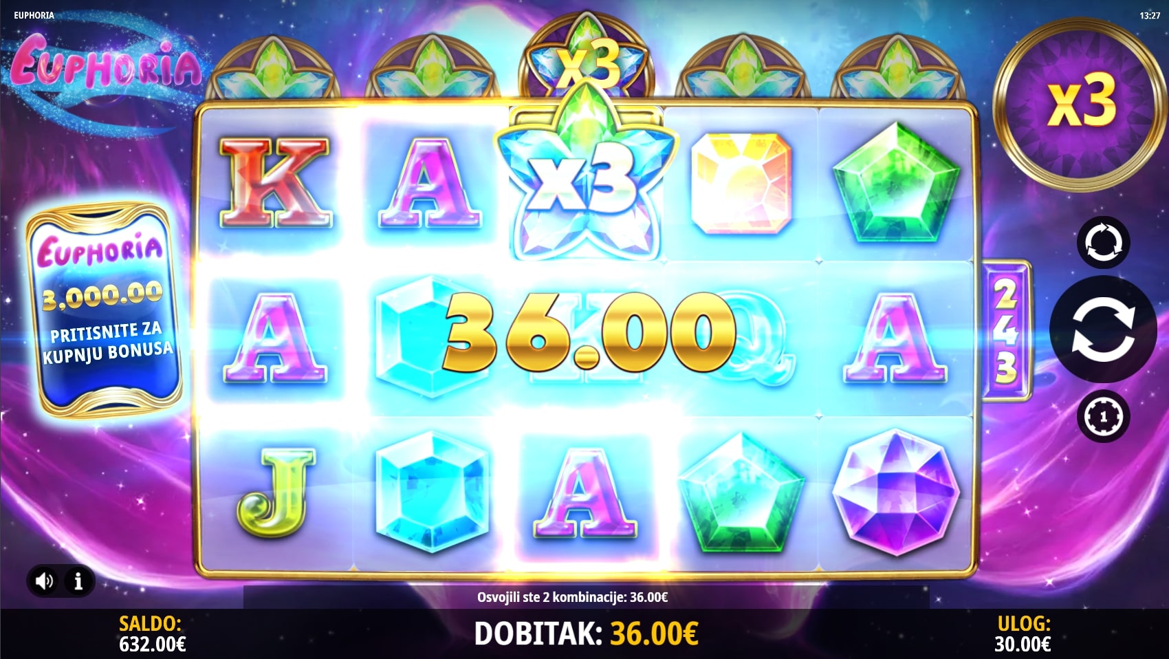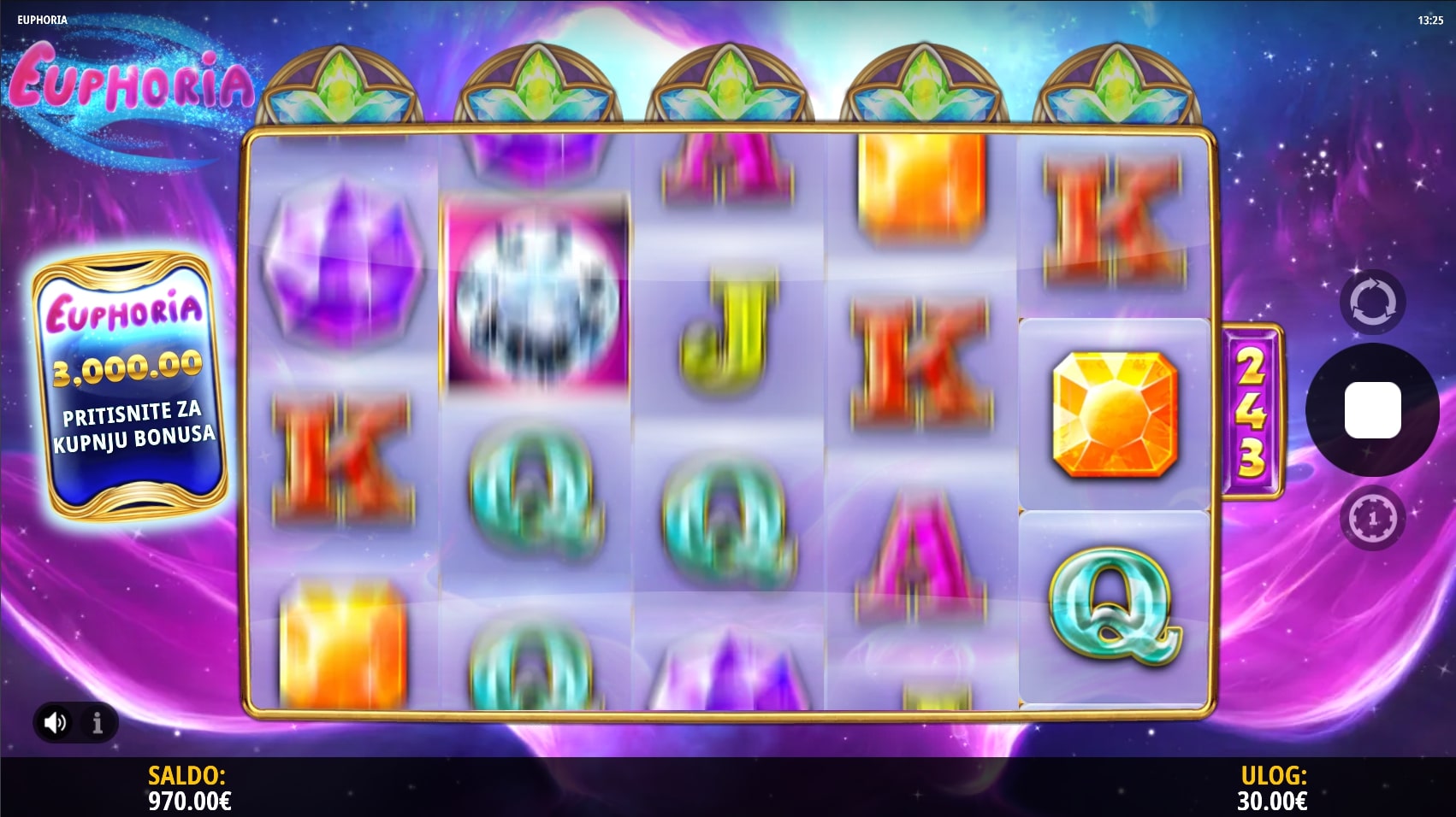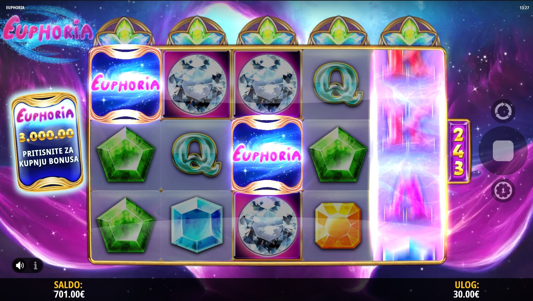 Euphoria je slot igra zabavnog karaktera koja igrača šalje u sedmo nebo u potrazi za predivnim nagradama. Simboli igre inspirirani su dragim kamenjem, a u stvaranju vrhunskih dobitaka pomaže im Wild simbol mijenjajući druge simbole. Kako bi igrač aktivirao besplatne vrtnje, potrebna je pojava simbola Euphoria na više koluta. Također, nasumično se može pokrenuti Euphoria Spin te odvesti dobitke na nove razine. Zaigraj slot Euphoria te osvoji fantastične nagrade!