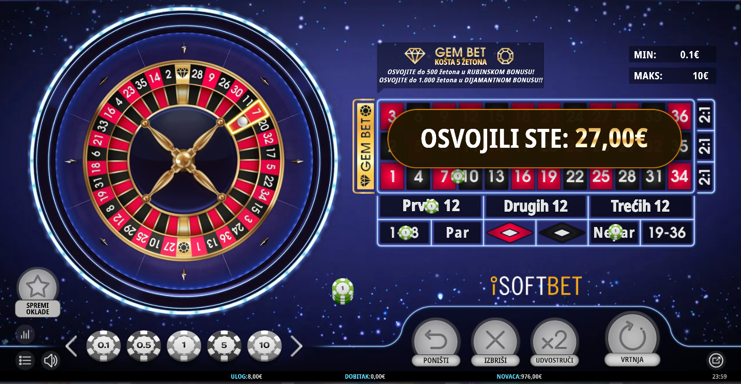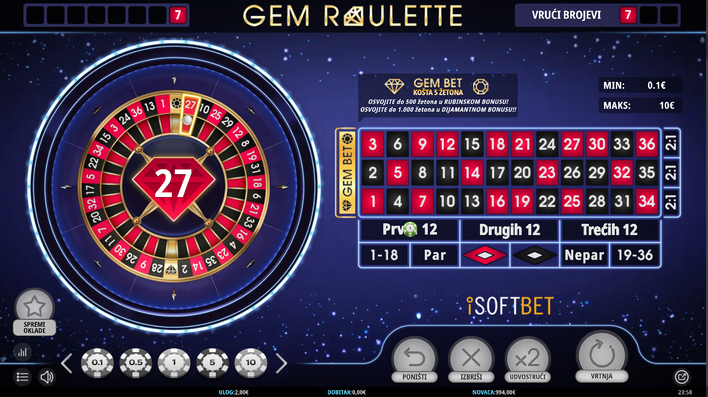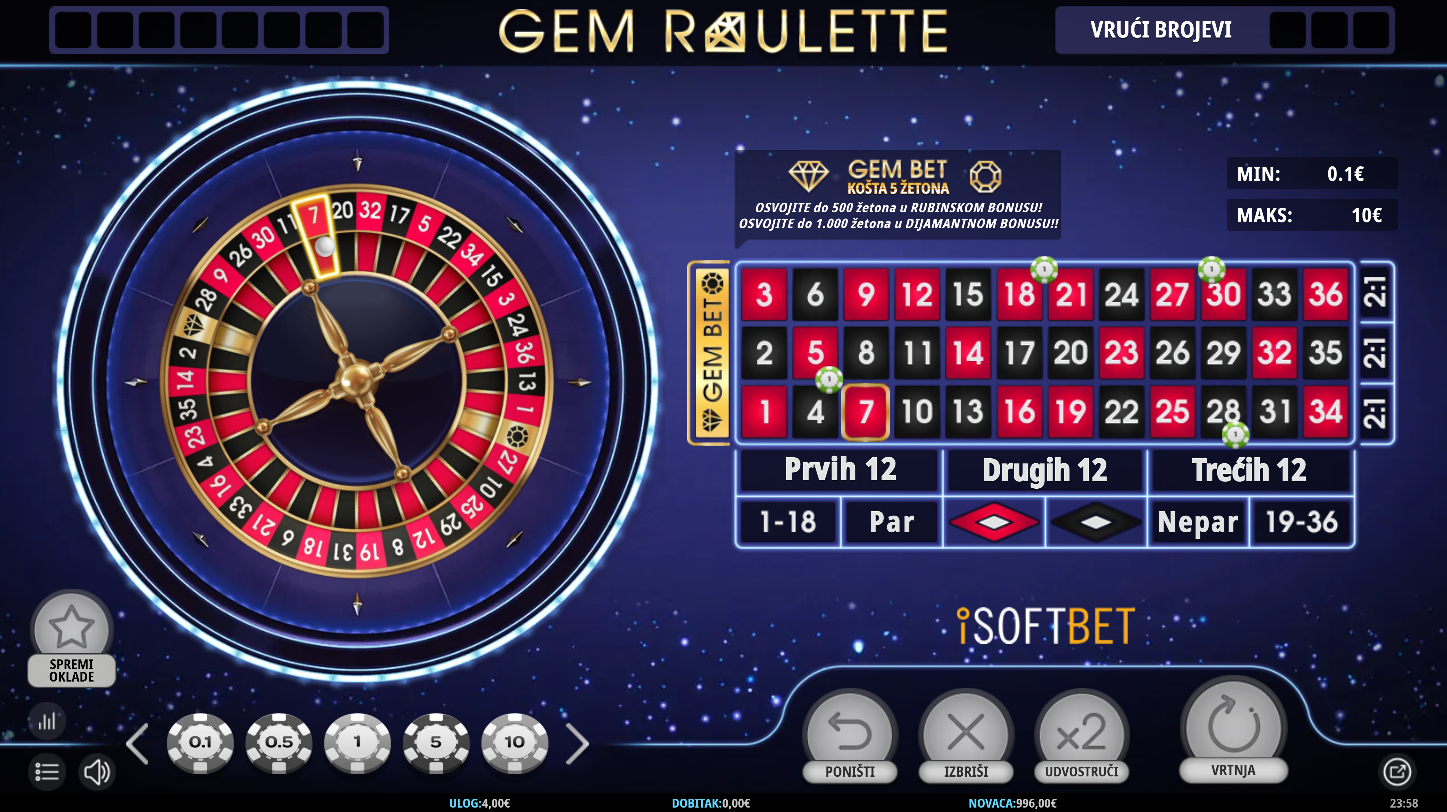Postavi svoje žetone kao i u svakom ruletu, ali sada imaš priliku dodati nešto posebno, Gem Bet. Odvaži se i uloži na Ruby i Diamond, a ako kuglica sleti na jedan od njih, pokreće se bonus kotač s potencijalom za velike nagrade. Ruby te može nagraditi do 100 puta, a Diamond čak i do 200 puta tvoje oklade. Sve izgleda poznato, ali u pozadini te čeka iznenađenje koje svaki spin može pretvoriti u pravi spektakl.