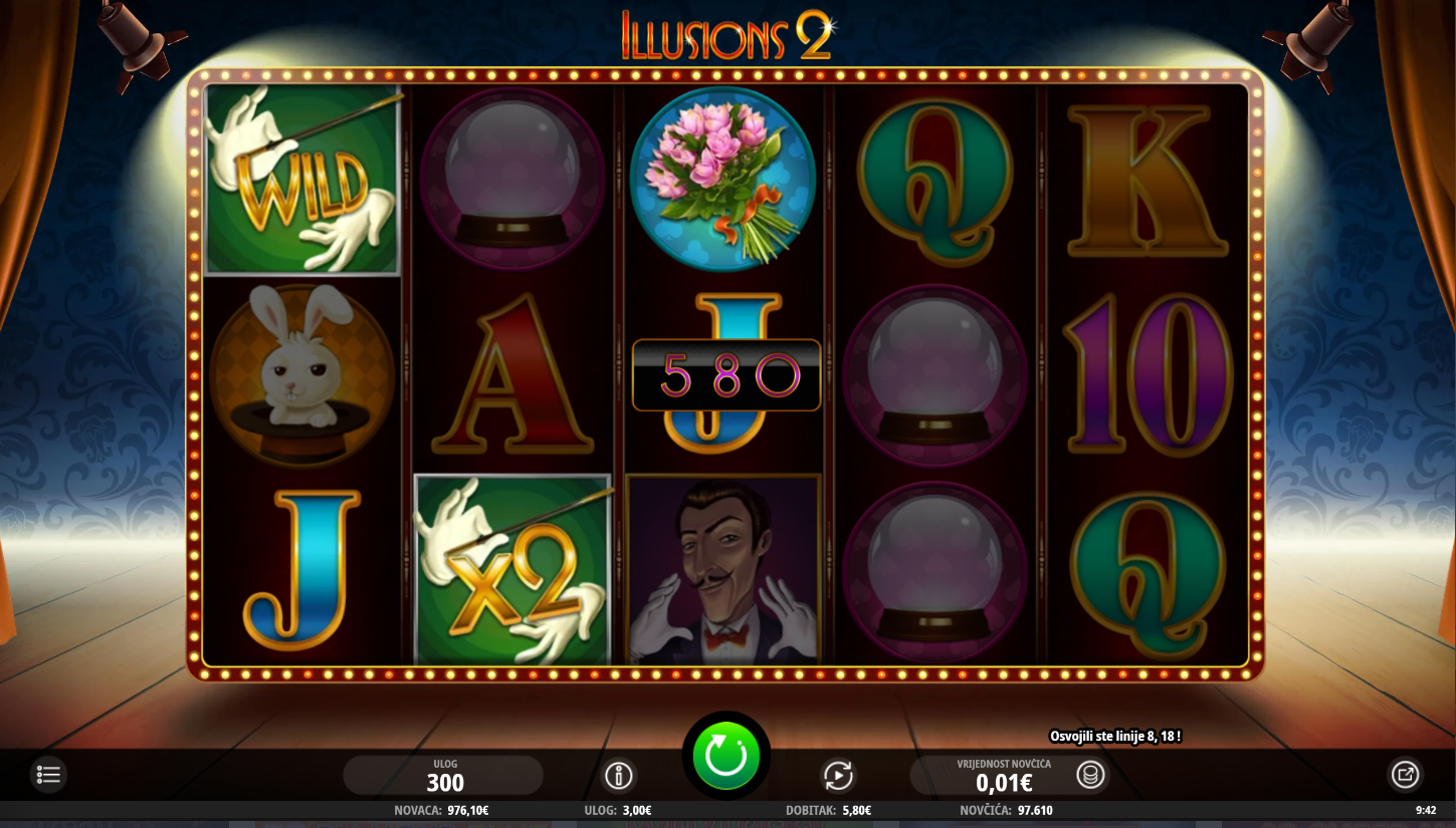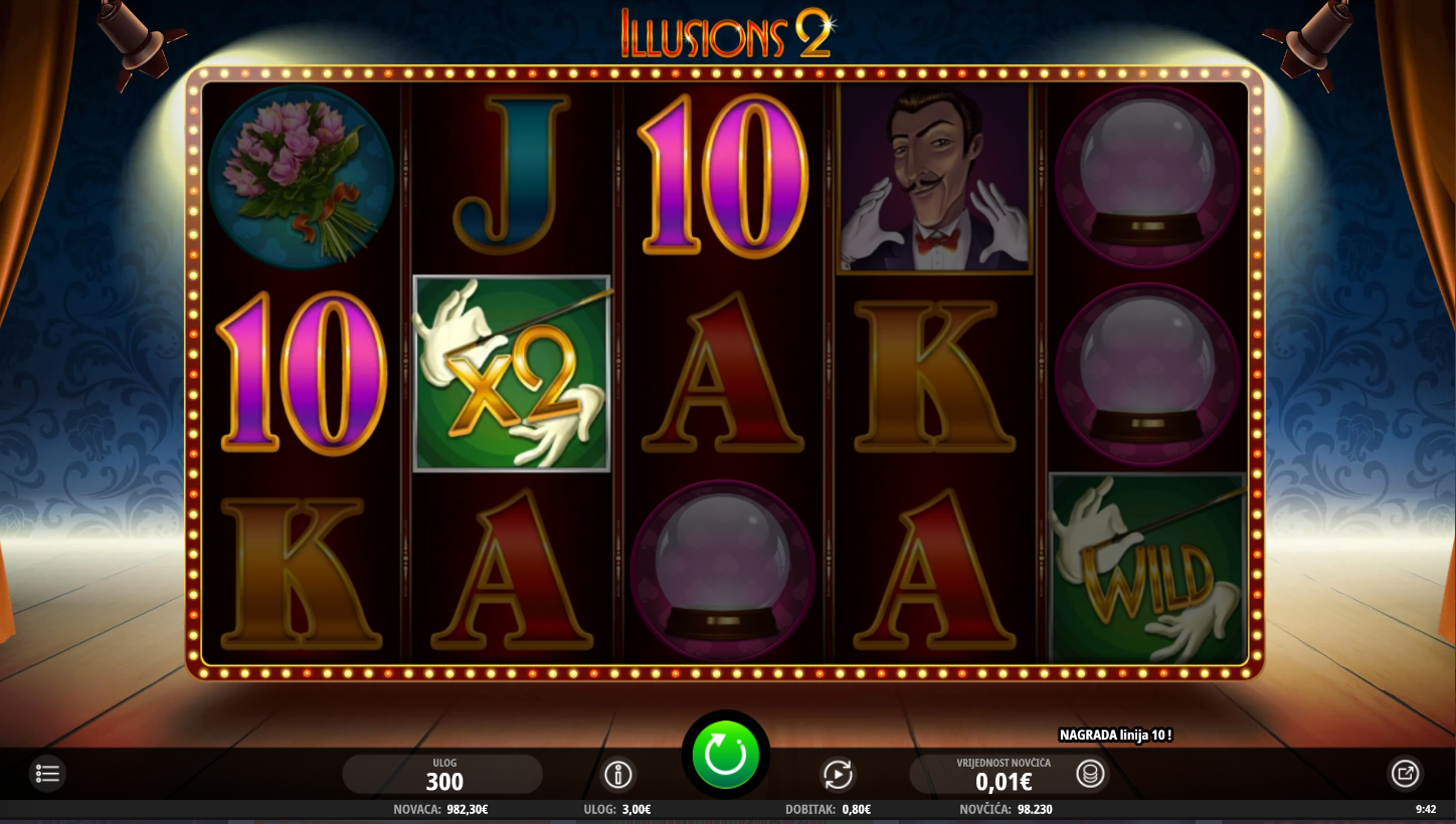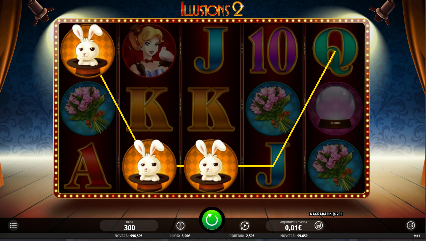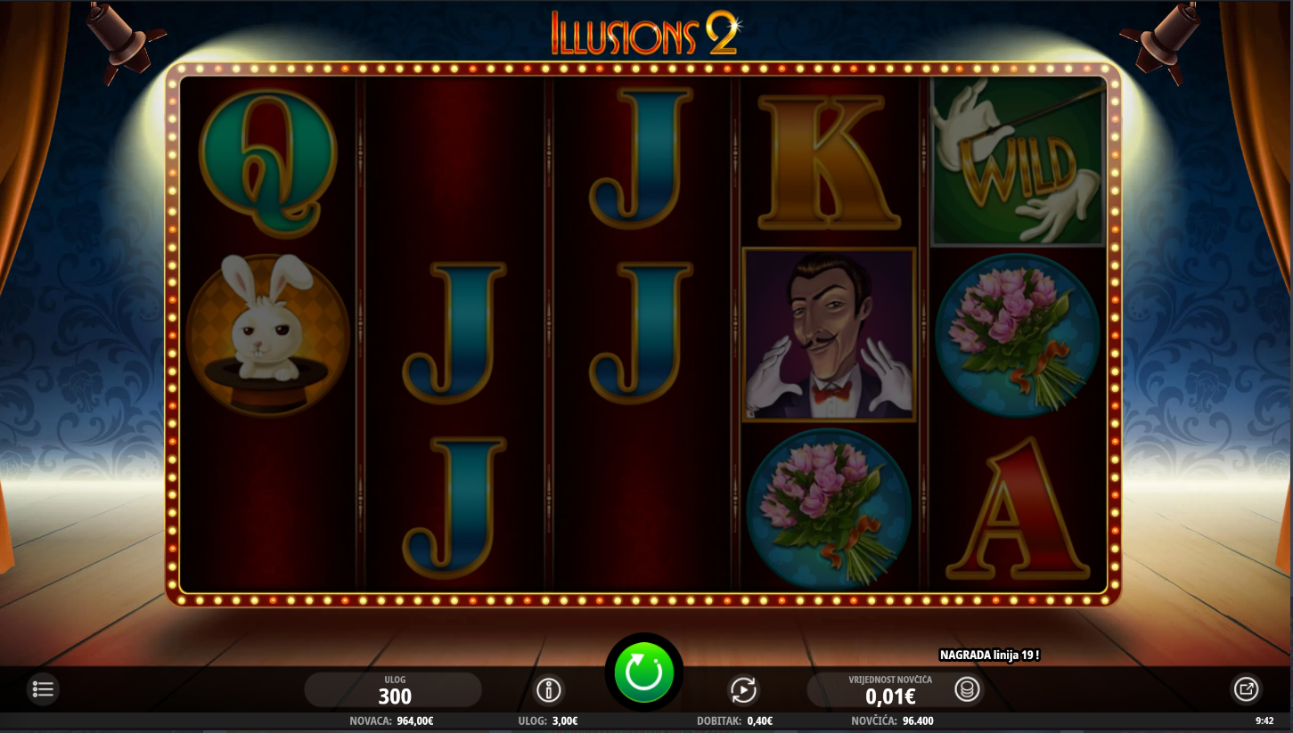 Illusions 2 je slot od iSoftBet-a s temom magije i kazališnih trikova. Igra se na 5 kolona, 3 reda i 30 fiksnih linija. Simboli uključuju mađioničare, zeca iz šešira, pomoćnicu i kristalnu kuglu. Atmosferu dodatno pojačava bogata grafika i mistična glazba.
