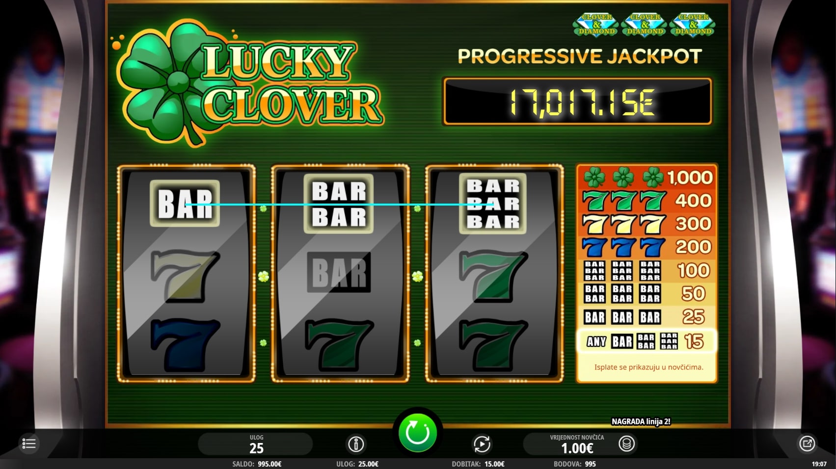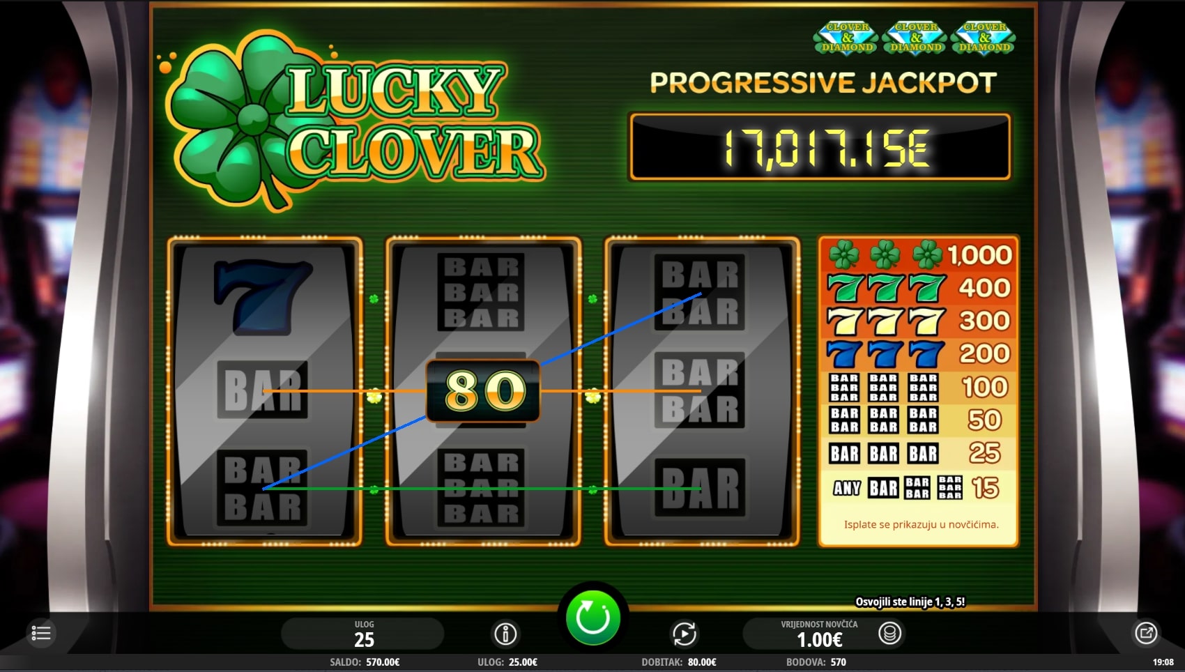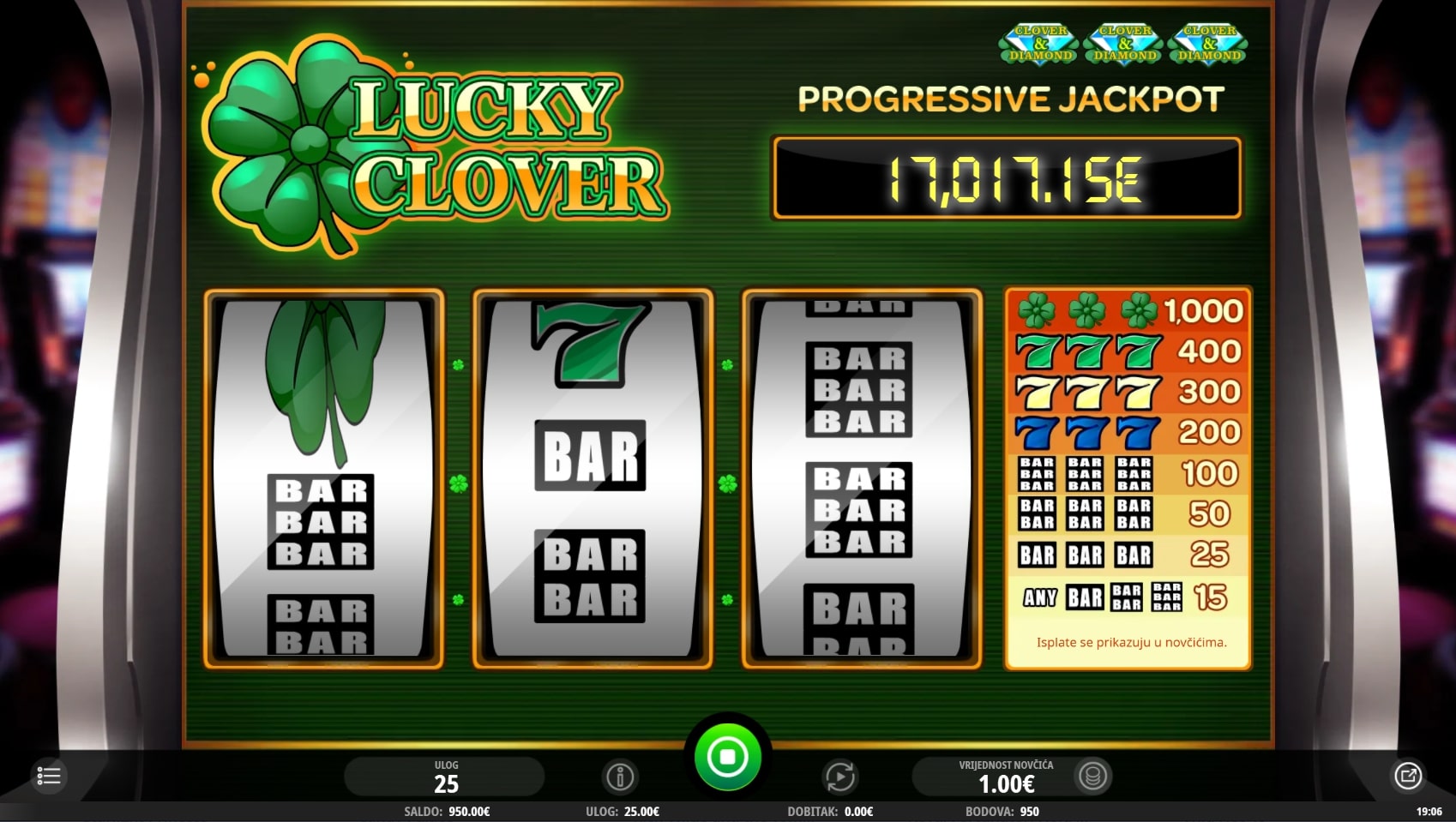 Lucky Clover slot je igra klasičnog karaktera po uzoru na retro slotove gdje najviše isplaćuju simboli sedmice i voća. Ova igra također sadrži sedmice, a simboli voća zamijenjeni su polugama. Ipak, najviše isplaćuju djeteline s četiri lista te one mogu zamijeniti druge simbole u potrazi za dobicima. Zaigraj Lucky Clover te osvoji fantastične nagrade!
