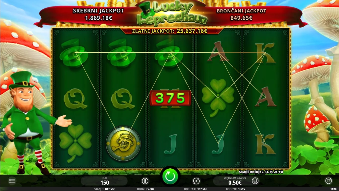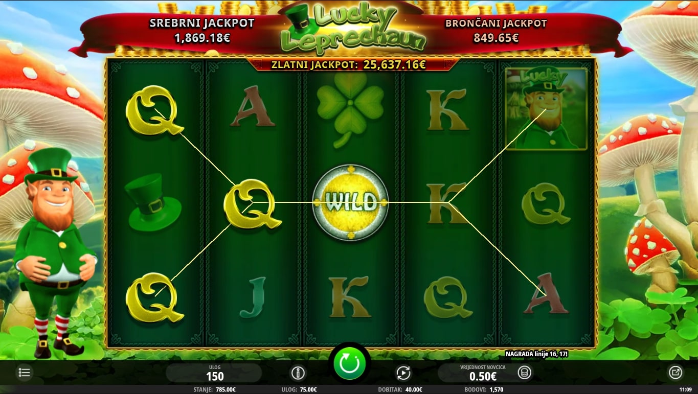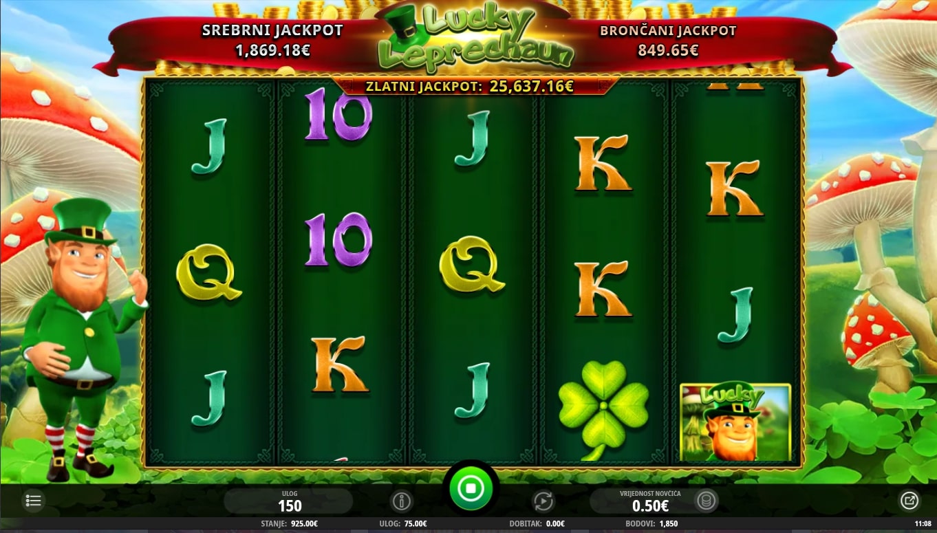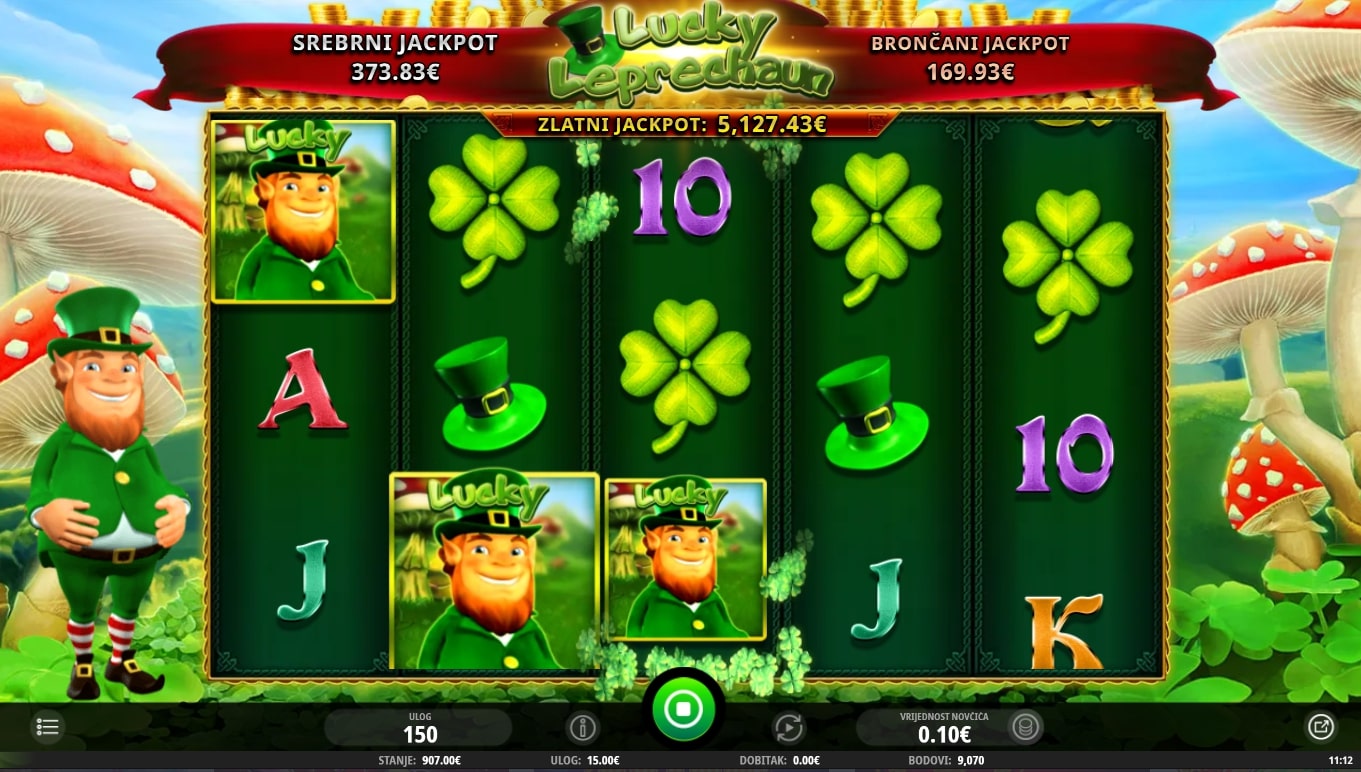 Lucky Leprechaun tematska je slot igra koja vodi igrača na kraj idilične duge u potrazi za vilenjacima i kotlićima zlata. Najviše isplaćuju simboli djeteline s četiri lista i šešira, dok novčići pomažu u stvaranju dobitaka zamjenom drugih simbola. S druge strane, Bonus igre i besplatne vrtnje aktiviraju se slaganjem simbola zlatnog kotlića, odnosno Lucky vilenjaka. Zaigraj Lucky Leprechaun te osvoji fantastične nagrade!