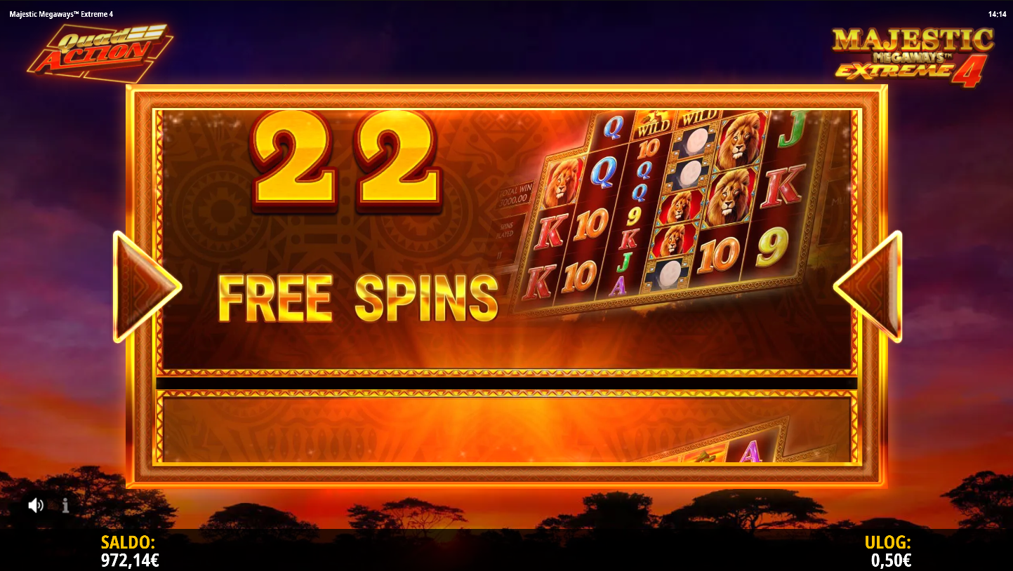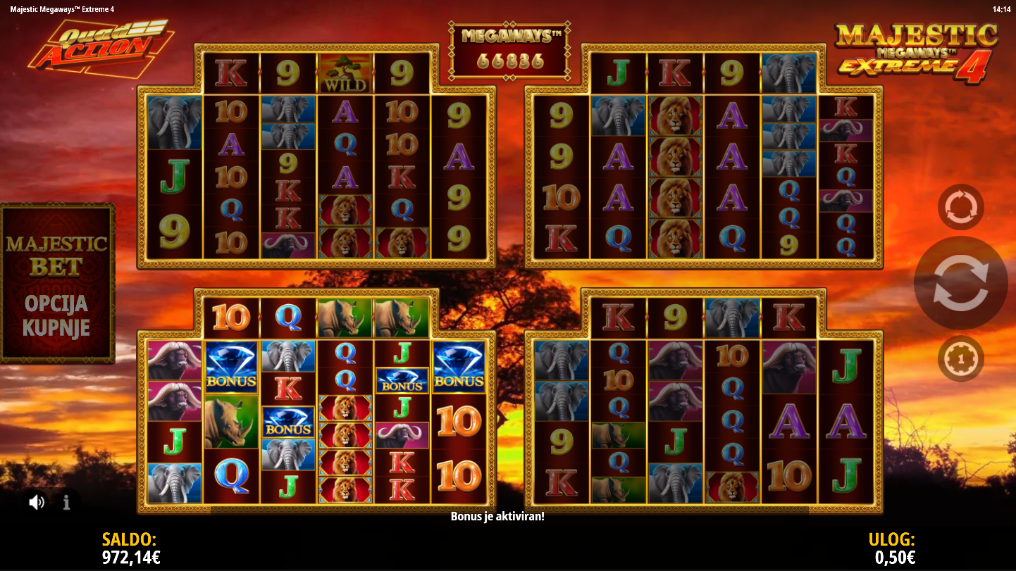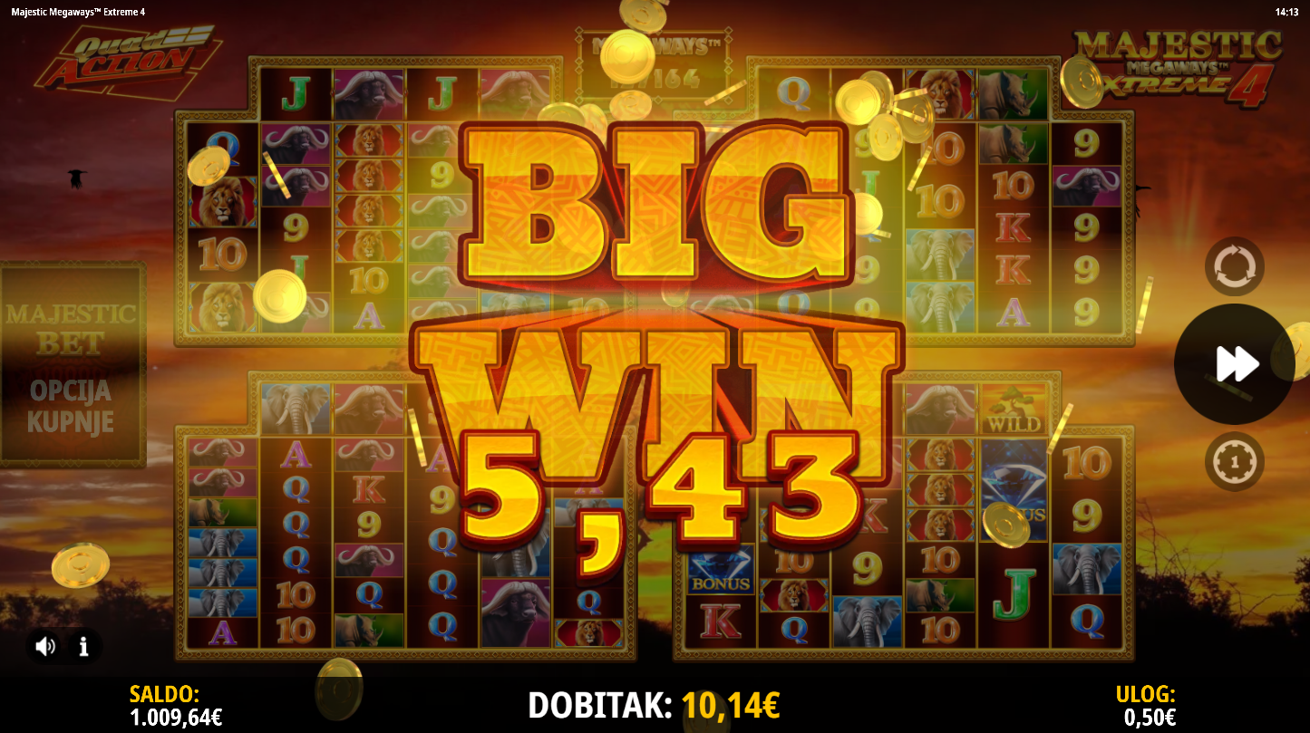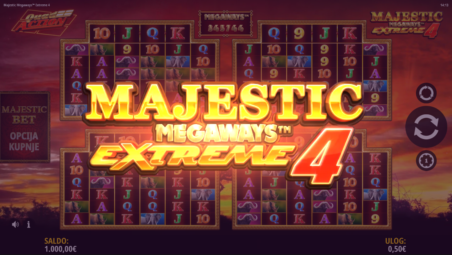Majestic Megaways Extreme 4 je eksplozivan slot od iSoftBet koji koristi četiri Megaways mreže za masivan potencijal dobitka. Smješten u afričkoj savani, igra donosi lavove, slonove i druge životinje u borbi za nagrade do 20000× uloga. Sačinjena je od vibrantnih animacija, zvučnih efekata i adrenalinskih bonus rundi. Pripremi se na slot koji ne oprašta i ne prestaje iznenađivati!