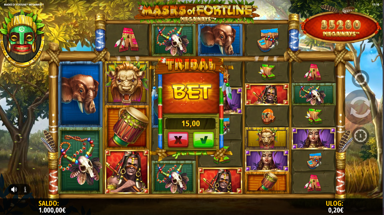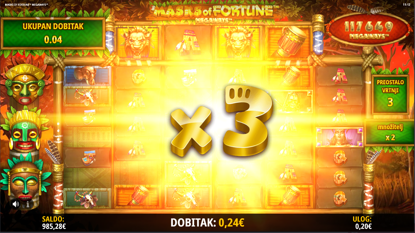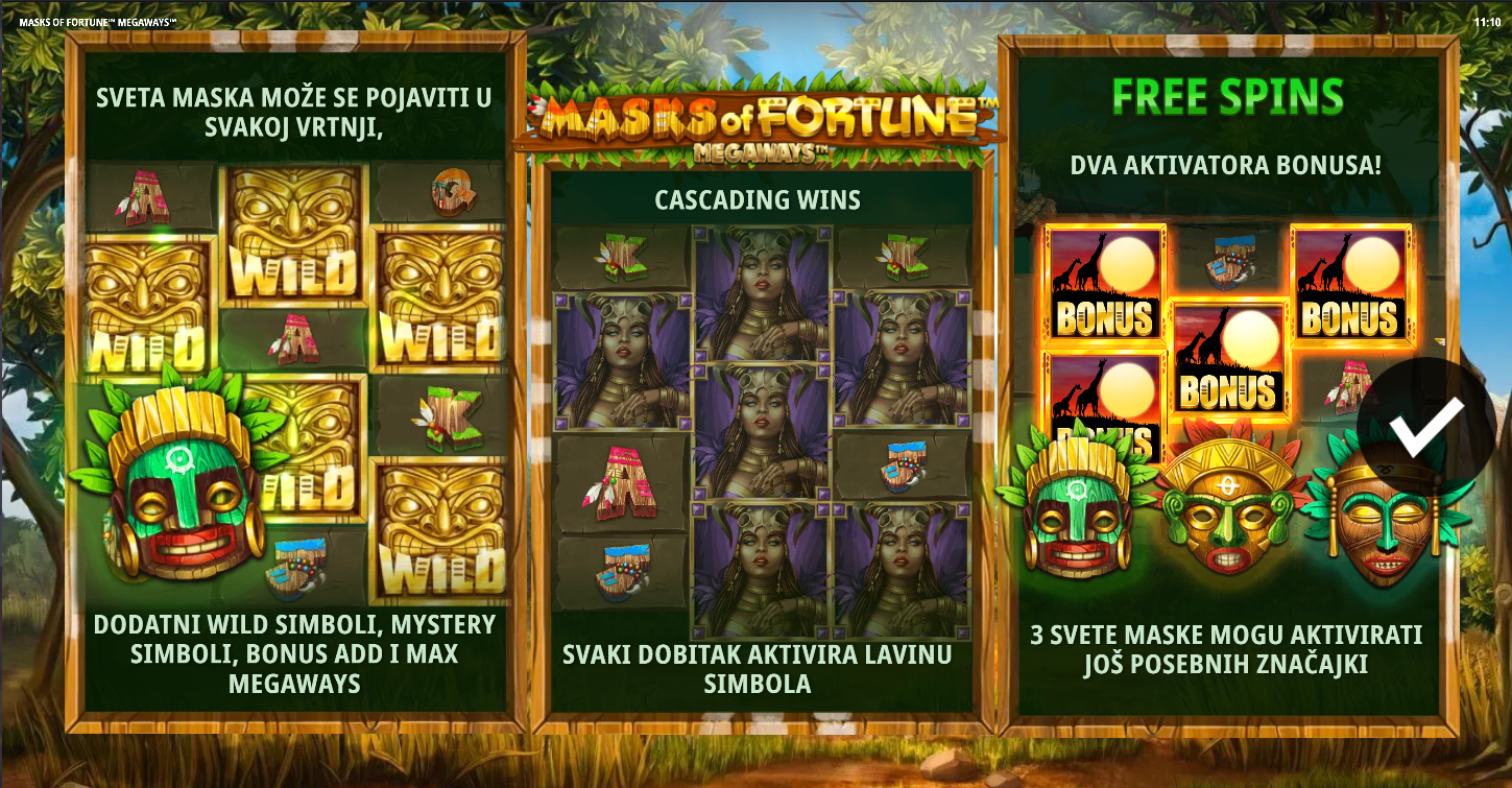 Uđi u svijet afričke magije s Masks of Fortune Megaways, od providera iSoftBet, slotom koji spaja bogatu temu, snažne vizuale i dinamičnu mehaniku. Igra nudi do 117649 načina za dobitak, uz kaskadne simbole i misteriozne maske koje mijenjaju tok igre. Sacred Mask modifikatori mogu nasumično donijeti wildove, dodatne simbole ili pojačanja. Sve to dolazi uz raskošnu grafiku i atmosferu koja te doslovno uvlači u igru. Ovo nije običan slot, ovo je prava vizualna i mehanička avantura!