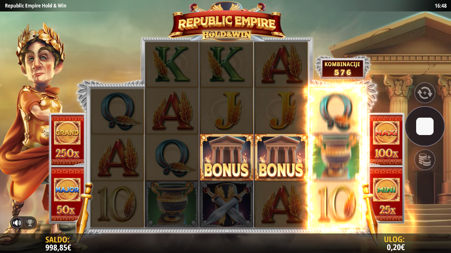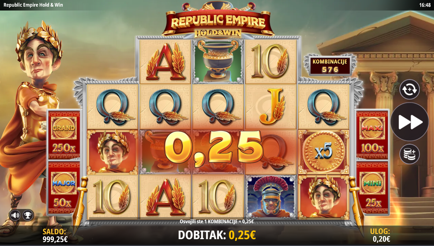 S RTP-om od oko 96% i visokom volatilnošću, Republic Empire Hold & Win savršeno spaja luksuz i napetost. Dobici možda ne dolaze stalno, ali kad se pojave, izgledaju kraljevski! Maksimalni potencijal dobitka doseže do 5000 puta uloga, što znači da svaka vrtnja može postati tvoj ulazak u zlatnu elitu. Sjajna grafika, orkestralna glazba i eksplozivni bonusi čine ovu igru carskim iskustvom!