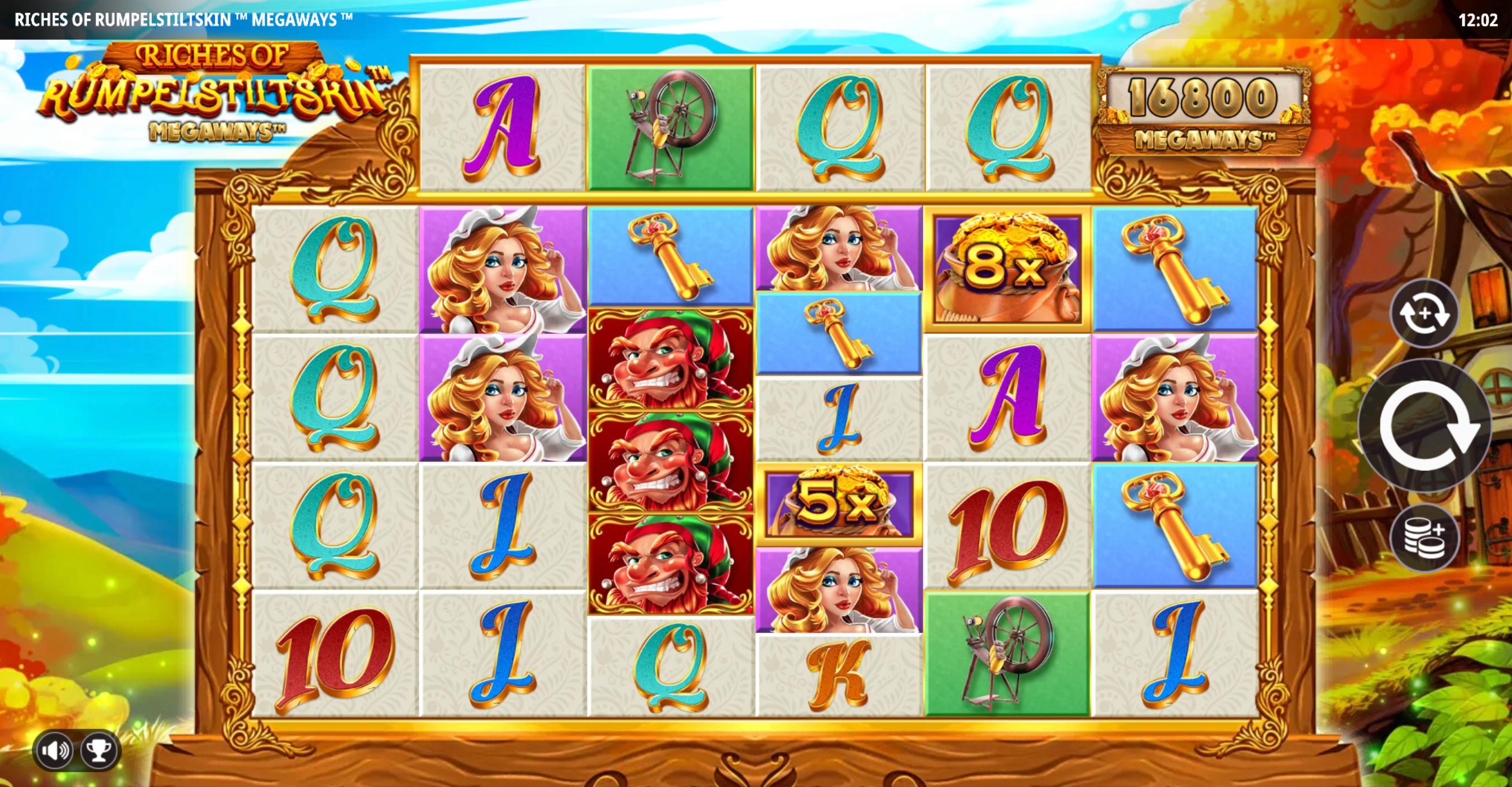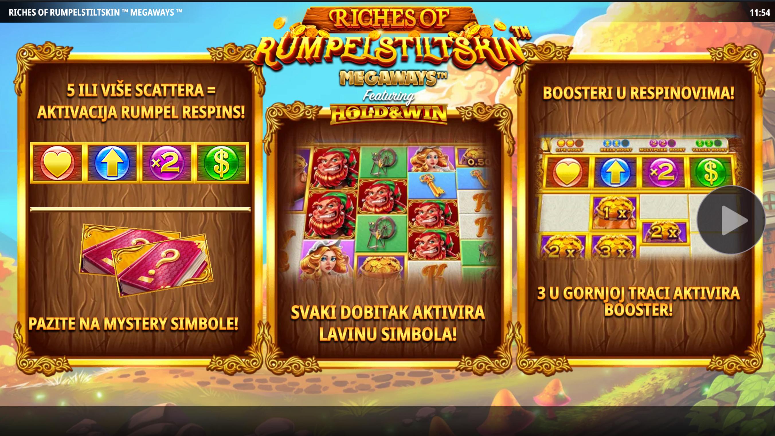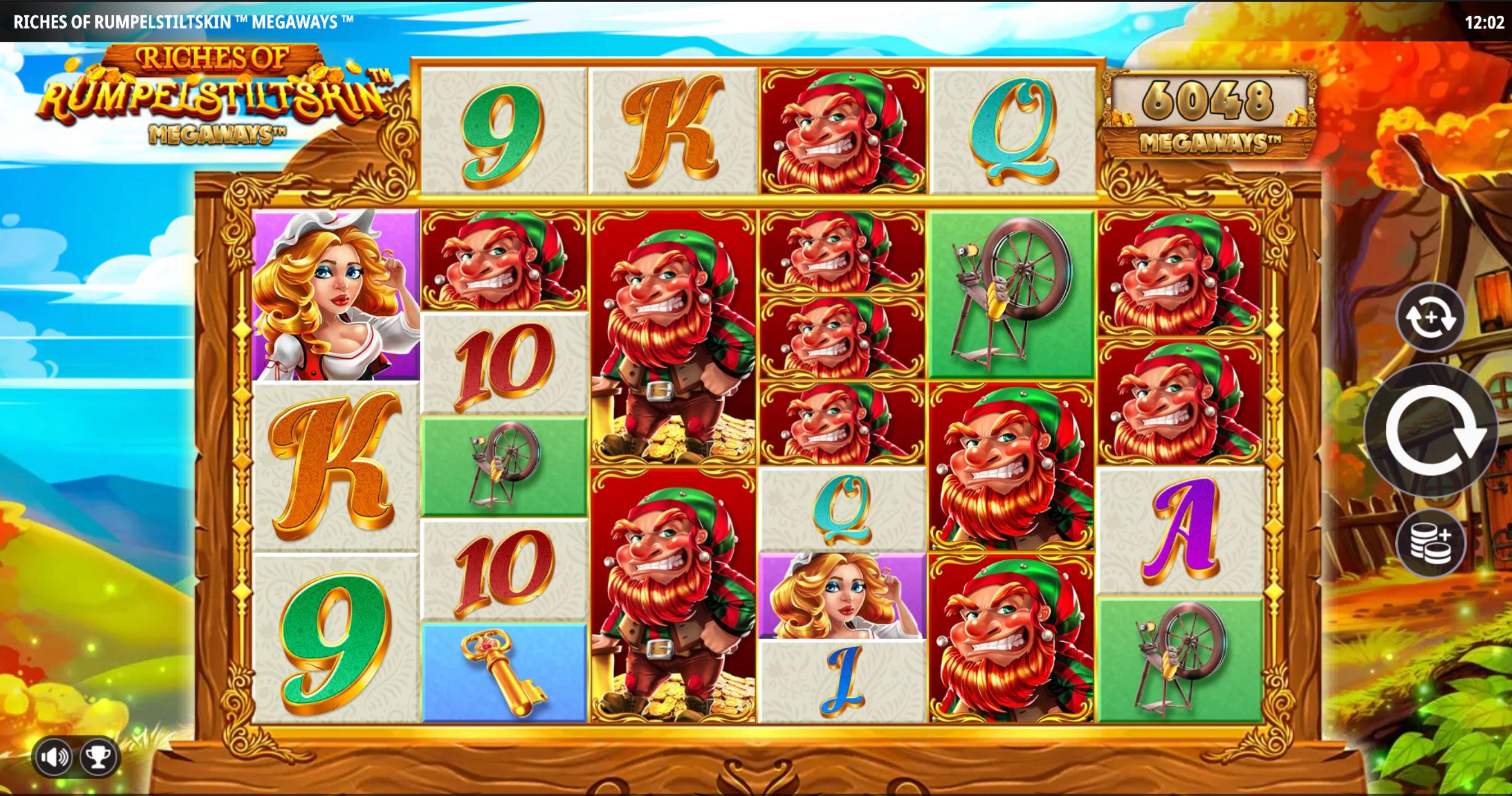 Riches of Rumpelstiltskin Megaways donosi priču iz Braće Grimm, u kojoj se mlinarica suočava s vilom mračnih namjera. Igra koristi mehaniku Megaways s šest koluta i promjenjivim brojem simbola po kolutu (između 2 i 7), što pruža do 117.649 načina za dobitak. Tematski simboli uključuju karte (9-A) kao manje vrijedne, te ključ, mlinaricu, i samog Rumpelstiltskina kao najvrjednije simbole. Grafika igre je detaljna, s bajkovitim pejzažima, zlatnim elementima i zvučnom pozadinom koja pojačava doživljaj mitološkog i fantastičnog svijeta.