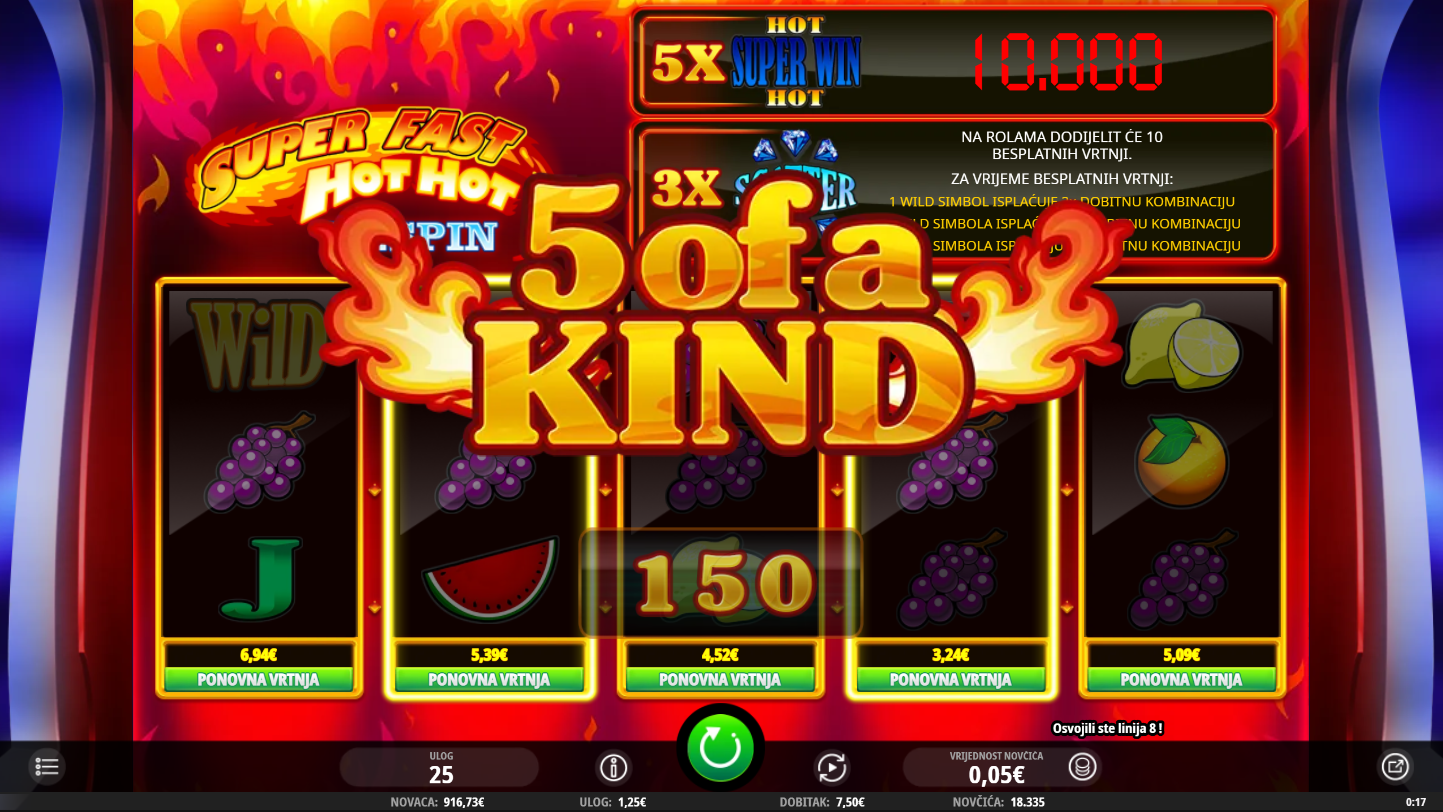 iSoftBet, uz pomoć Super Fast Hot Hot RESPIN, tevraća klasičnoj voćnoj slot avanturi, ali s dodatkom modernog štiha, svaka voćka imitira zvuk old-school automata, a sve kulminira uz srceparajući grafički stil. Ekran pršti bojama i simboli kao trešnje, limuni i dijamanti oživljavaju isplatne linije. Uz respin opciju, nakon svakog spina možeš odlučiti želiš li ponovno zavrtjeti određenu kolonu za dodatnu šansu. Iako vizualno retro, igra nudi inovativne mehanike i dinamiku koja će te sigurno držati zaokupiranim.