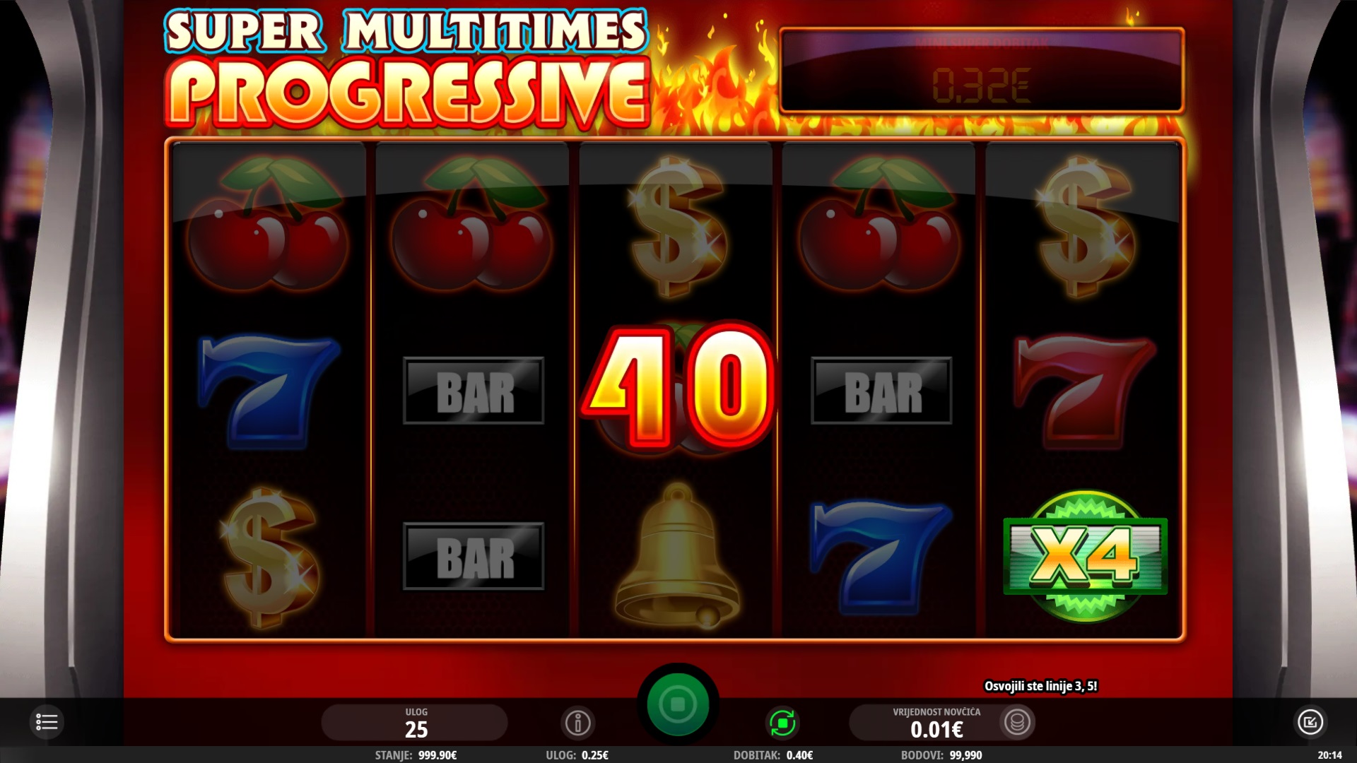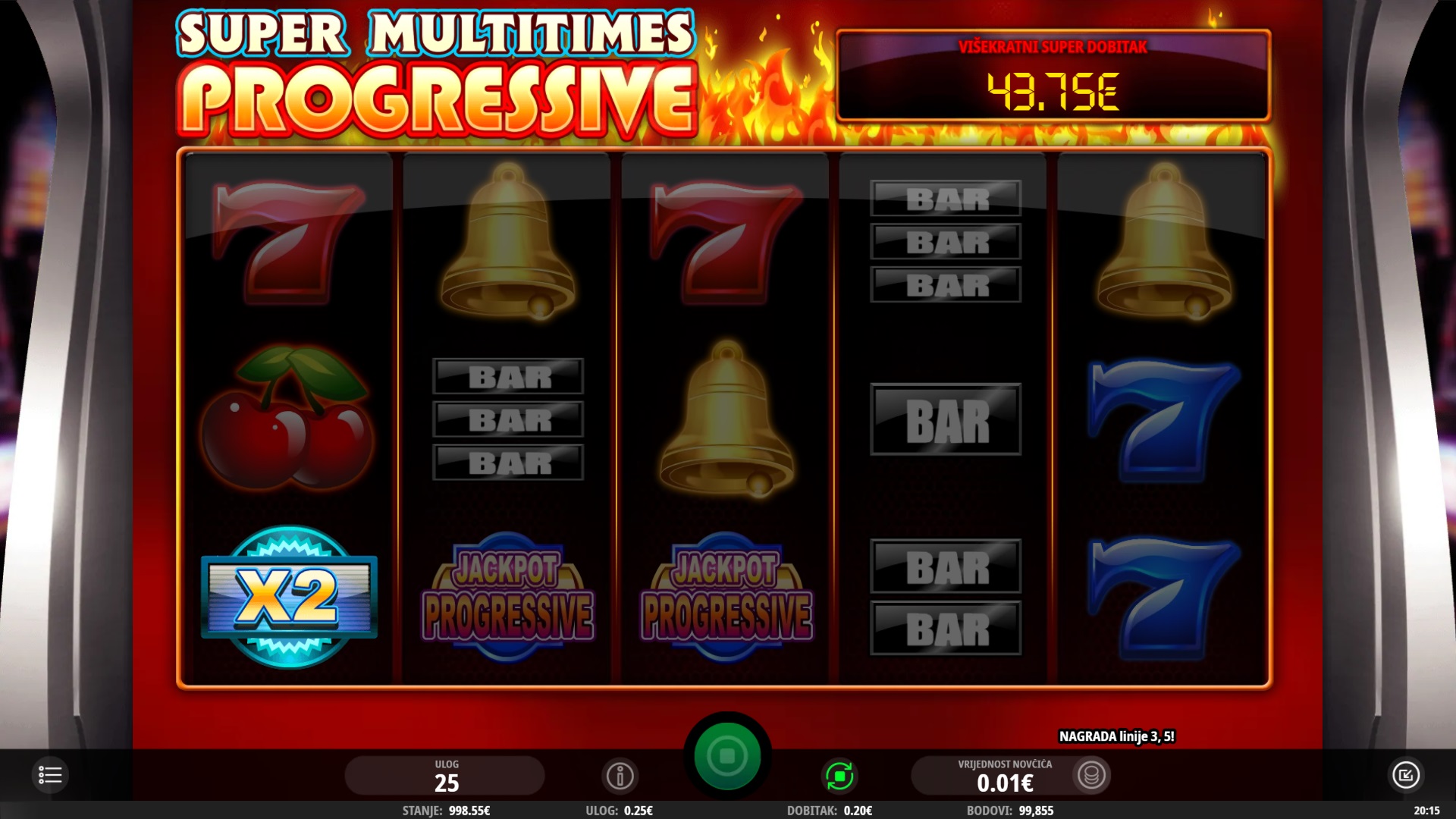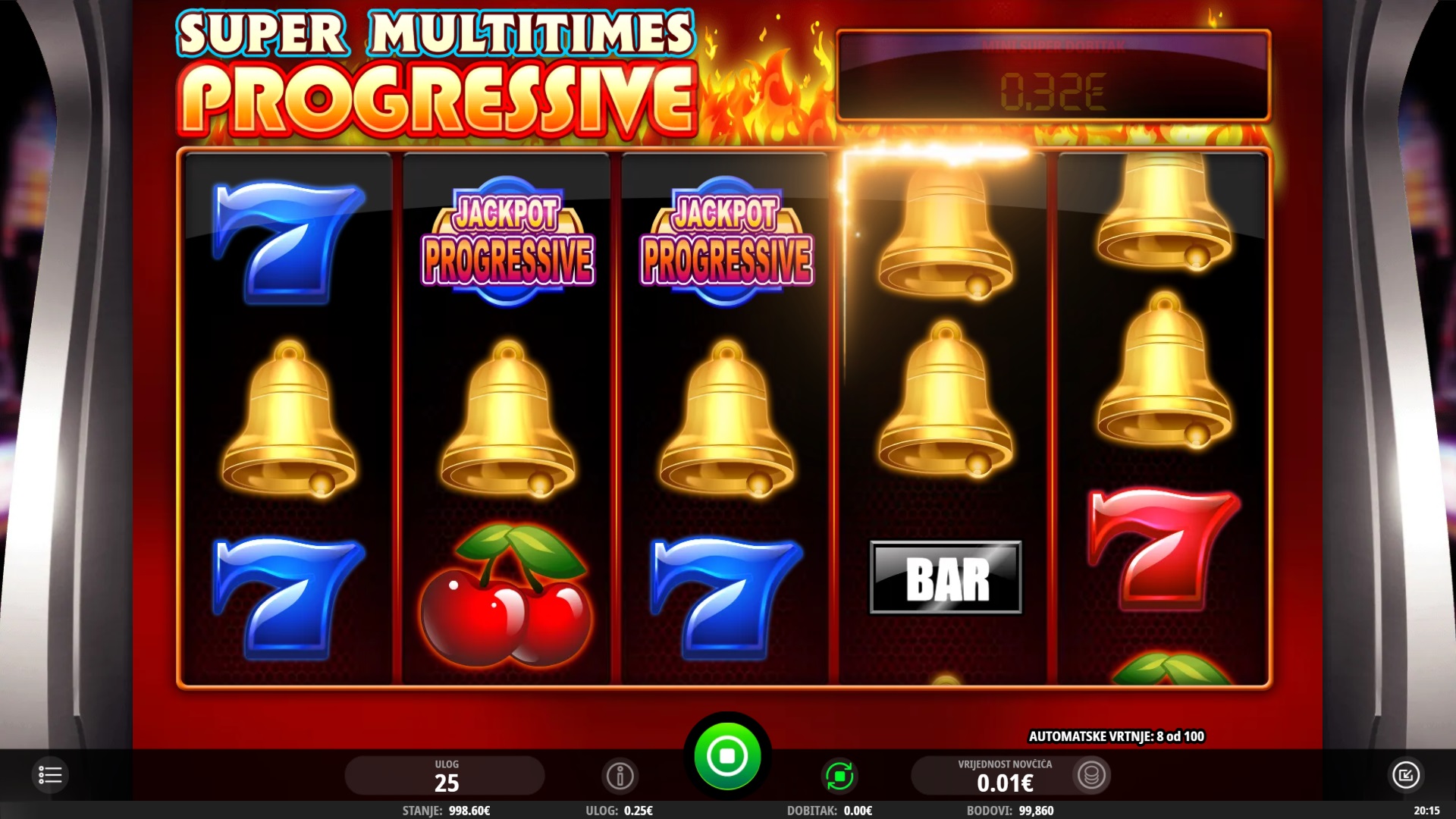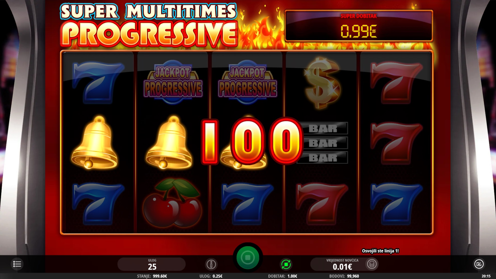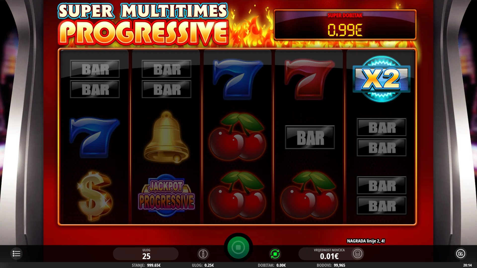 Super Multitimes Progressive je slot igra s pet rola i tri reda, te fiksnih pet linija. S posebnim množiteljima i progresivnim jackpotima, ova igra nudi mnoštvo prilika za osvajanje impresivnih nagrada. Plavi, zeleni i crveni simboli množitelja povećavaju tvoje šanse za dobitak, dok progresivni jackpoti donose priliku za osvajanje velikih nagrada, uključujući Mini, Super i Višekratni jackpot. Svaka vrtnja nudi mogućnost osvajanja besplatnih vrtnji, a s višestrukim jackpot razinama, zabava je zajamčena.