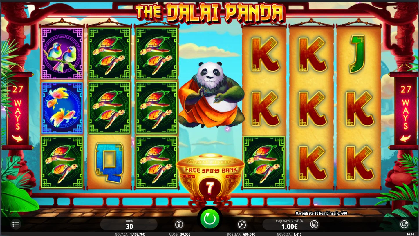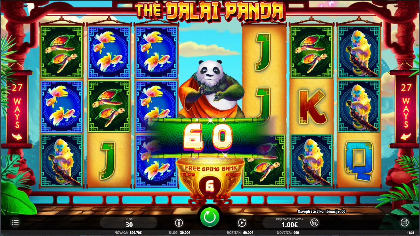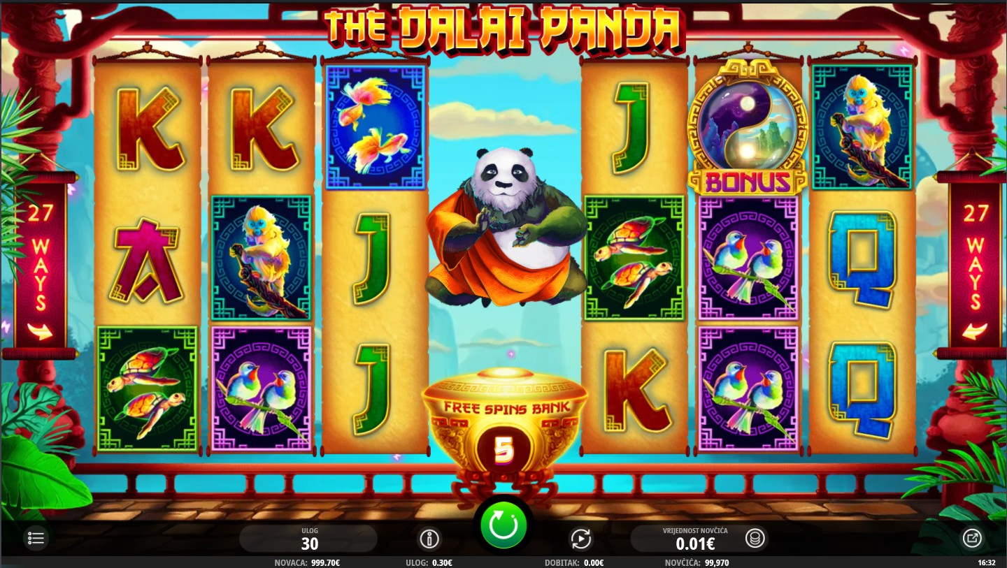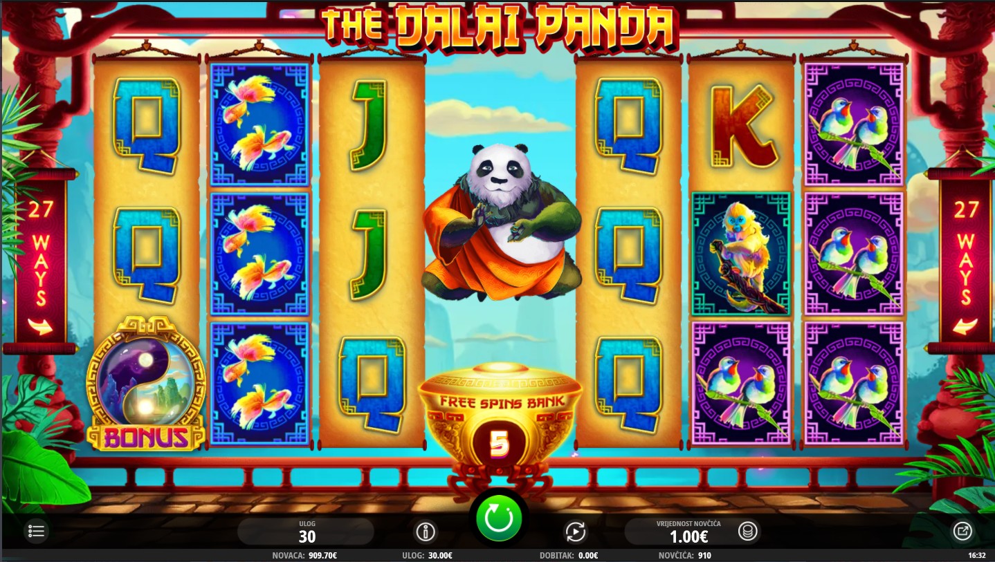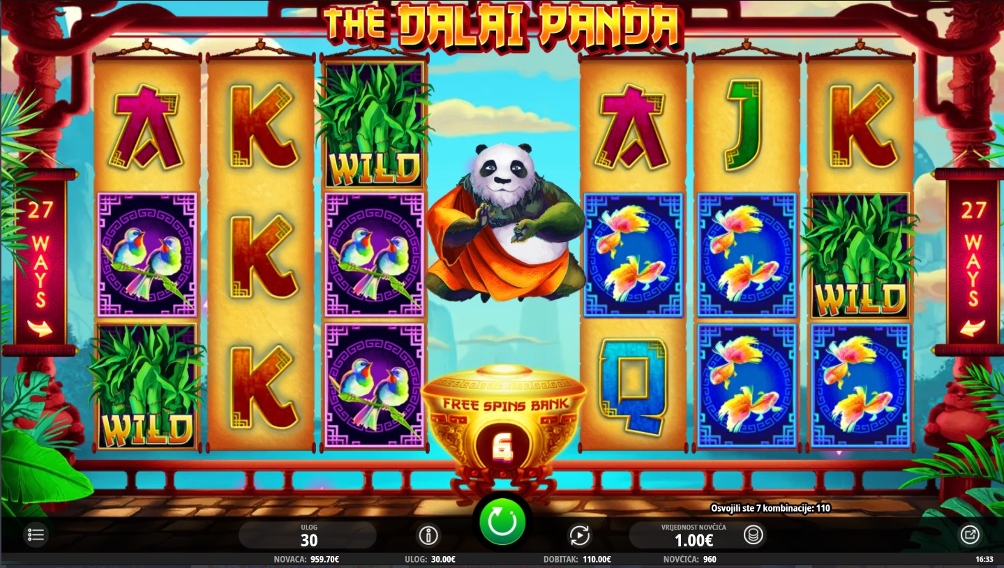 The Dalai Panda vodi te u svijet pandi gdje se igraš na 6 bubnjeva i 3 reda. Iskoristi Wild simbole i Proširene dobitke za maksimalne nagrade, a aktiviraj besplatne vrtnje pomoću Bonus simbola. Tijekom besplatnih vrtnji mogu se pojaviti Wild role i nasumični Wild simboli, a dobici se mogu dodatno udvostručiti multiplikatorom. Svaka vrtnja donosi opuštajuću, ali napetu avanturu s mnoštvom uzbudljivih trenutaka.