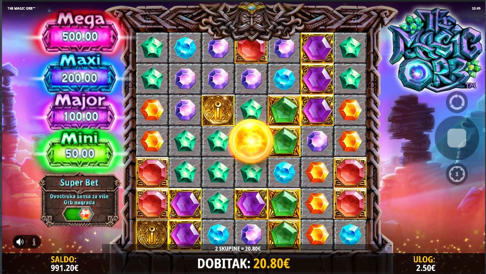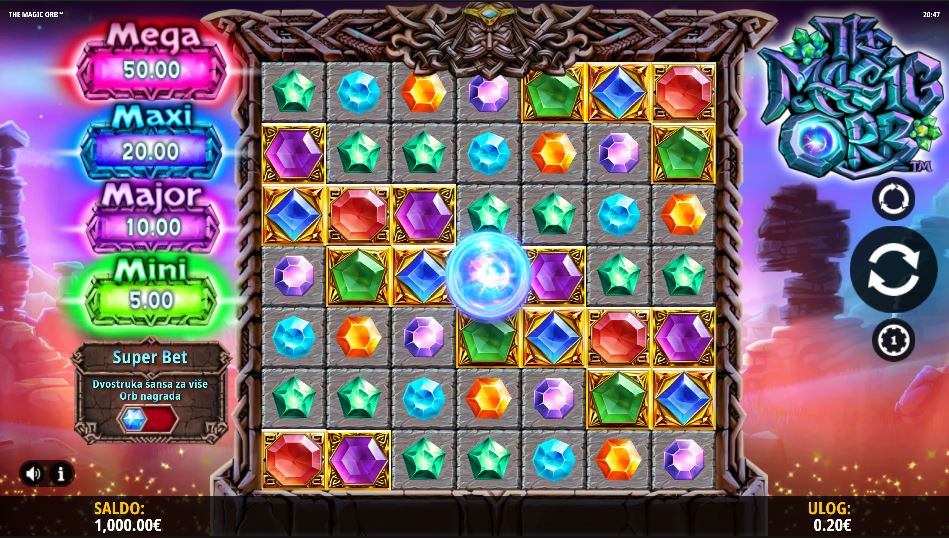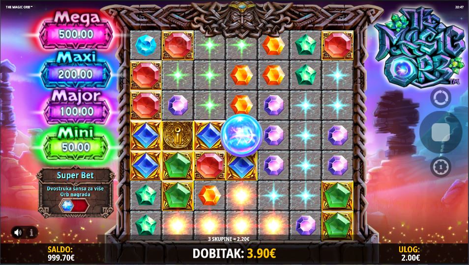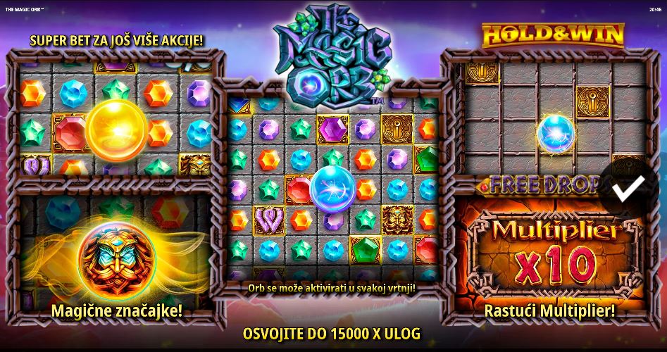 Ako aktivirate Super Bet, dodajte dodatnih 25% cijeni kako biste udvostručili šansu za više Orb nagrada. Svaki pad izbacuje 48 simbola na valjke, jer se simbol u sredini nikada ne pomiče. Ovo je sama Magična Kugla, koja je većinu vremena beživotna, ali povremeno aktivira poneki modifikator ili dodjeljuje jednu od dvije bonus igre.
