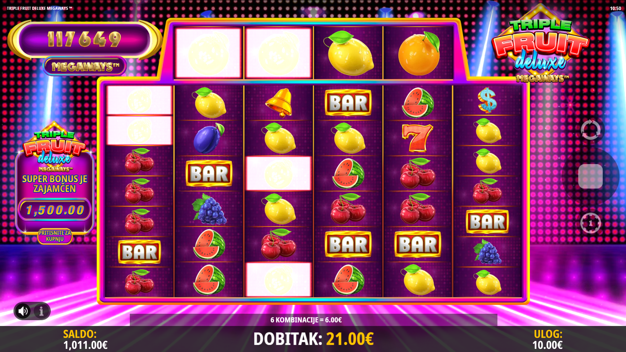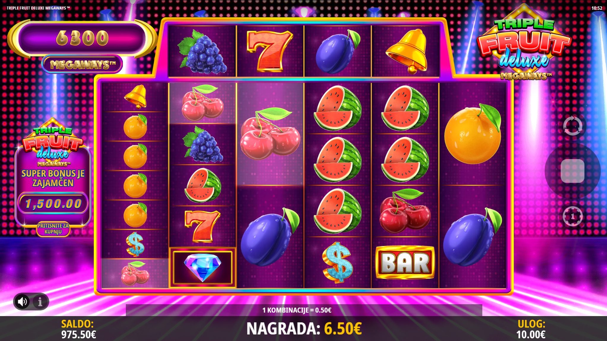 Triple Fruit Deluxe Megaways vodi svoje igrače kroz zabavnu avanturu obogaćenu pažljivo ilustriranim voćnim simbolima uz dodatak zlatnih efekata. Super jednostavan način igranja omogučiti će igračima dugotrajnu zabavu, a kako bi ona također bila i uzbudljiva pobrinuti će se Triple Fruit Deluxe Megaways wild simboli koji će tvoje dobitke pretvoriti u veće i učestalije. Ako voliš igre koje ti pružaju izvrstan omjer rizika i dobitaka došao si na pravo mjesto! Prepusti se zabavi i užitku te sa sobom odnesi velike dobitke!
