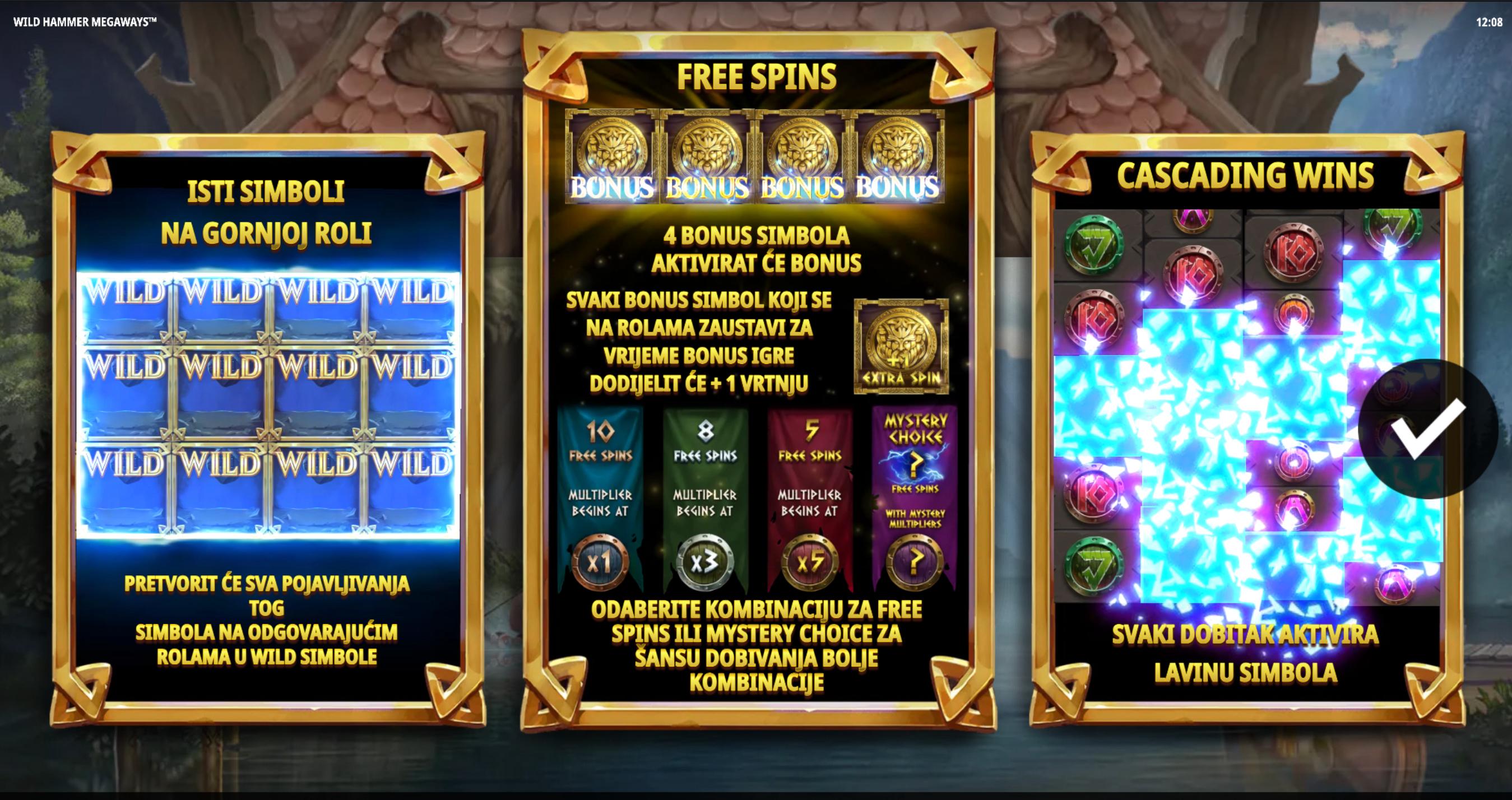 Wild Hammer Megaways vodi te u svijet nordijske mitologije, gdje se susreću Thor, Odin, Freya, Loki i druge legendarne figure. Igra koristi Megaways mehaniku, s šest koluta i promjenjivim brojem simbola po kolutu (od dva do sedam), što znači da može imati do 117.649 načina za dobitak po okretaju. Simboli uključuju karte niže vrijednosti (10, J, Q, K, A) te moćne likove poput Freye, Fenrira i Thora. Wild simbol je Thorov čekić Mjölnir, dok Scatter simbol donosi pristup besplatnim okretajima.