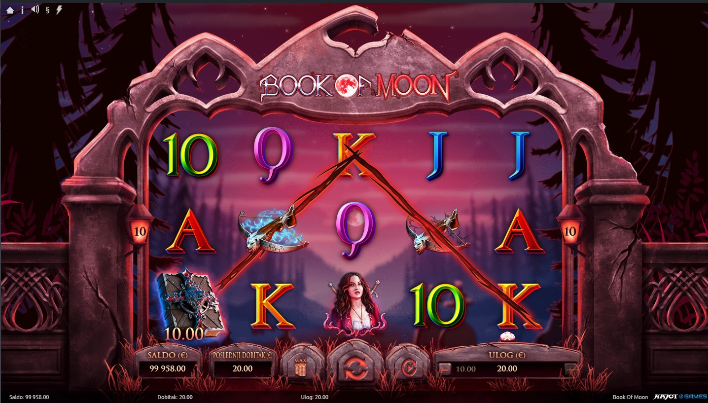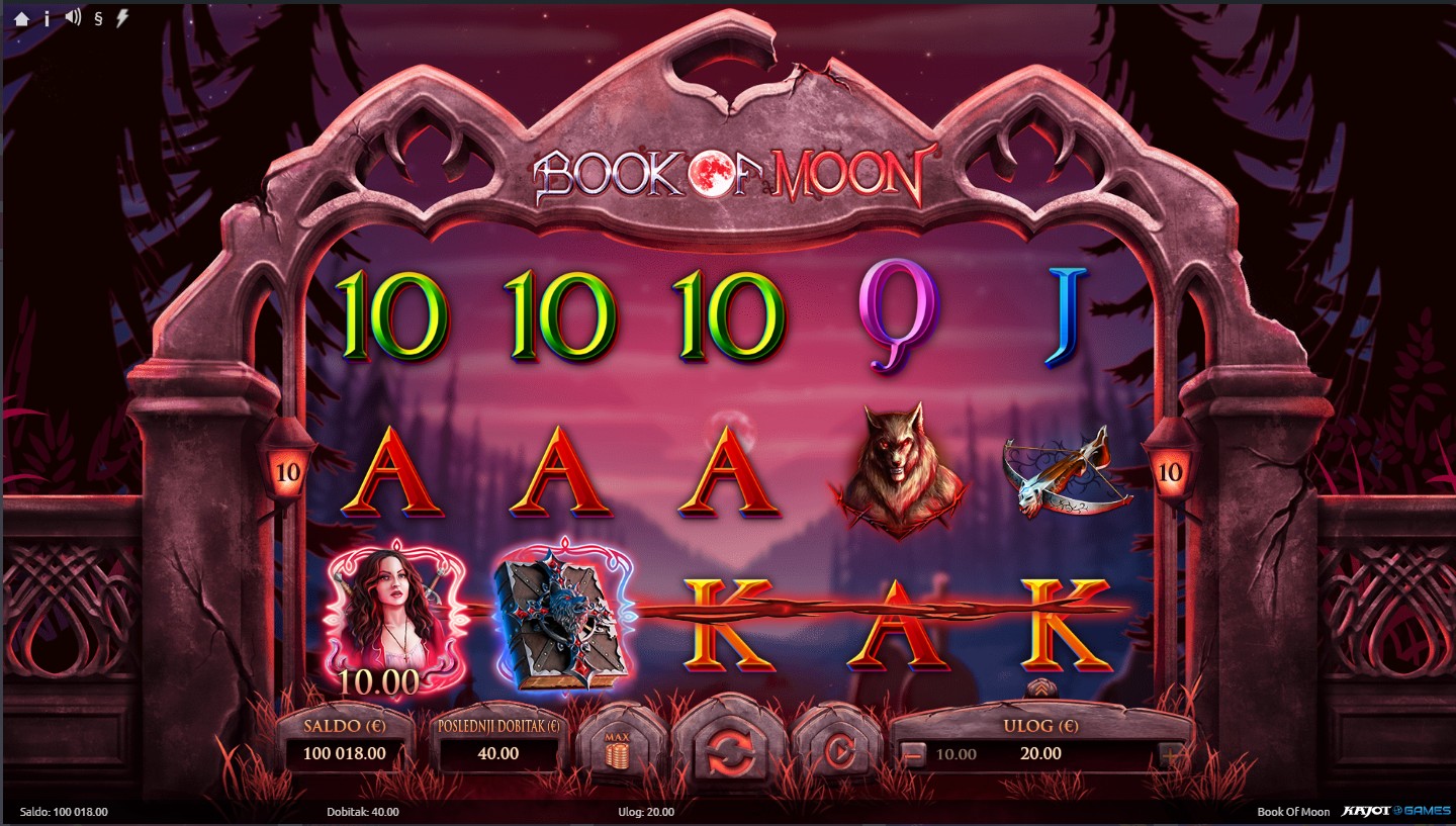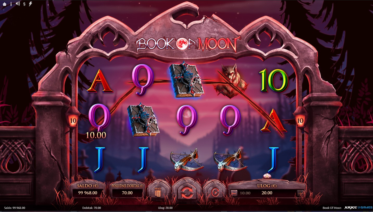 Book of Moon se igra na 5 bubnjeva s 10 isplatnih linija koje se broje s lijeva na desno. Simbol knjige djeluje kao Wild simbol, zamjenjujući sve druge simbole, ali i kao Scatter simbol koji aktivira besplatna okretanja. Kada se pojave tri ili više simbola knjige, pokreće se runda besplatnih okretanja tijekom koje se nasumično odabire jedan poseban simbol koji se može proširiti po cijelom bubnju i povećati šanse za dobitne kombinacije. Tijekom igre možeš prilagoditi iznos uloga, a cilj je složiti identične simbole na aktivnim linijama i otkriti moćne tajne Mjeseca skrivene između stranica čarobne knjige.