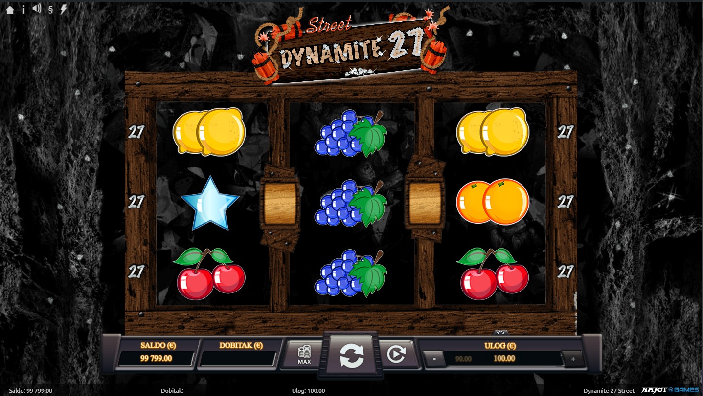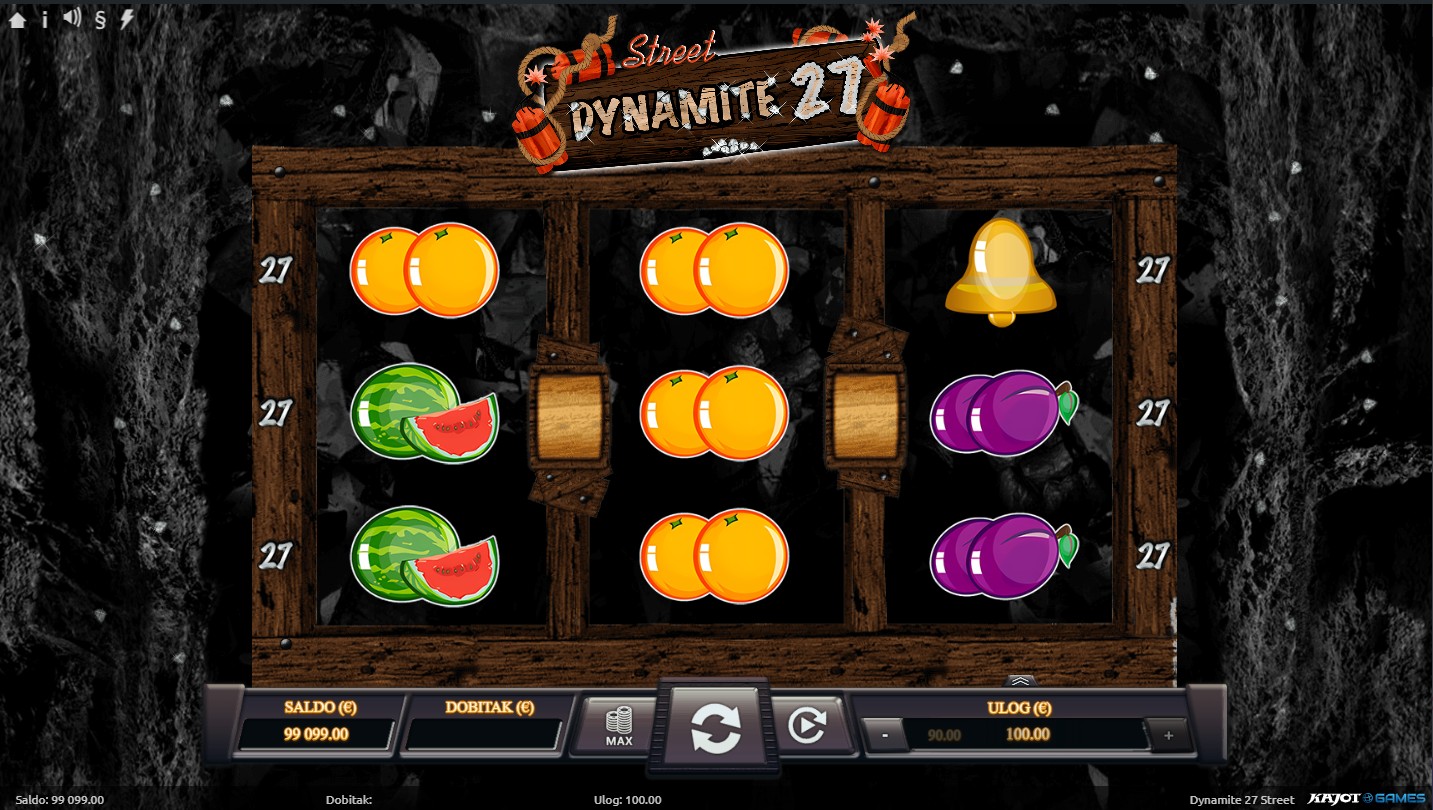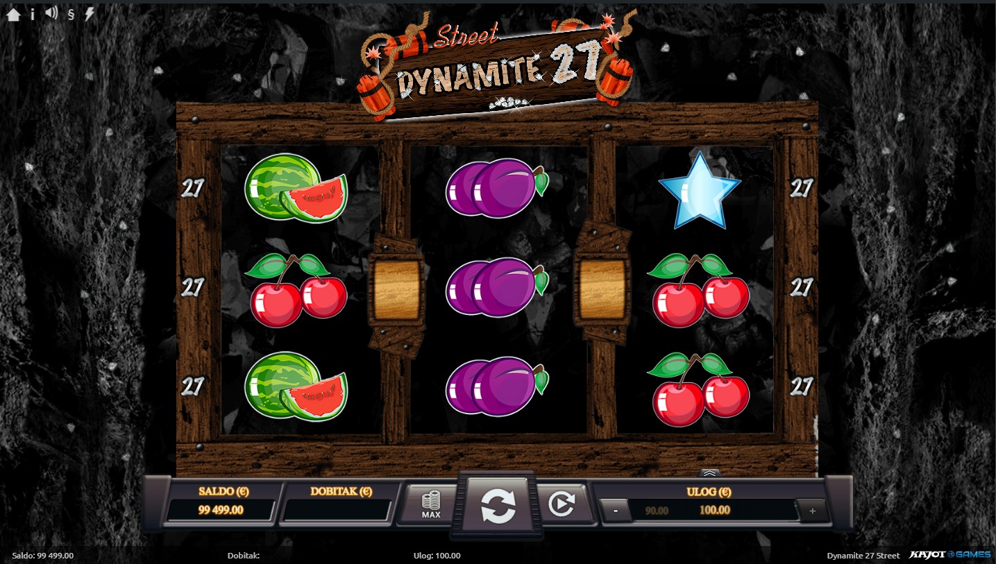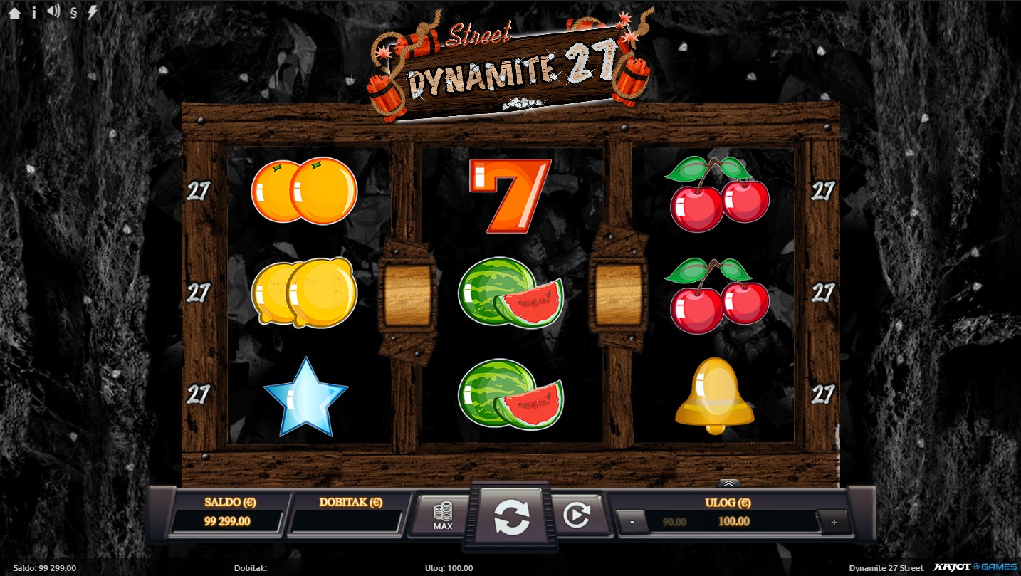 Dynamite 27 Street se igra na 3 bubnja i 27 fiksnih isplatnih linija. Dobitne kombinacije broje se s lijeva na desno, a Wild simbol zamjenjuje sve ostale simbole osim simbola bonusa. Tijekom osnovne igre mogu se aktivirati različite značajke poput dodatnih vrtnji, nasumičnih Wild simbola i bonus funkcija koje povećavaju šanse za veće dobitke. Zakorači u Dynamite 27 Street i doživi eksplozivnu igru punu akcije i uzbuđenja!