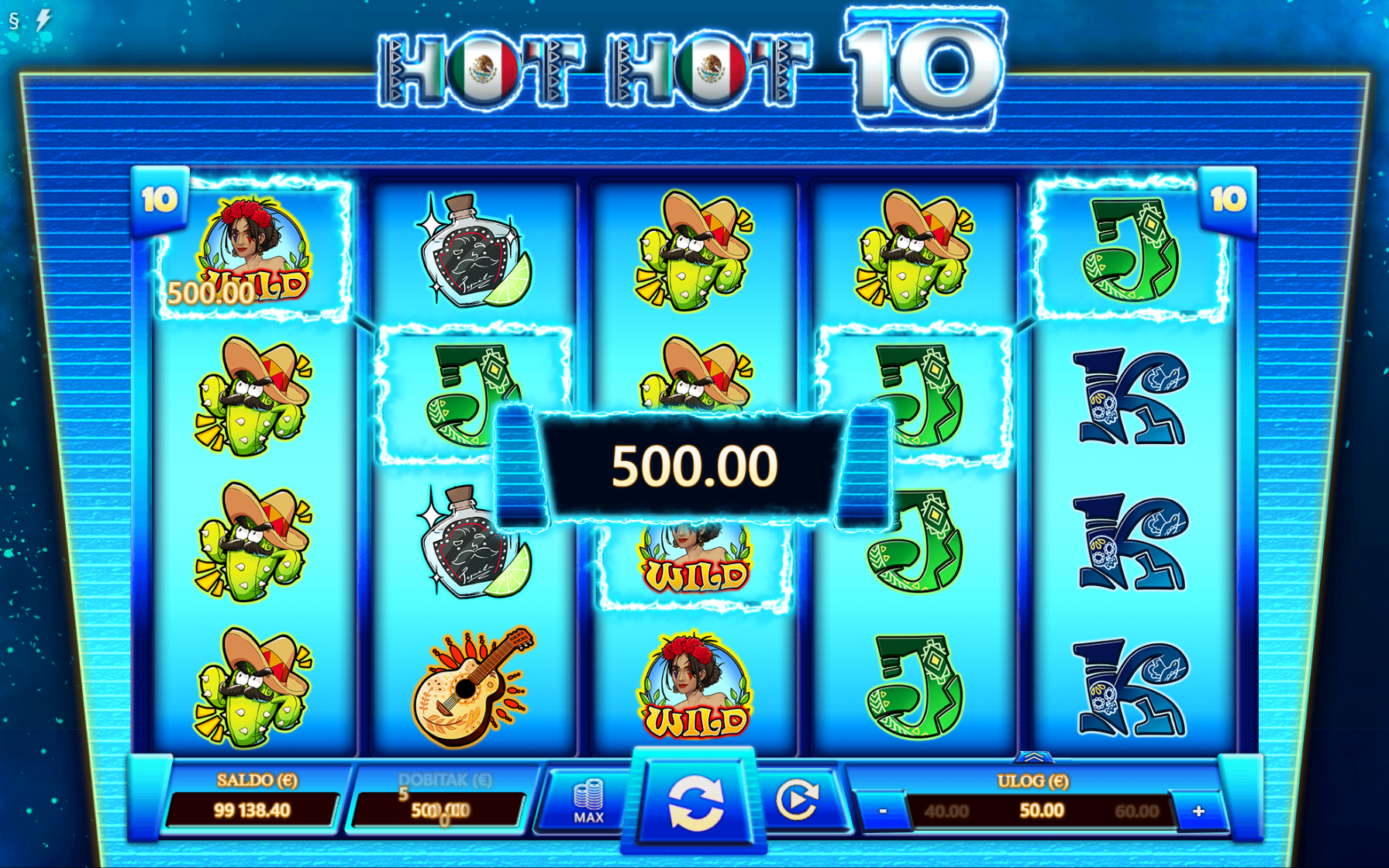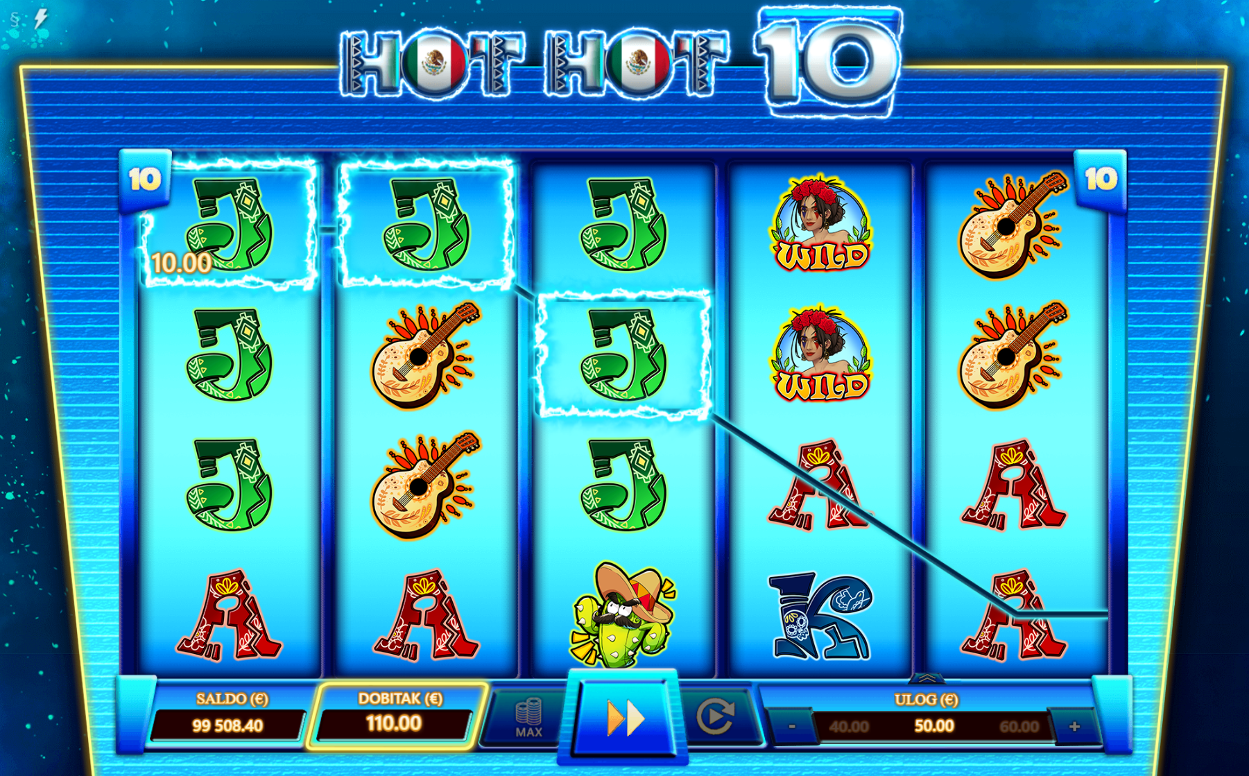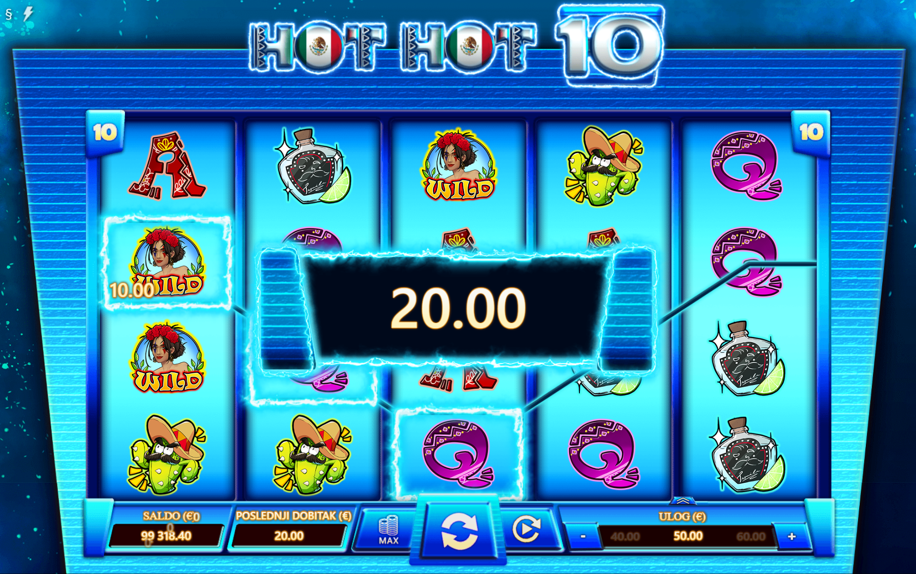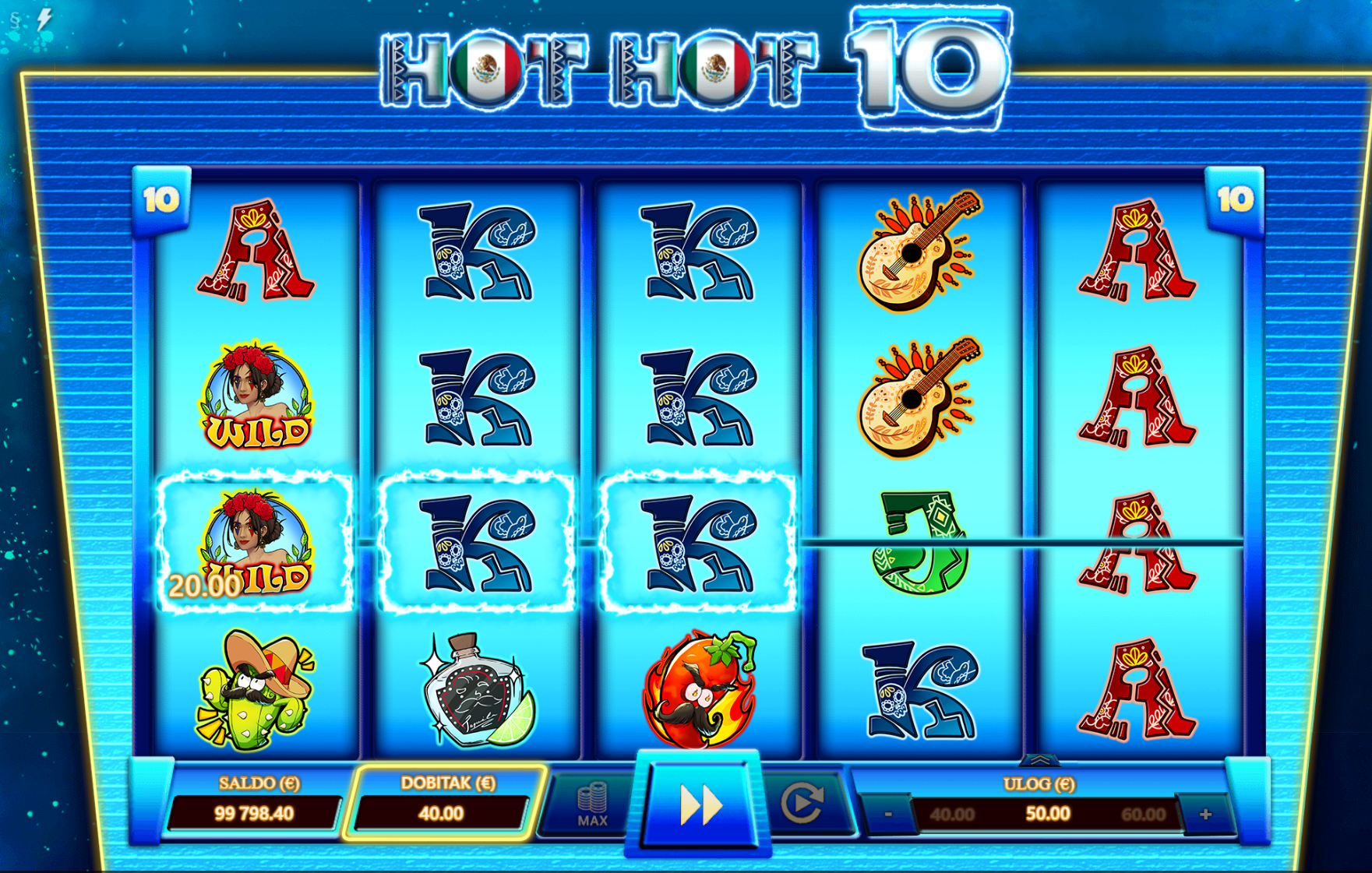 Dobrodošao u Hot Hot 10! Pred tobom je uzbudljiva avantura kroz srce Meksika na kojoj te očekuju mnoga iznenađenja, velike i bogate nagrade te ono najbitnije, puno zabave kroz igranje! Kako bi ugođaj i tvoje iskustvo igranja bili još bolji tu su pažljivo dizajnirani i ilustrirani simboli sa motivima meksičke tradicije. Jednostavan način igranja čini Hot Hot 10 igru idealnim slotom za sve igrače, a kako bi uzbuđenje uvijek ostalo na vrhuncu pobrinuti će se wild simboli koji će tvoje dobitke pretvoriti u još veće!