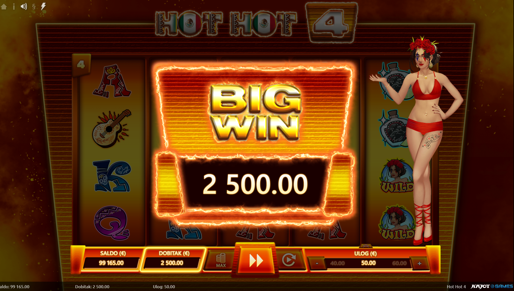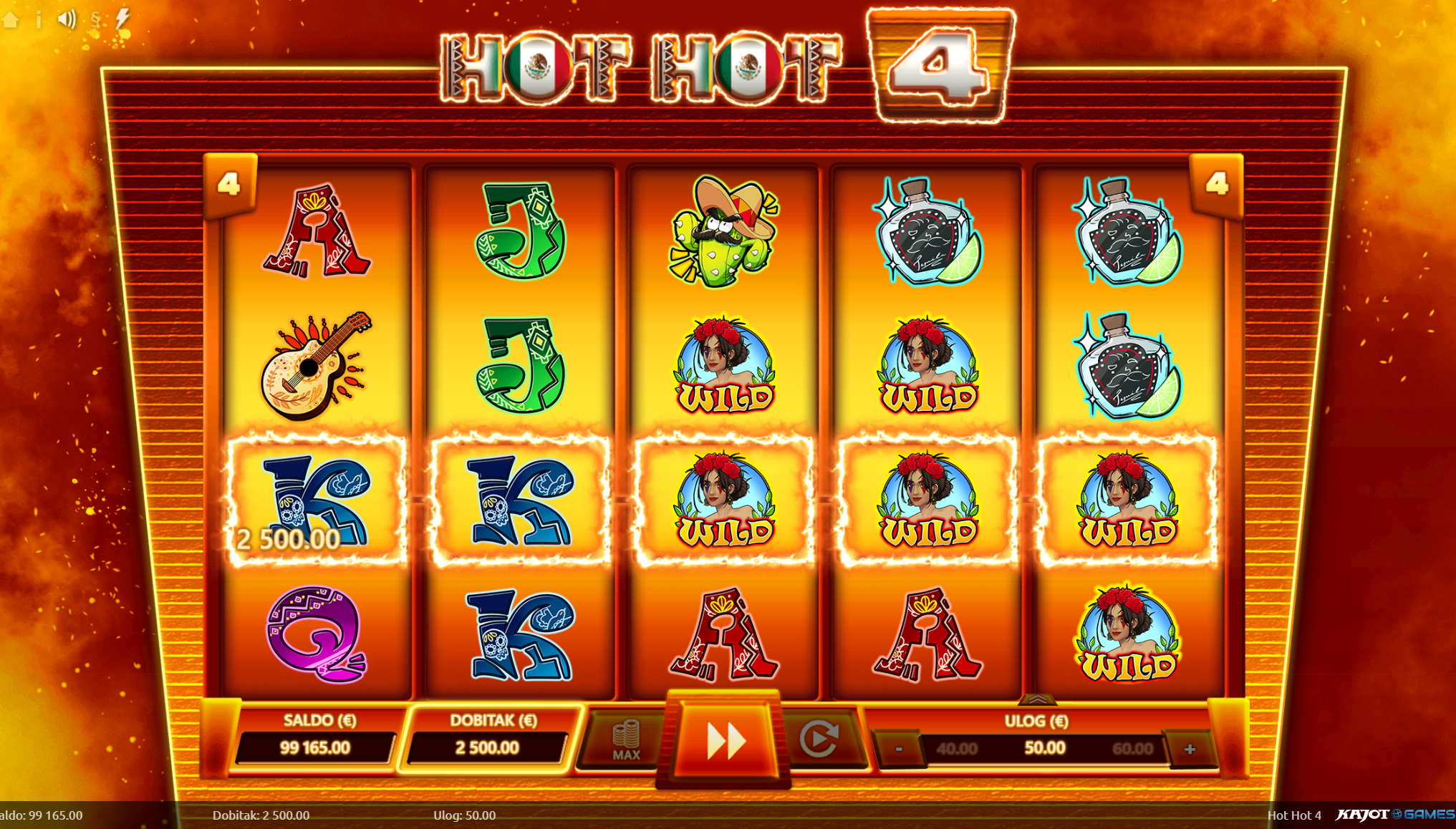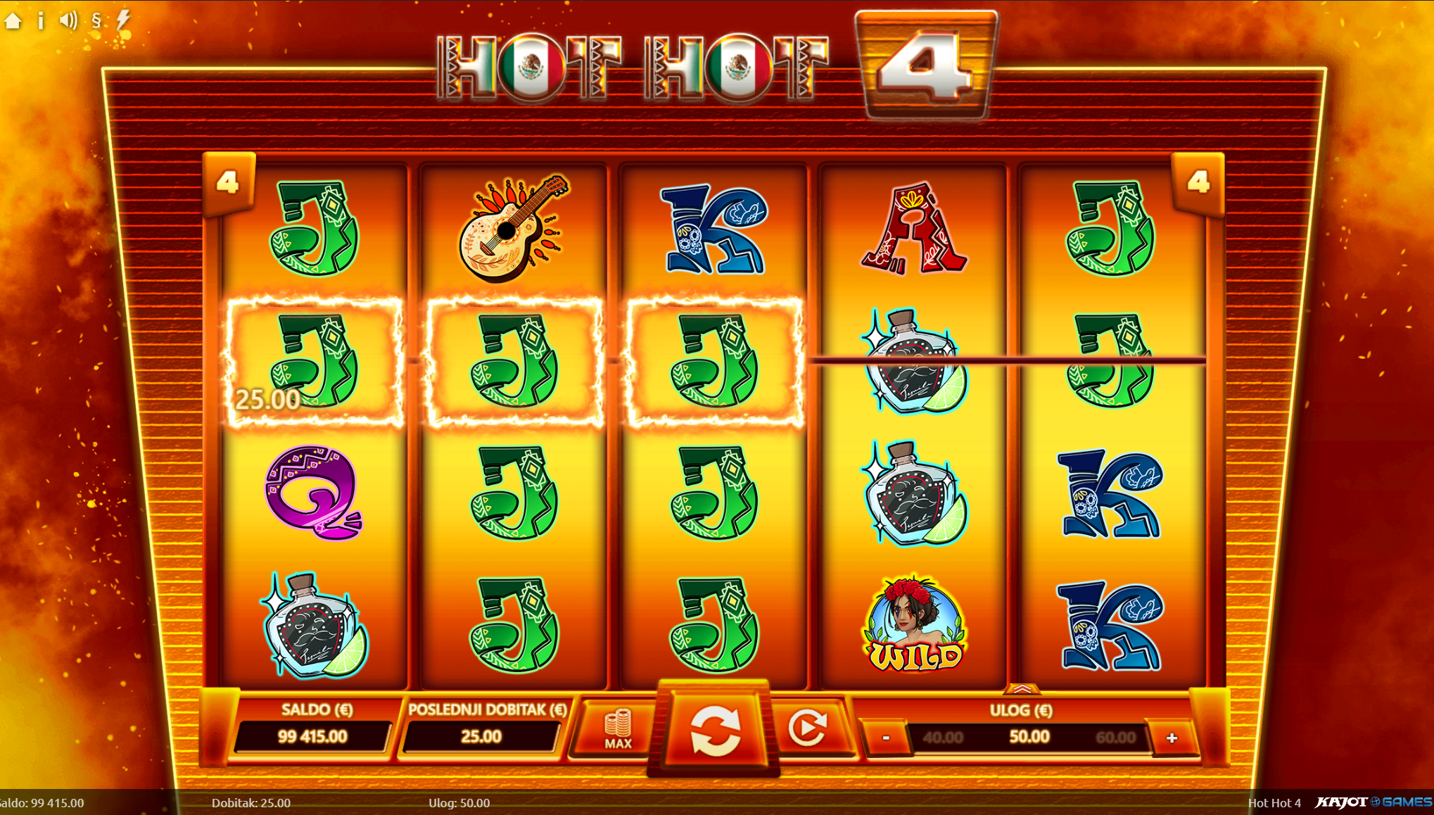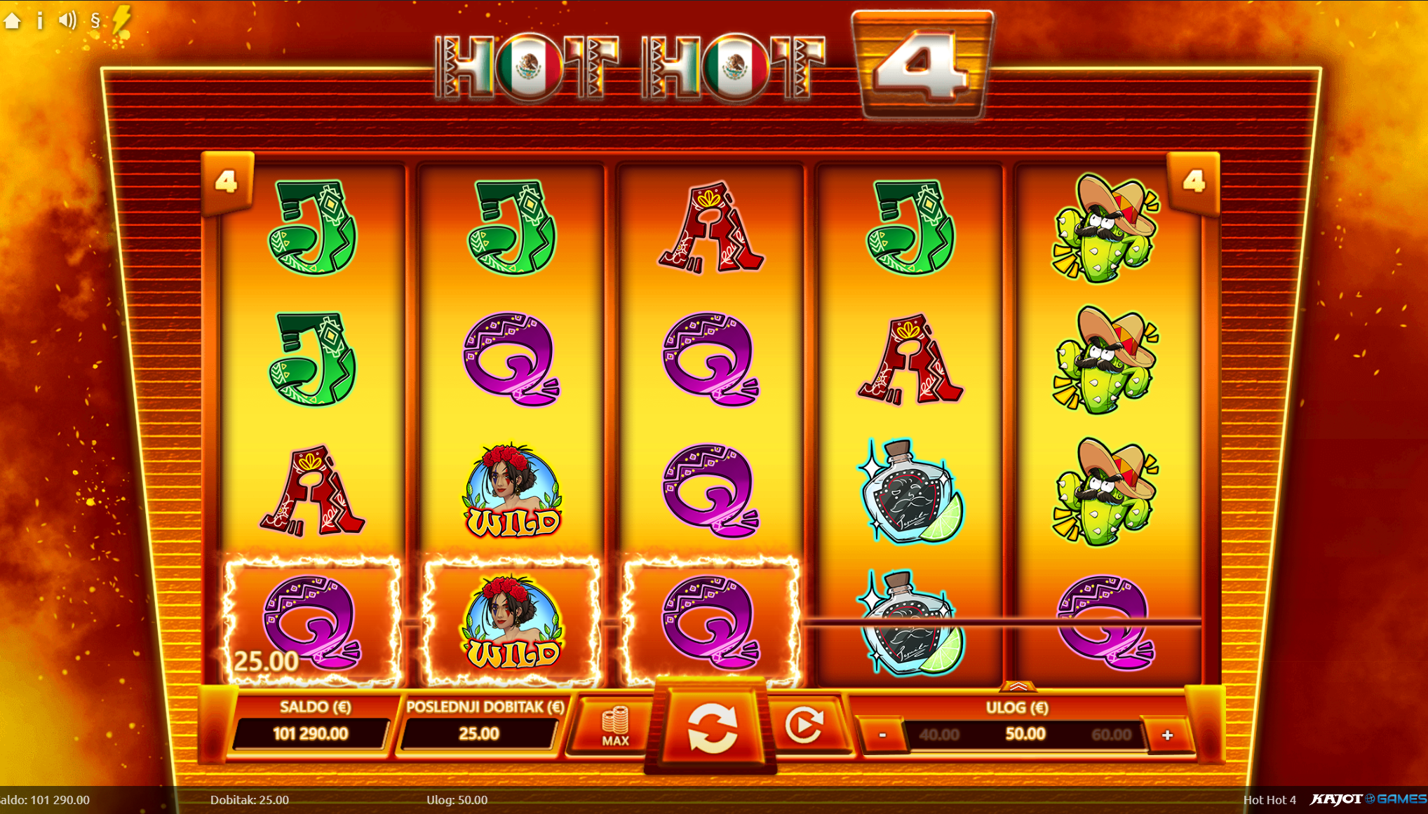 Dobrodošao u Hot Hot 4! Pred tobom je uzbudljiva avantura kroz srce Meksika na kojoj te očekuju mnoga iznenađenja, velike i bogate nagrade te ono najbitnije, puno zabave kroz igranje! Kako bi ugođaj i tvoje iskustvo igranja bili još bolji tu su pažljivo dizajnirani i ilustrirani simboli sa motivima meksičke tradicije. Jednostavan način igranja čini Hot Hot 4 igru idealnim slotom za sve igrače, a kako bi uzbuđenje uvijek ostalo na vrhuncu pobrinuti će se wild simboli koji će tvoje dobitke pretvoriti u još veće!