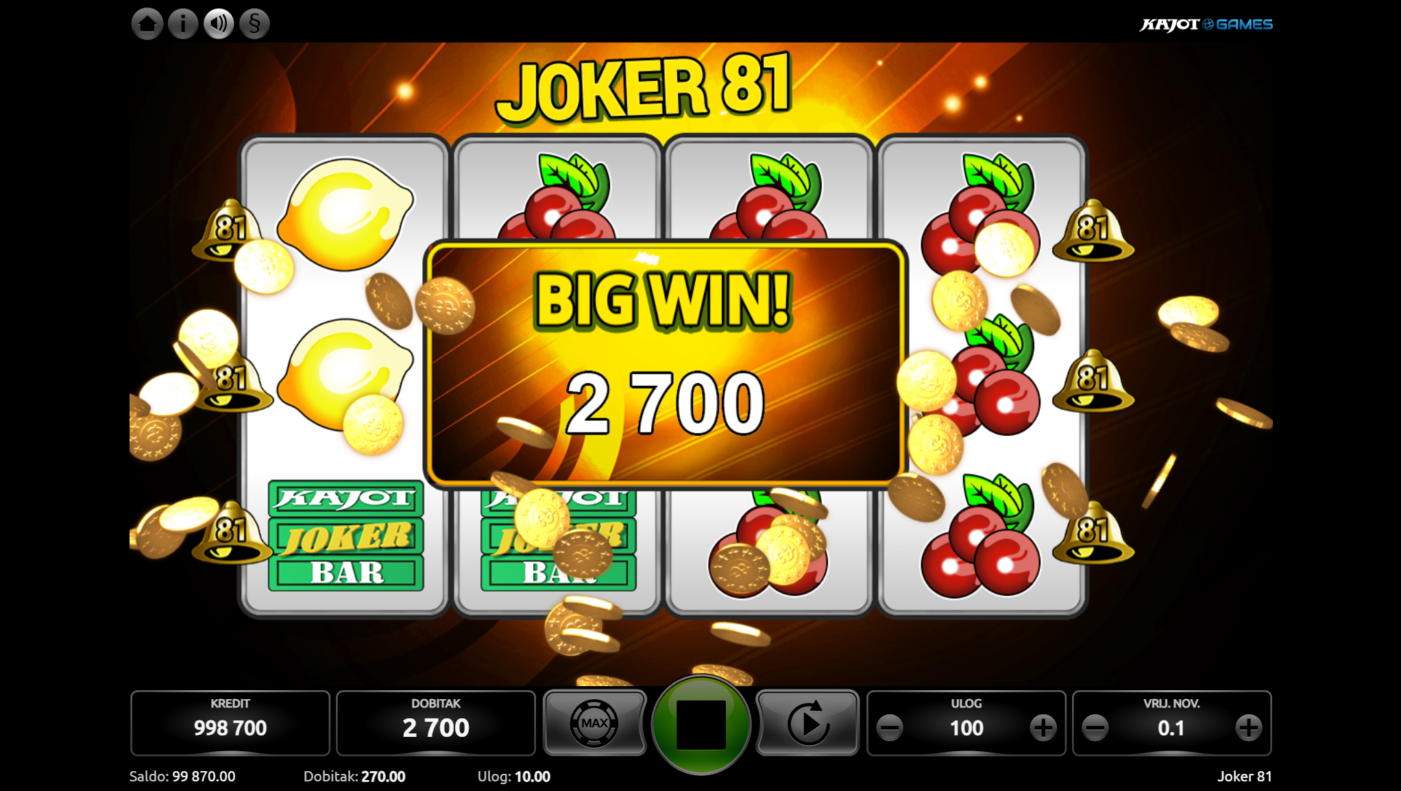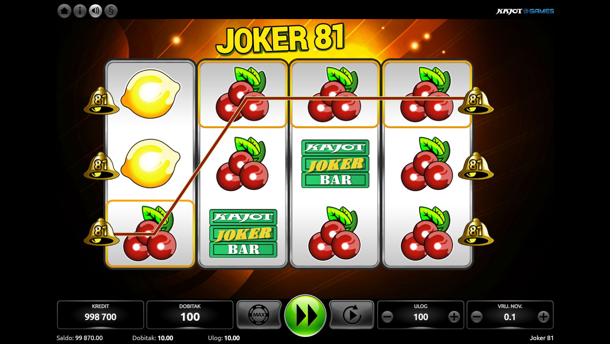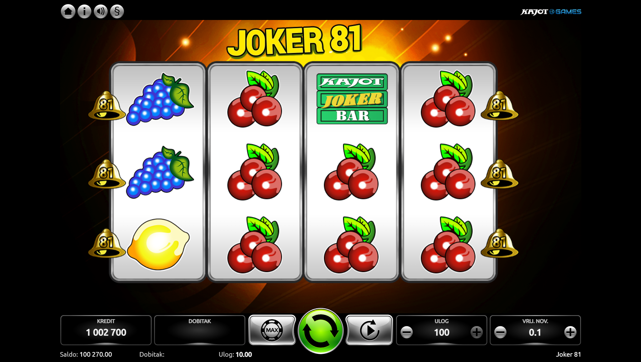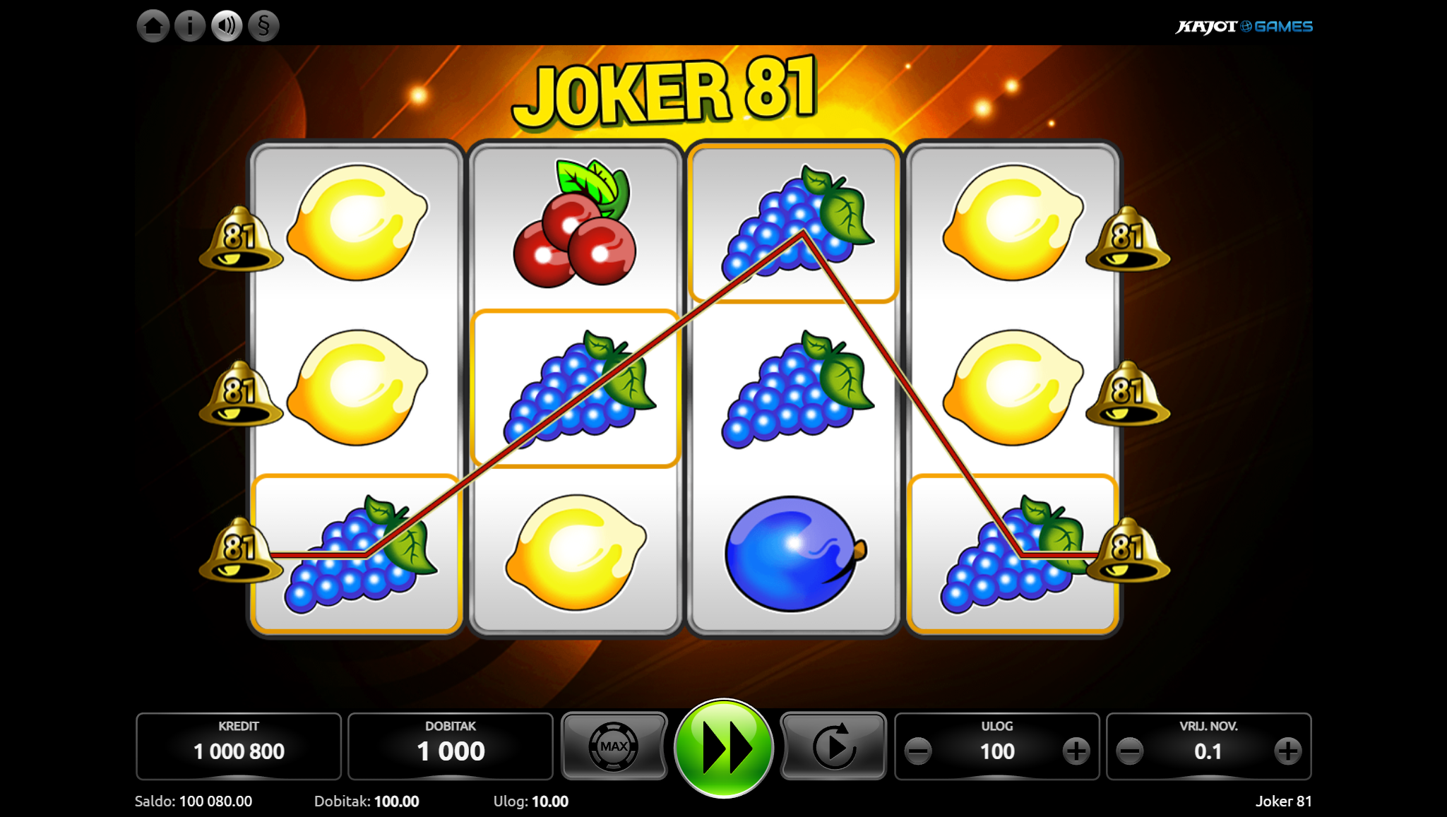 Dobrodošao u Joker 81, zabavnu avanturu inspiriranu gomilom sočnog voća i tajanstvenih jokera koji će ti uz nezaboravno igranje donjeti i velike dobitke! Primamljivo ilustrirano voće jednostavnog dizajna, kao i način igranja učiniti će dozu zabave i zanimacije nedostižnom! Kako uzbuđenju tu nebi bio kraj, pobrinuti će se joker simbol i igranje pretvoriti u super uzbudljivo te bogato po pitanju dobitaka! Kao jedan od najpopularnijih slotova, Joker 81 odličan je izbor za sve igrače koji vole izvrstan omjer rizika i dobitaka.