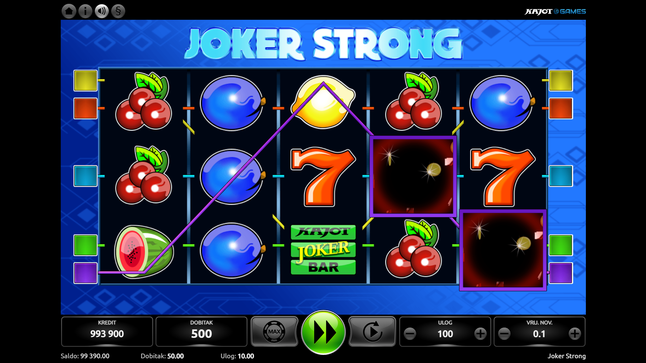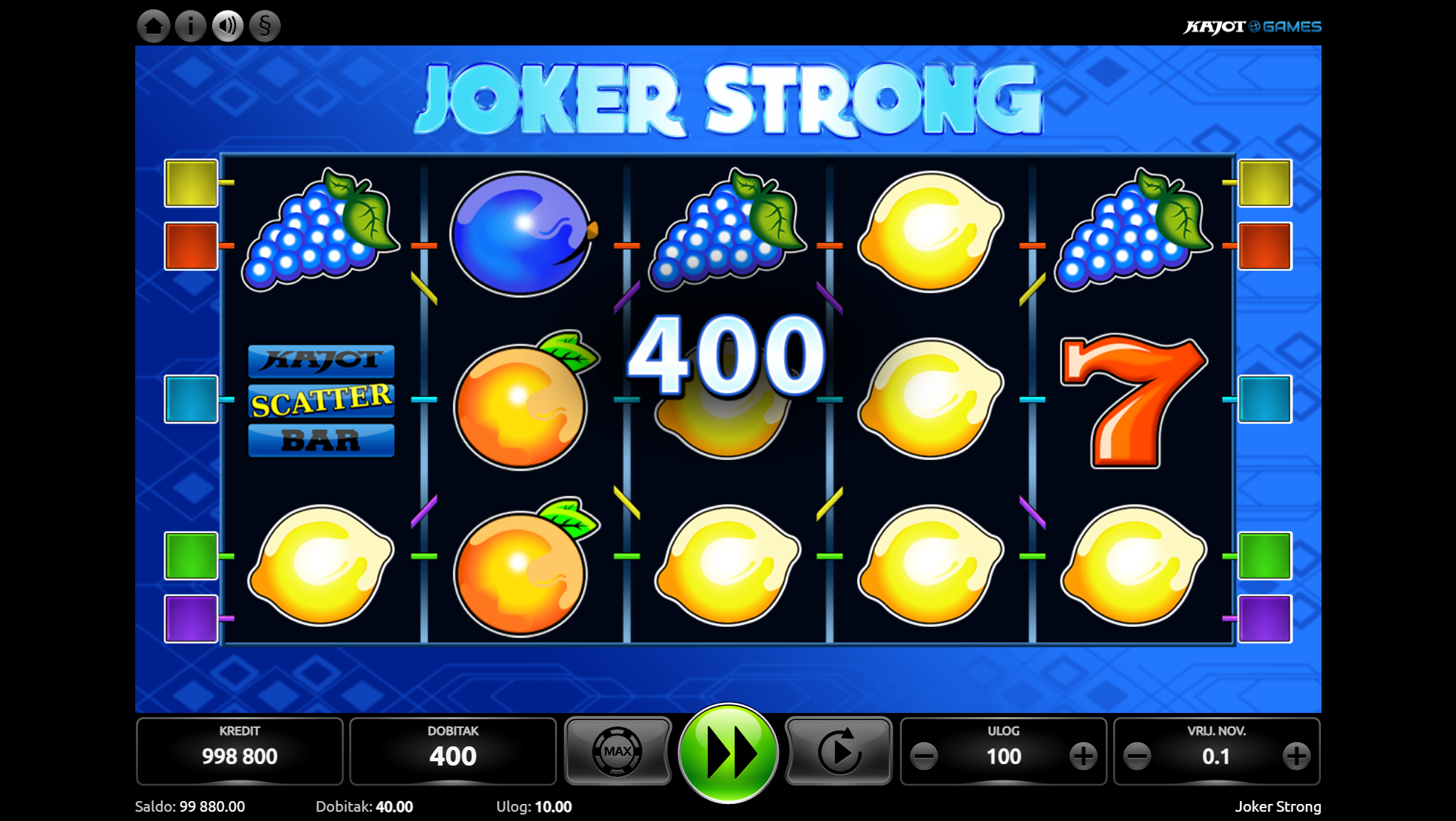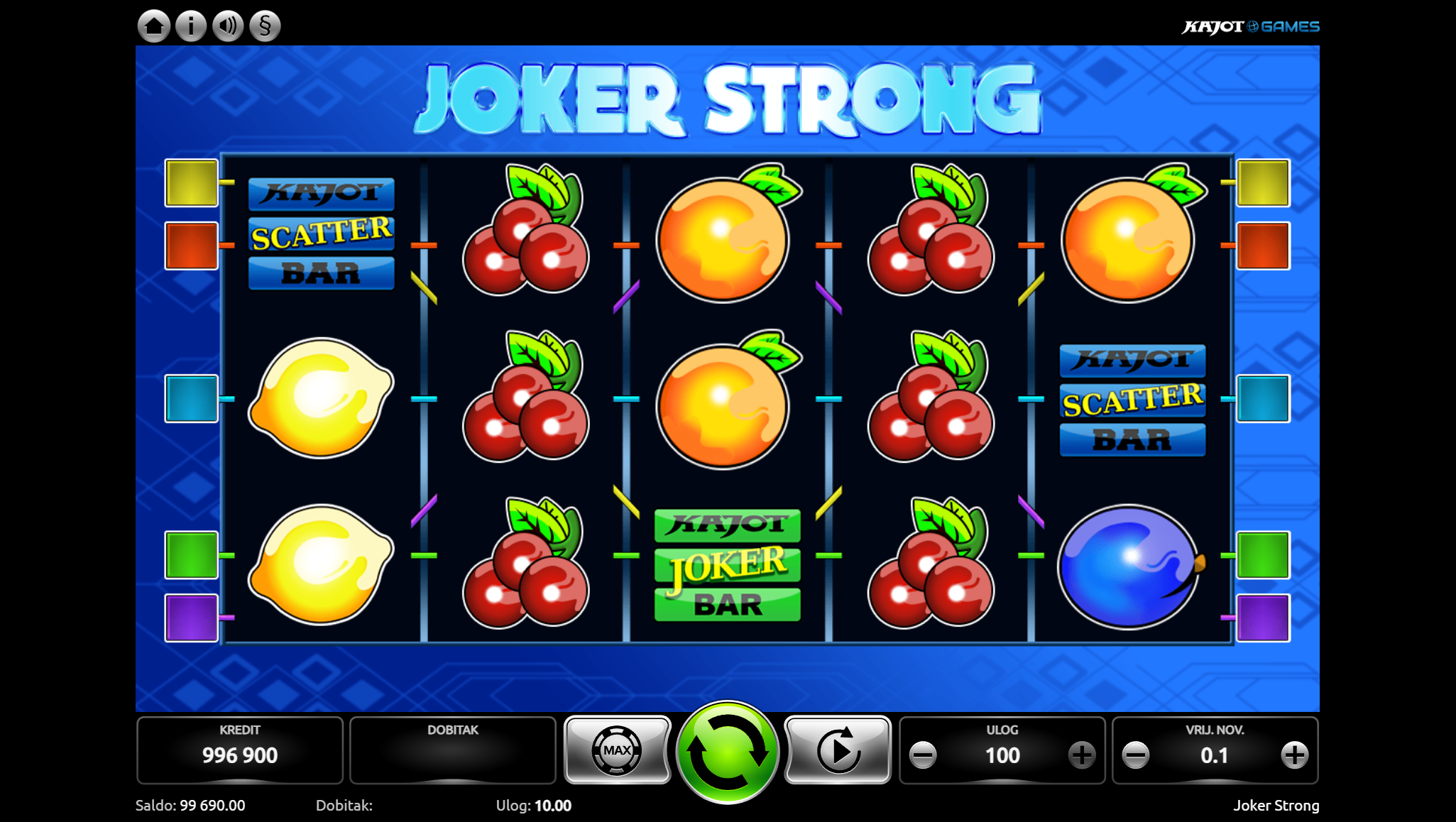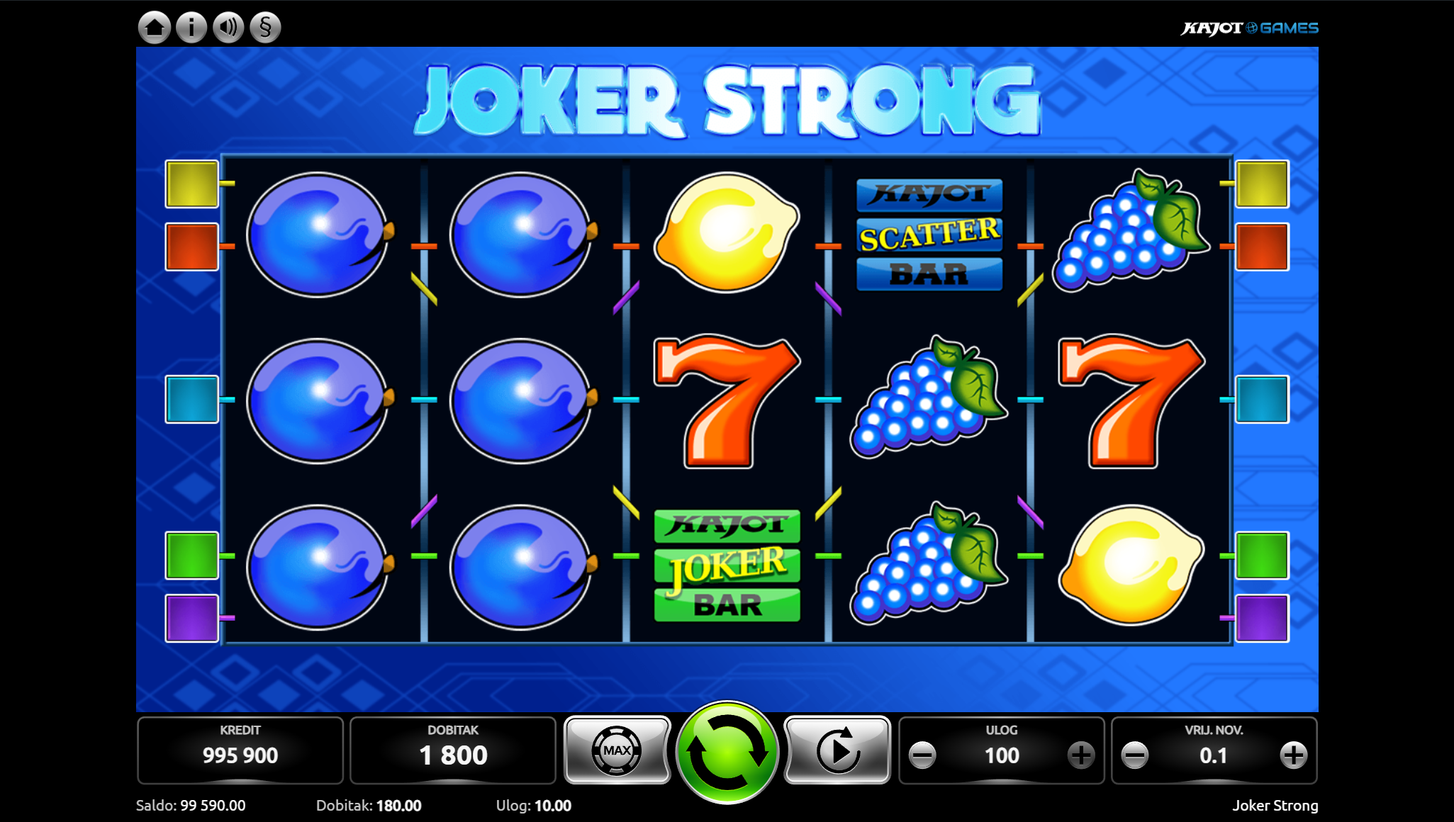 Dobrodošao u Joker Strong, zabavnu avanturu inspiriranu gomilom sočnog voća i tajanstvenih jokera koji će ti uz nezaboravno igranje donjeti i velike dobitke! Primamljivo ilustrirano voće jednostavnog dizajna, kao i način igranja učiniti će dozu zabave i zanimacije nedostižnom! Kako uzbuđenju tu nebi bio kraj, pobrinuti će se joker simbol i igranje pretvoriti u super uzbudljivo te bogato po pitanju dobitaka! Kao jedan od najpopularnijih slotova, Joker Strong odličan je izbor za sve igrače koji vole izvrstan omjer rizika i dobitaka.