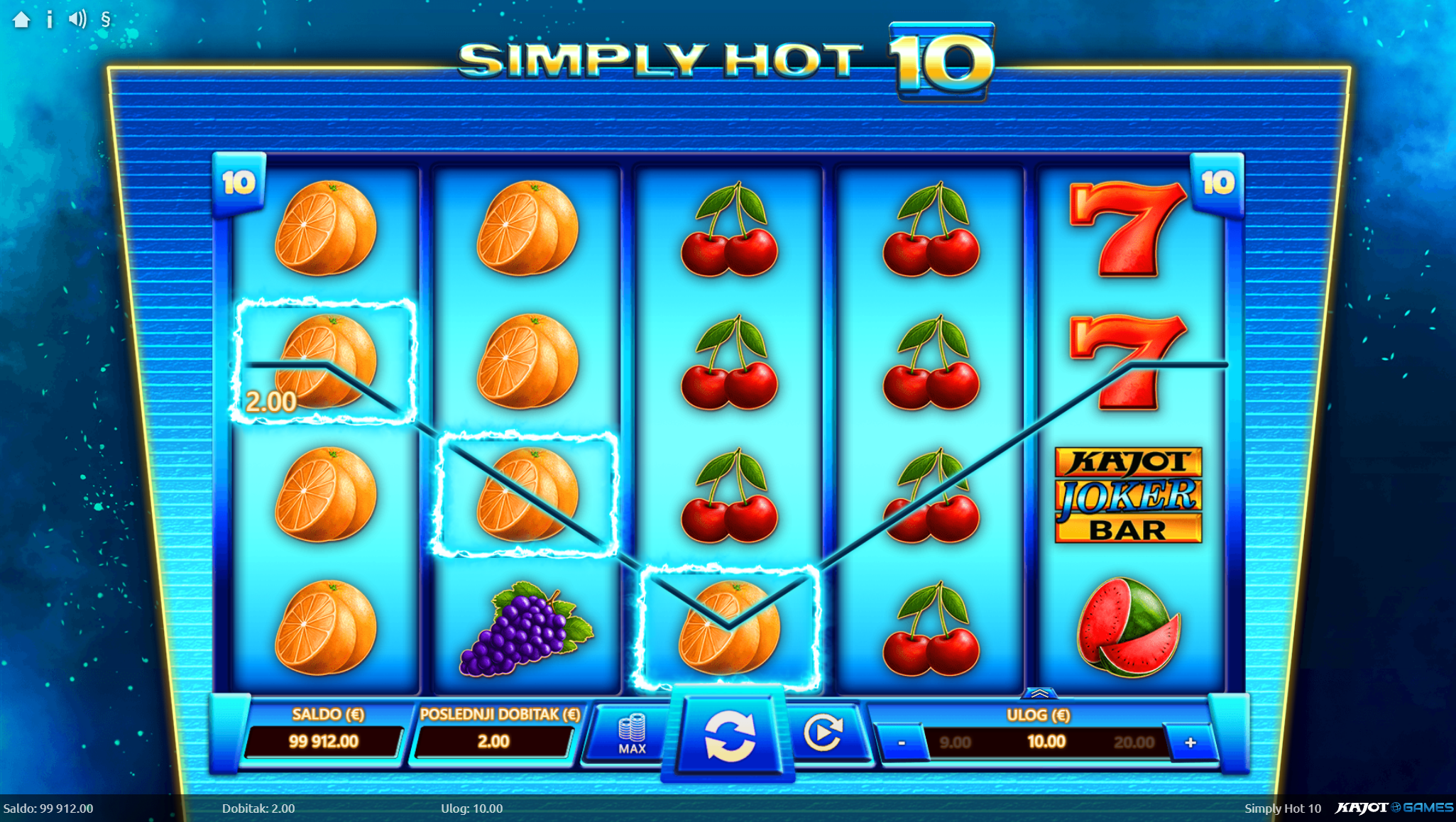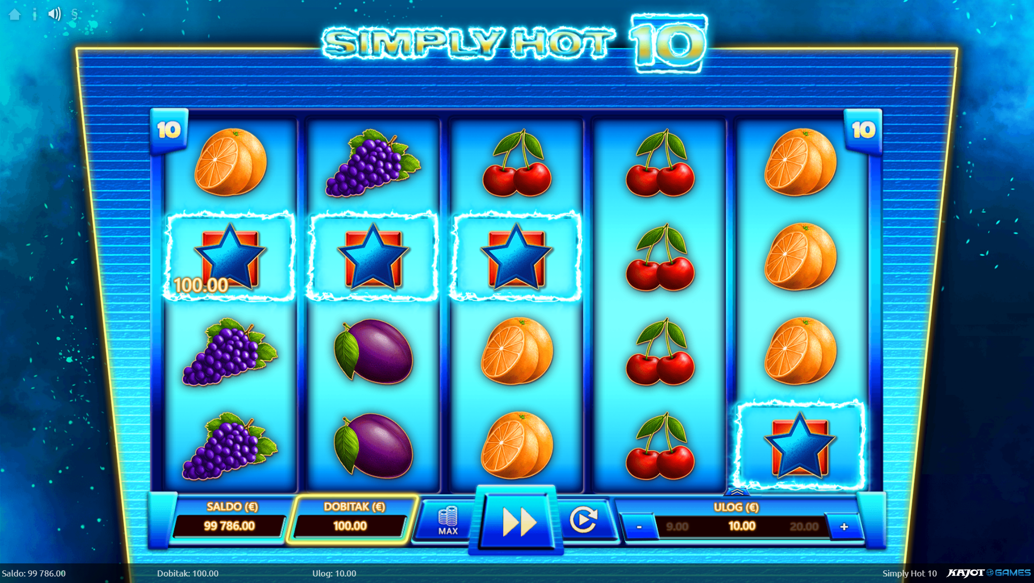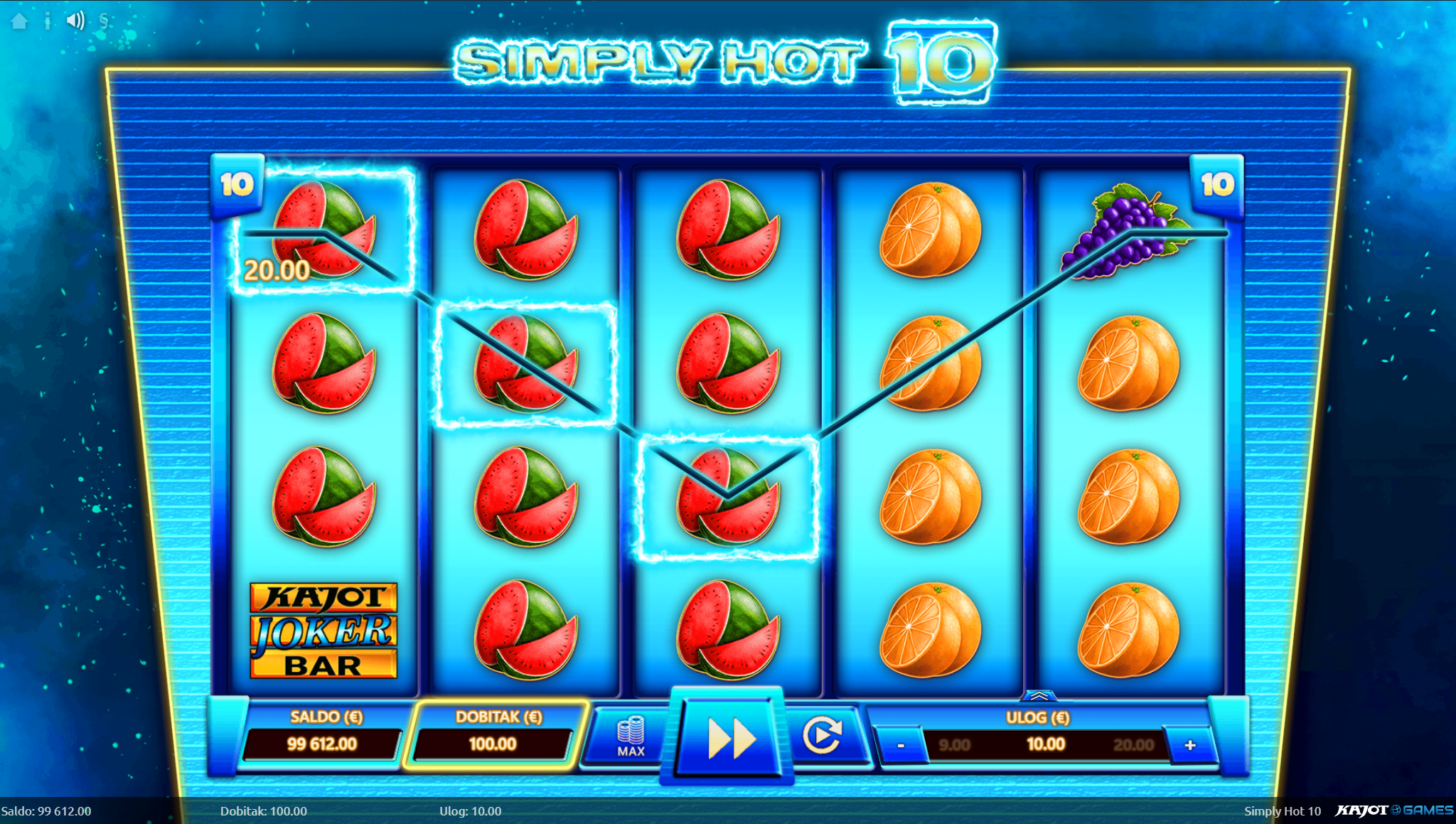 Ljubitelj si klasičnih i jednostavnih voćih slotova? Na pravom si mjestu jer Simply Hot 10 pruža sve to, a i mnogo više. Primamljivo ilustrirano voće jednostavnog dizajna, kao i način igranja učiniti će dozu zabave i zanimacije nedostižnom! Kako uzbuđenju tu nebi bio kraj, pobrinuti će se joker simbol i igranje pretvoriti u super uzbudljivo te bogato po pitanju dobitaka! Kao jedan od najpopularnijih slotova, Simply Hot 10 odličan je izbor za sve igrače koji vole izvrstan omjer rizika i dobitaka.
