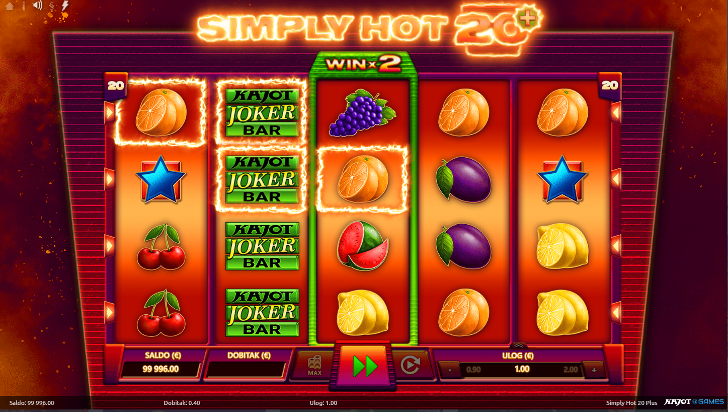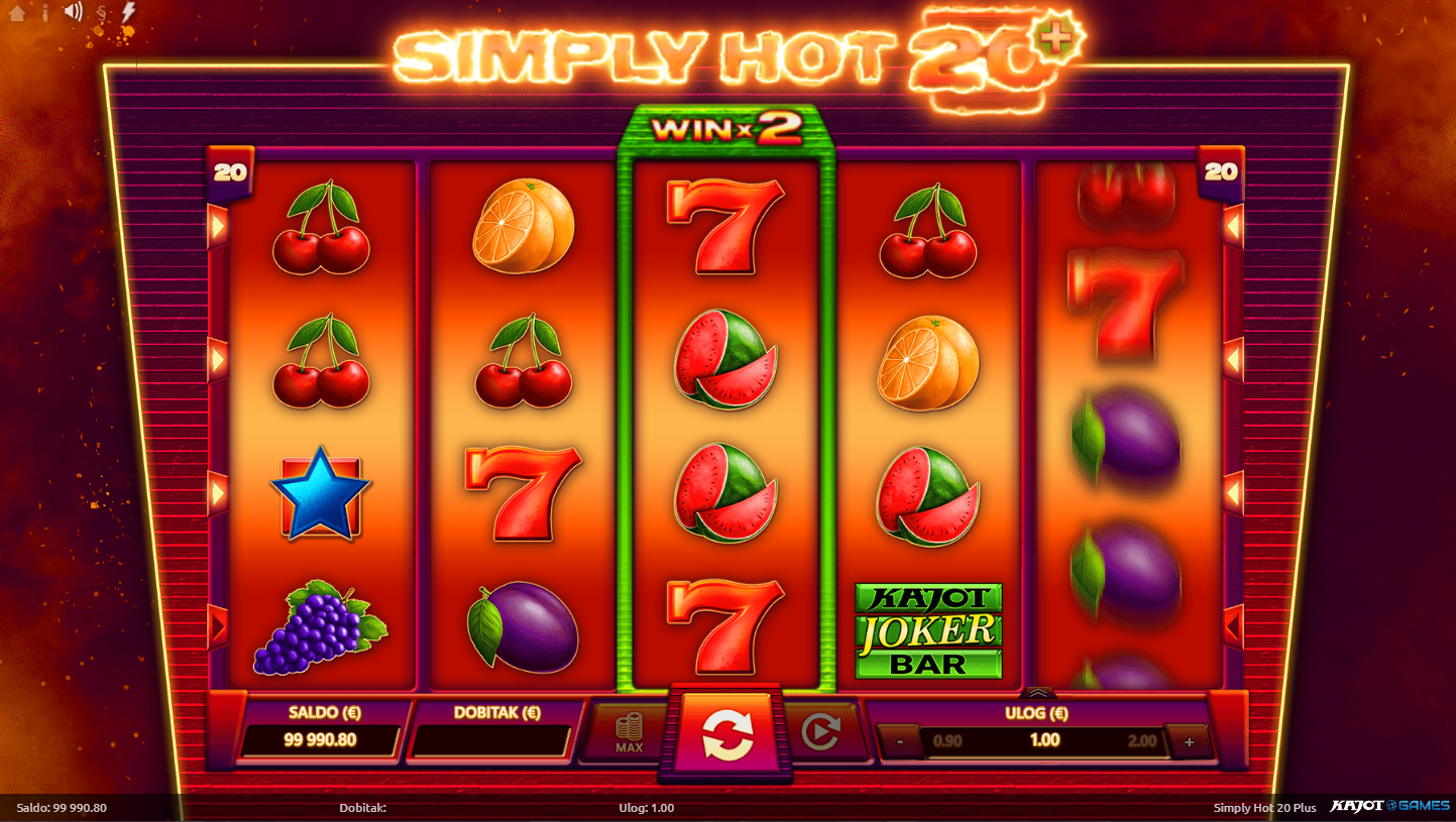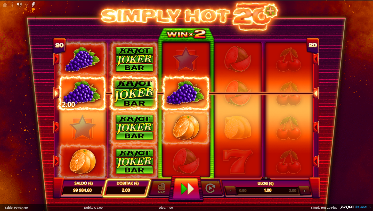 Uđi u igru, odaberi svoj ulog i pusti da valjci zapale ekran! Kajot Joker Bar djeluje kao Expanding Wild koji se širi preko cijelog valjka i množi dobitke s x2 ako se pojavi na sredini. Tu je i Scatter Zvijezda: tri ili više njih donose poseban Scatter dobitak, bez obzira na položaj. S 20 dobitnih linija, svaka vrtnja ima potencijal da postane vatrena eksplozija sreće!