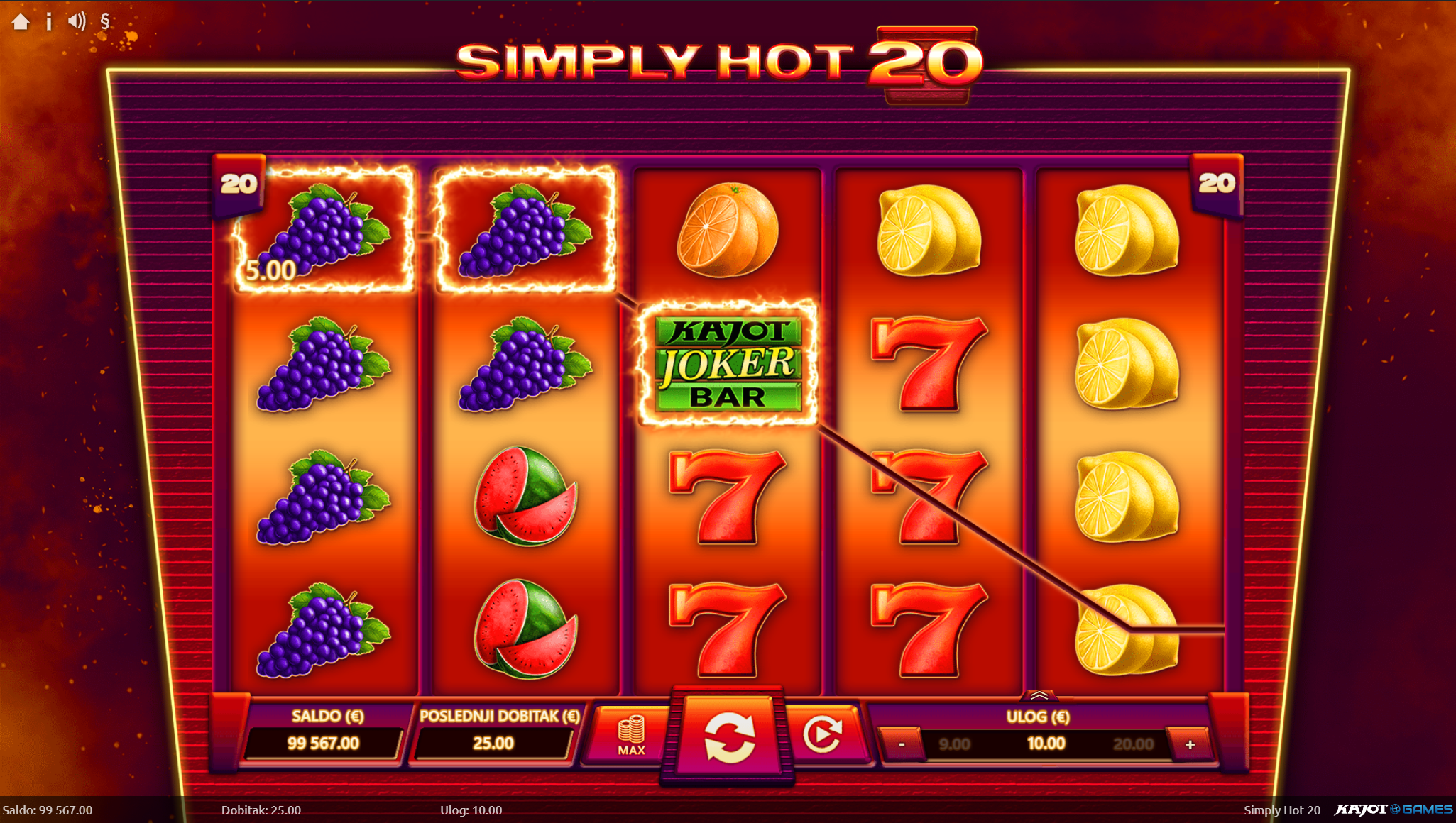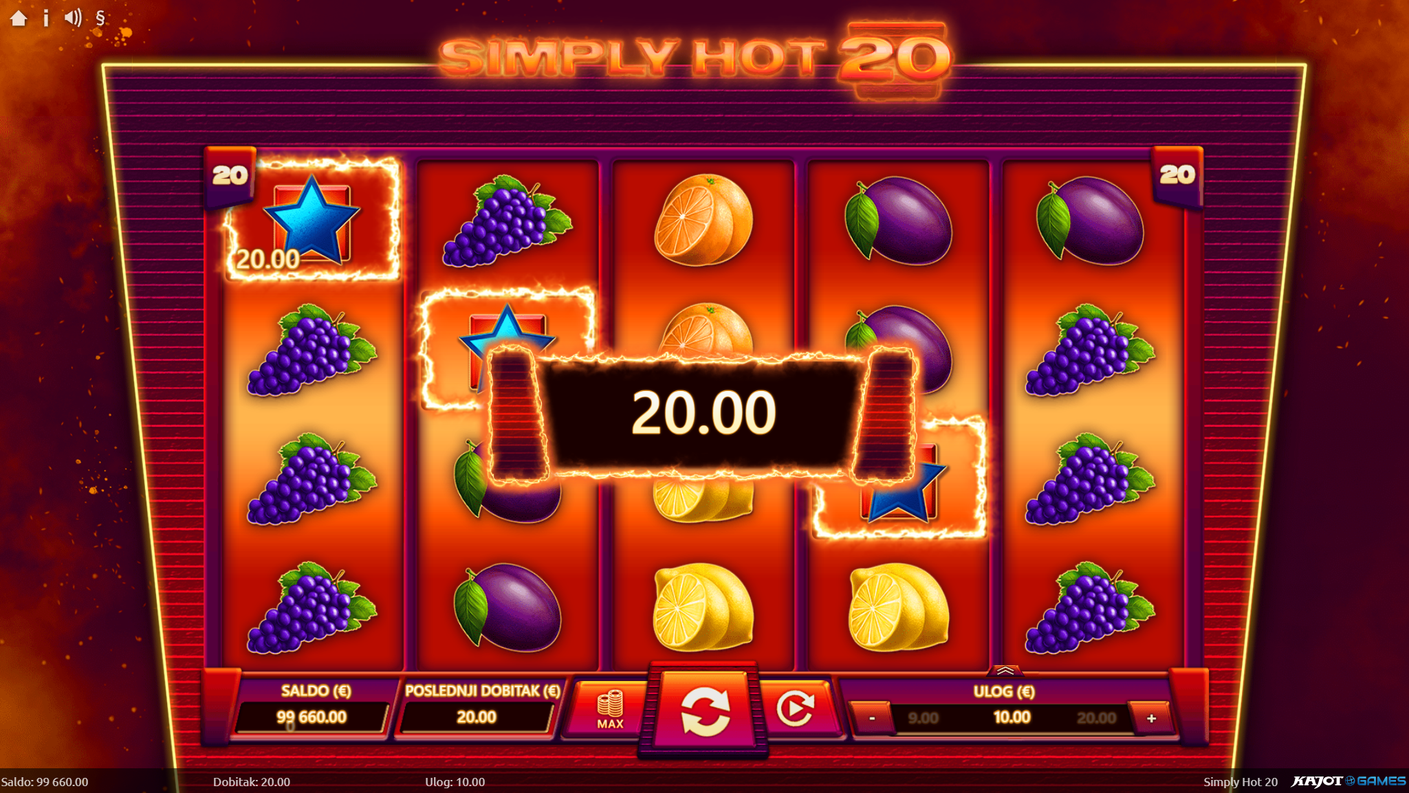 Ljubitelj si klasičnih i jednostavnih voćih slotova? Na pravom si mjestu jer Simply Hot 20 pruža sve to, a i mnogo više. Primamljivo ilustrirano voće jednostavnog dizajna, kao i način igranja učiniti će dozu zabave i zanimacije nedostižnom! Kako uzbuđenju tu nebi bio kraj, pobrinuti će se joker simbol i igranje pretvoriti u super uzbudljivo te bogato po pitanju dobitaka! Kao jedan od najpopularnijih slotova, Simply Hot 20 odličan je izbor za sve igrače koji vole izvrstan omjer rizika i dobitaka.