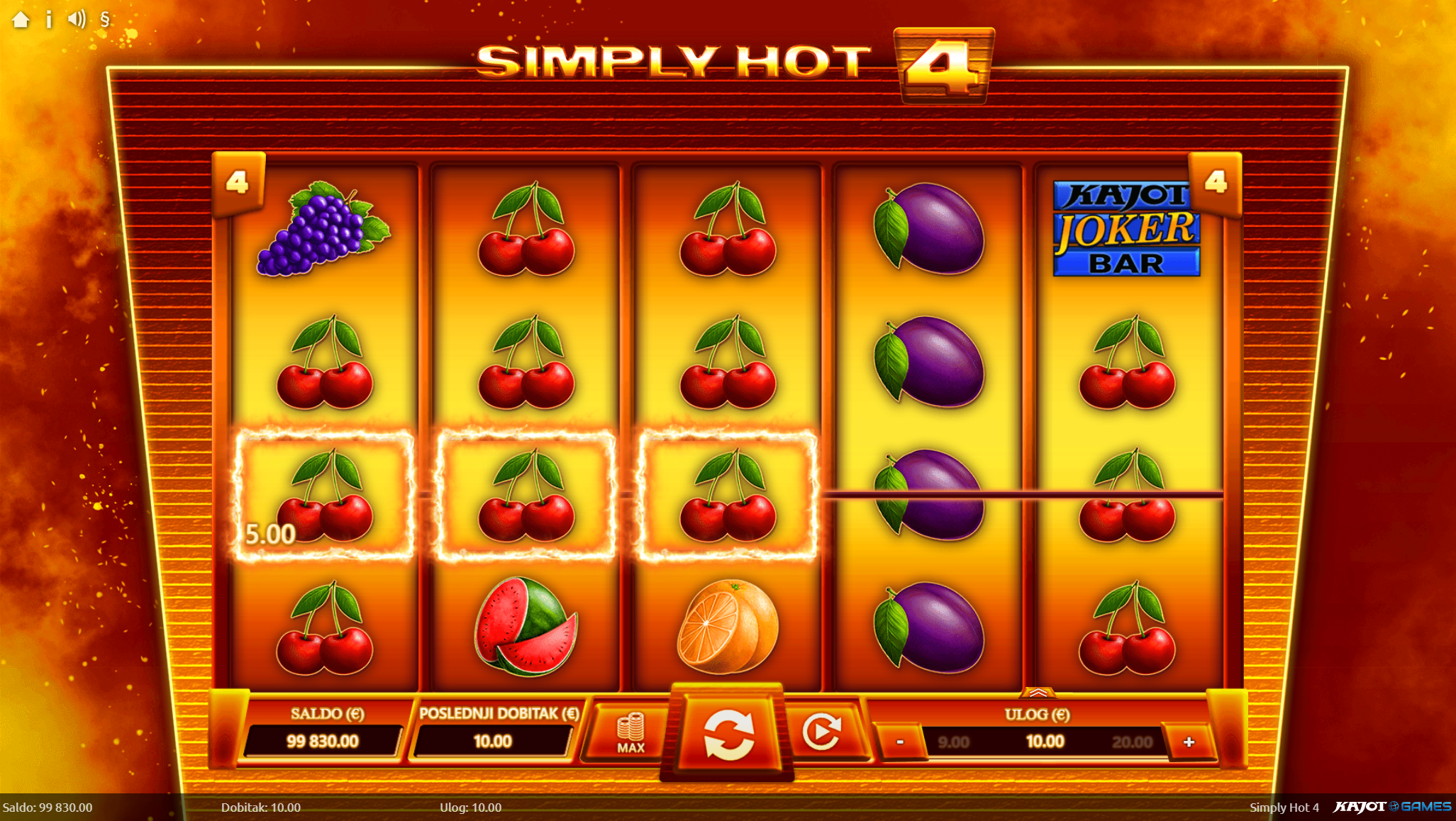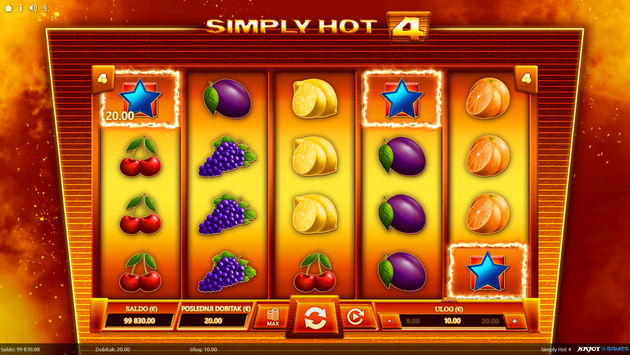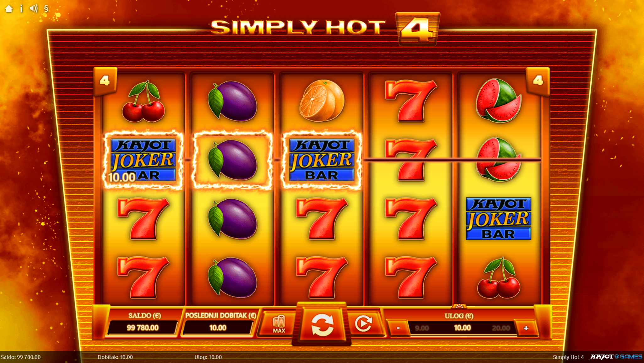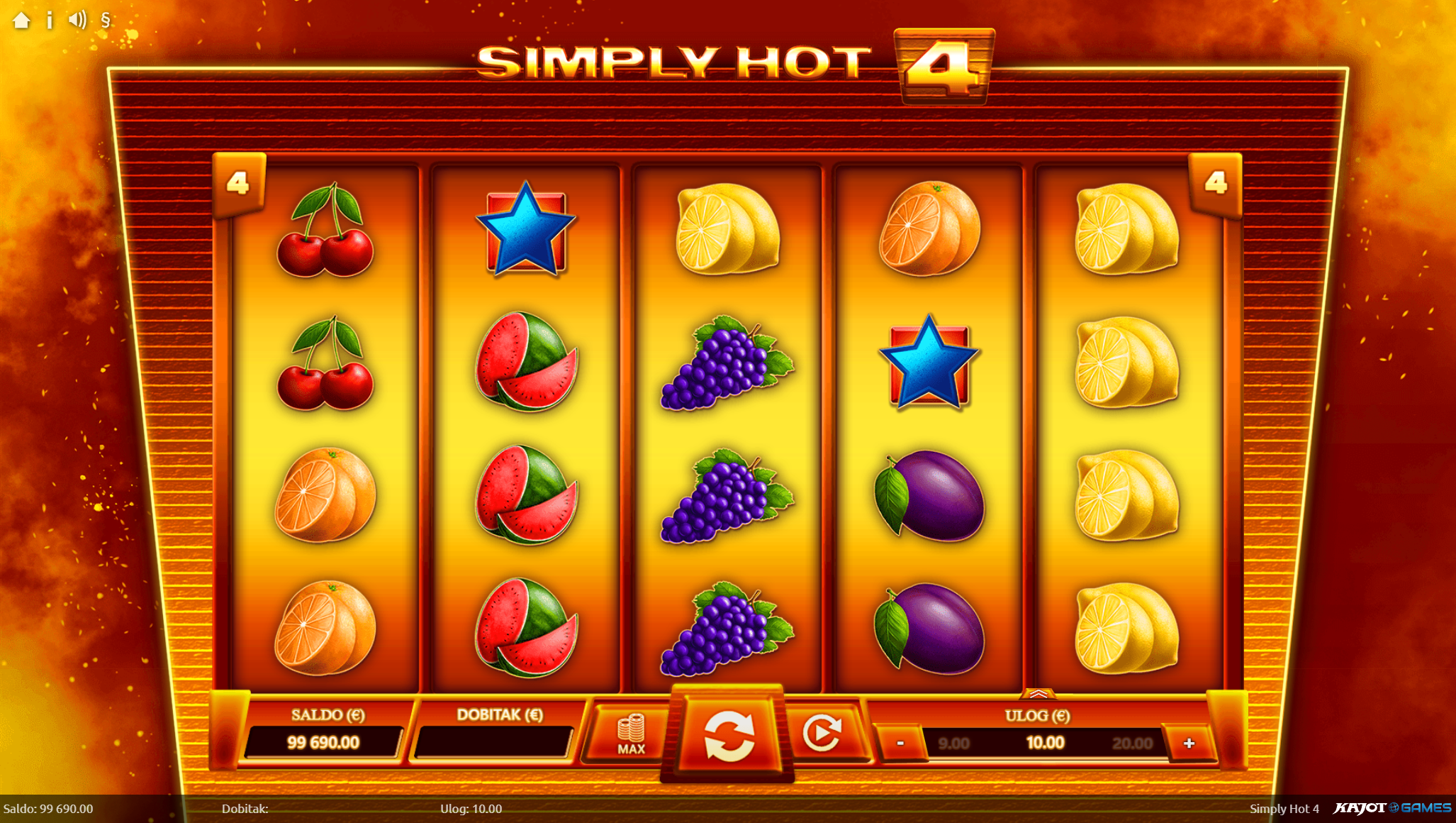 Ljubitelj si klasičnih i jednostavnih voćih slotova? Na pravom si mjestu jer Simply Hot 4 pruža sve to, a i mnogo više. Primamljivo ilustrirano voće jednostavnog dizajna, kao i način igranja učiniti će dozu zabave i zanimacije nedostižnom! Kako uzbuđenju tu nebi bio kraj, pobrinuti će se joker simbol i igranje pretvoriti u super uzbudljivo te bogato po pitanju dobitaka! Kao jedan od najpopularnijih slotova, Simply Hot 4 odličan je izbor za sve igrače koji vole izvrstan omjer rizika i dobitaka.