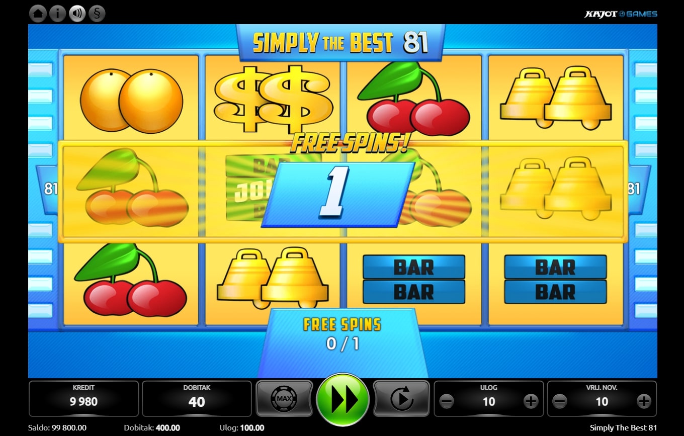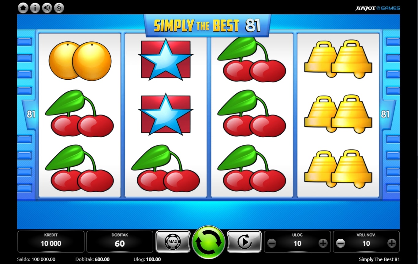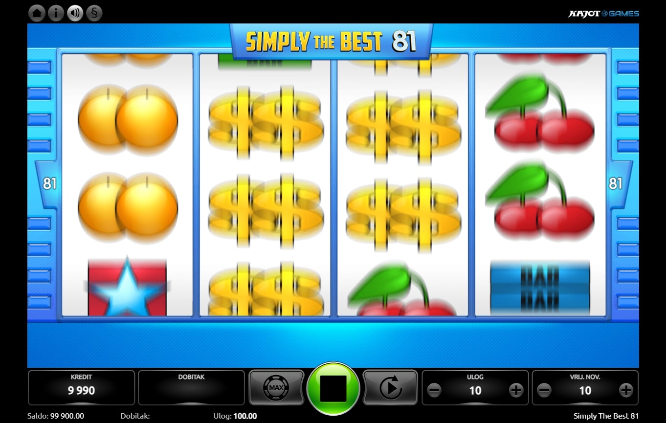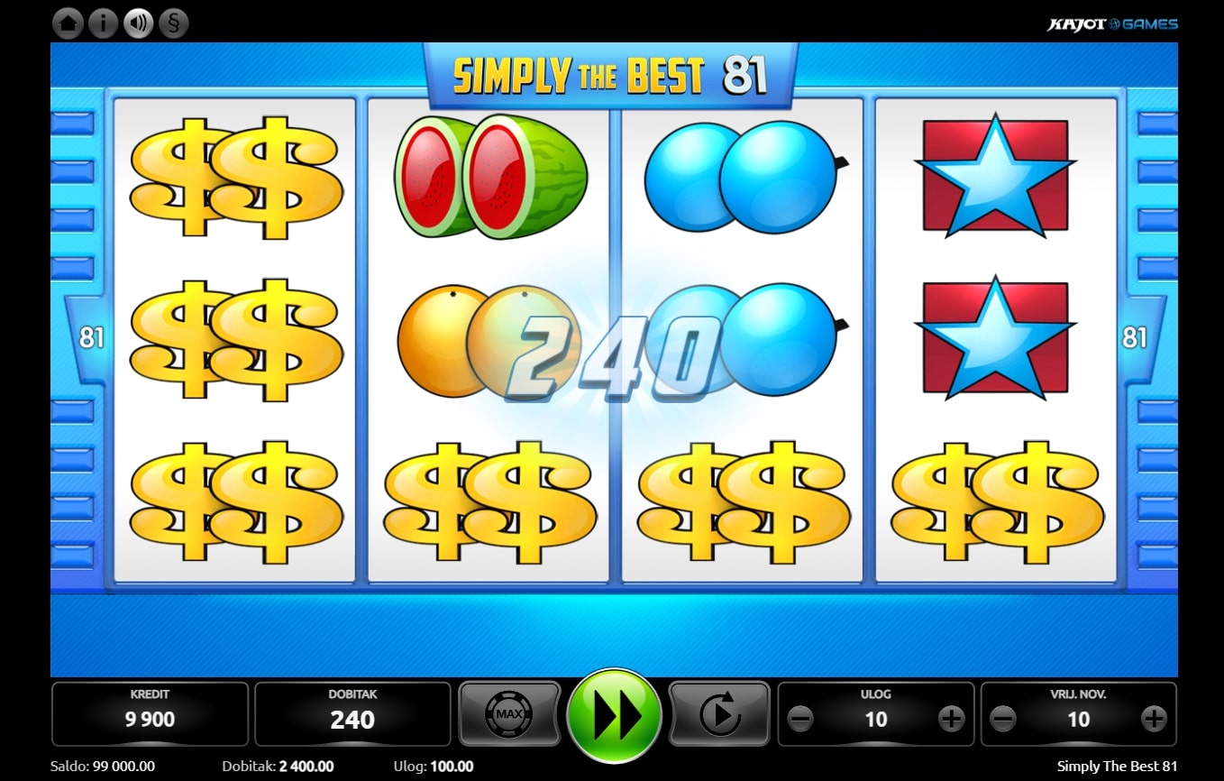 Simply The Best 81 klasična je slot igra inspirirana retro igrama na sreću koja miješa svijet voća i zlata vrijednih dobitaka. Najviše isplaćuju poluge, zvijezde i lubenice, a igra također sadrži posebnu Joker polugu koja mijenja druge simbole u potrazi za dobitnim linijama. S druge strane, besplatne vrtnje ostvaruju se nizanjem simbola na srednjoj dobitnoj liniji. Zaigraj Simply The Best 81 te osvoji fantastične nagrade!