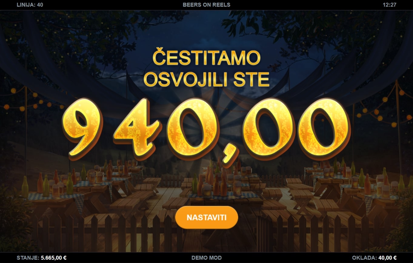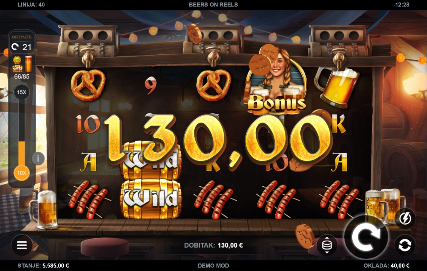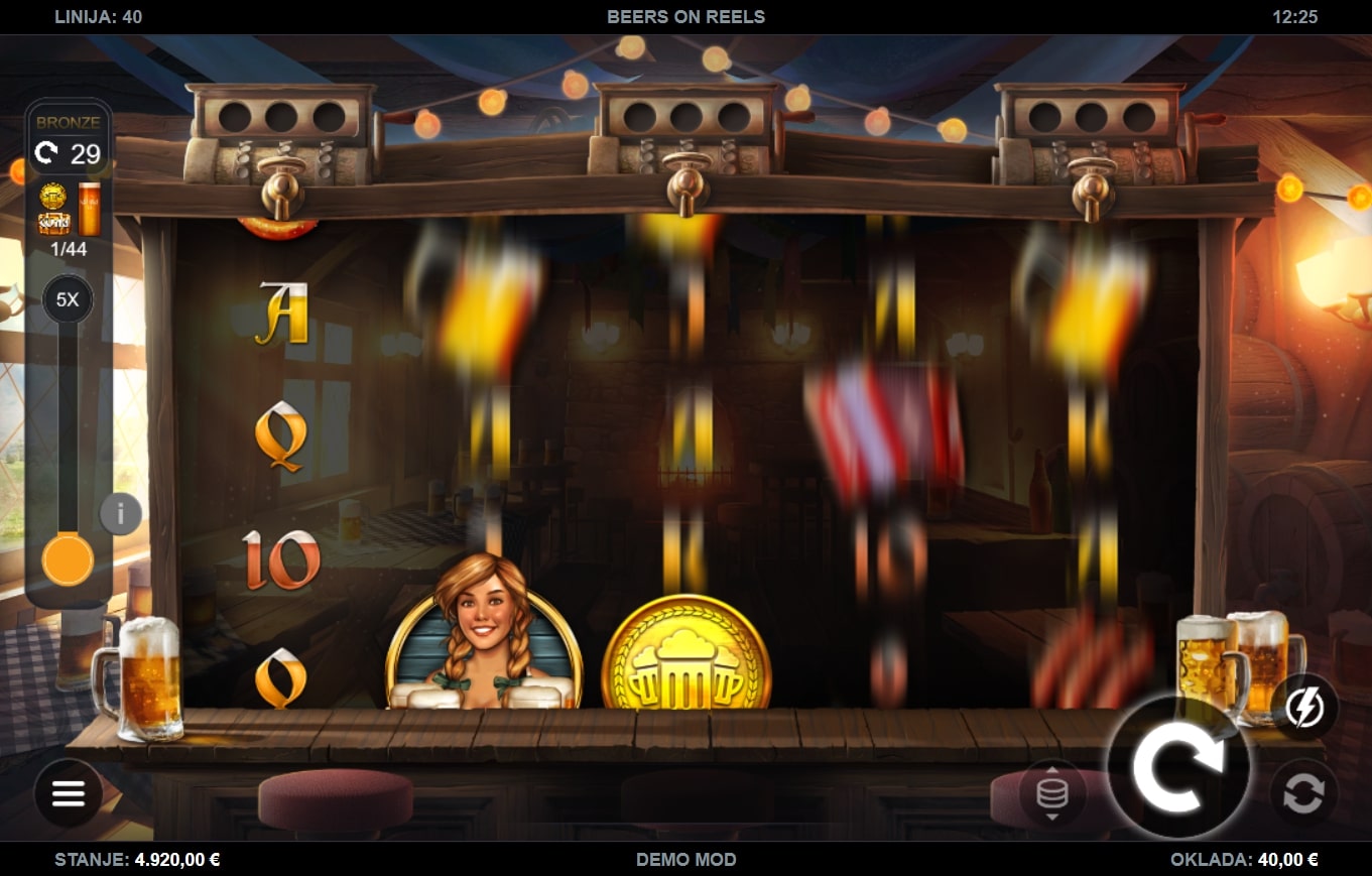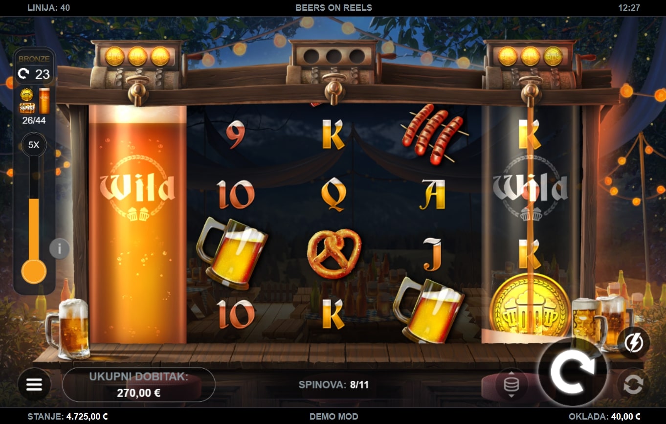 Beers on Reels tematska je slot igra koja vodi igrača u ugođaj pivnice gdje vladaju nezaboravni te osvježavajući dobici. Igrač može okrenuti simbole piva i bačve koja može zamijeniti druge simbole, ali i zasititi se raznim kobasicama i perecima uz zvuk harmonike kako bi ostvario super nagrade. Besplatne vrtnje se ostvaruju slaganjem simbola Bonusa, dok se dodatne vrtnje mogu osvojiti javljanjem simbola srebrnog novčića unutar njih. Zaigraj Beers on Reels te osvoji vrhunske nagrade!