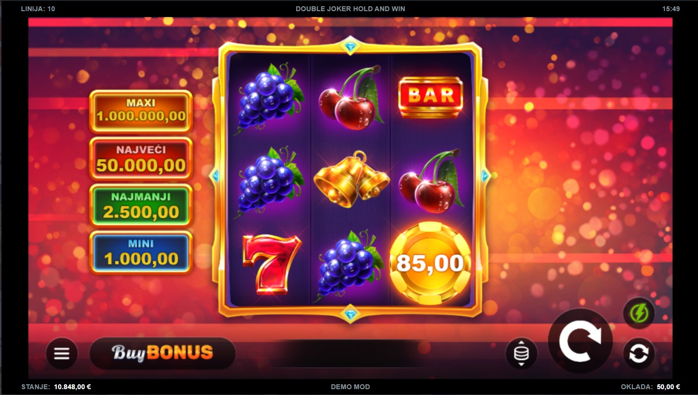 Double Joker Hold and Win ima RTP od 94,03%, što znači da pruža vrlo solidne šanse za dobitak tijekom igre. Volatilnost je srednja što povećava uzbuđenje jer igra može donijeti značajne dobitke, osobito tijekom bonus značajki. Idealna je za igrače koji vole dinamičnu s potencijalom za veće nagrade.