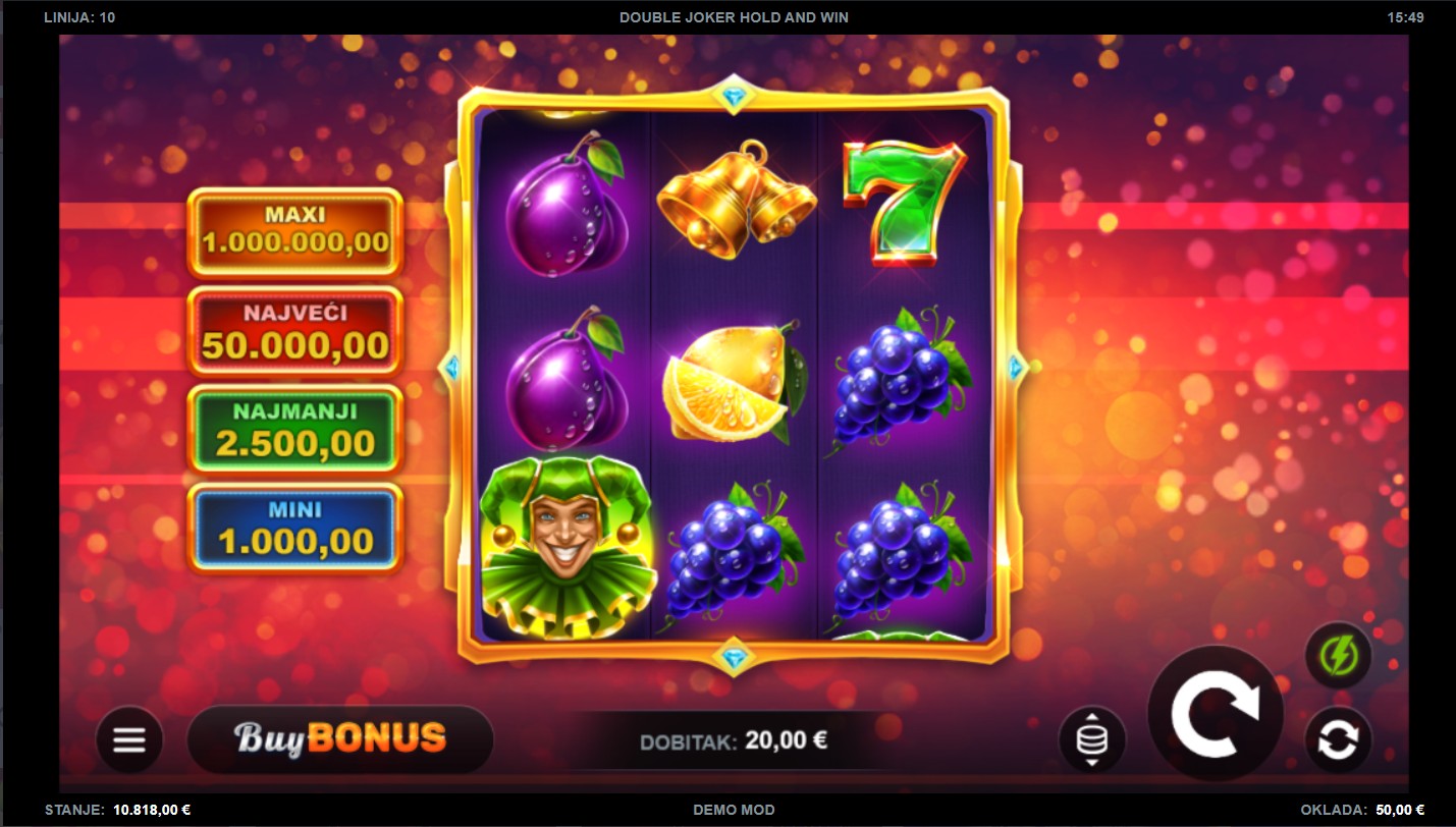 Double Joker Hold and Win je slot igra providera Kalamba koja spaja klasičnu voćnu temu s modernim značajkama poput Hold and Win mehanike. Igra donosi uzbuđenje tradicionalnig igara uz dodatne mogućnosti za veće dobitke i napetost kod svake vrtnje bubnjeva.
