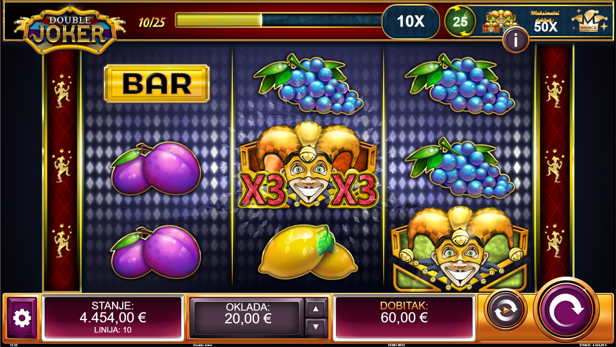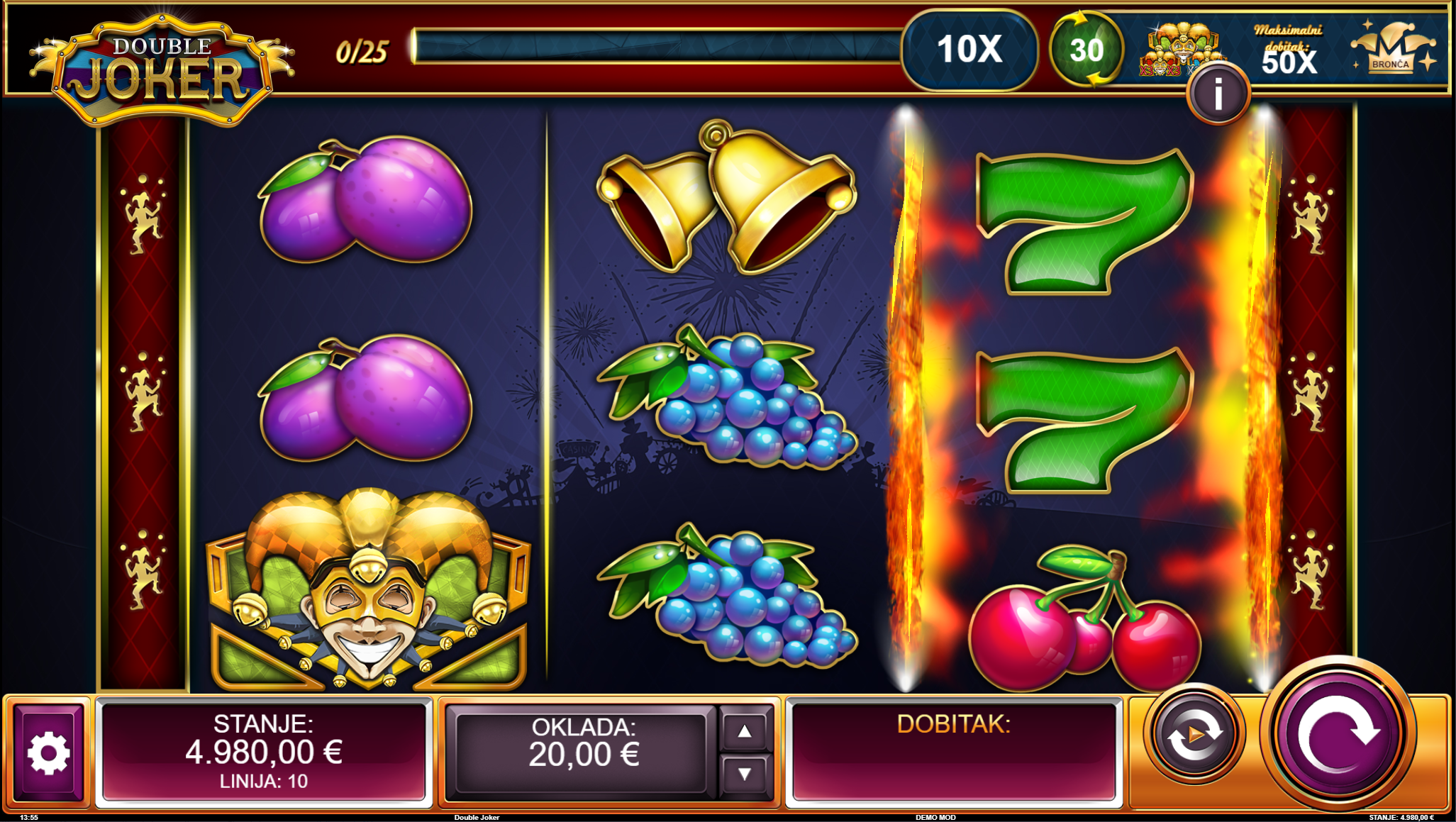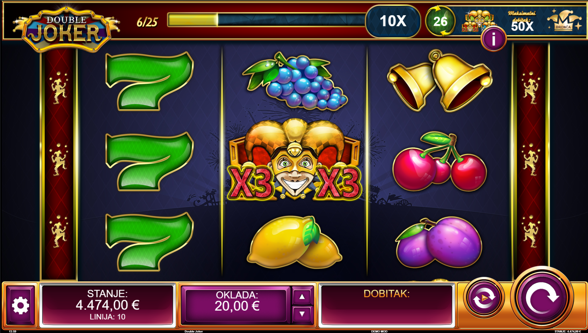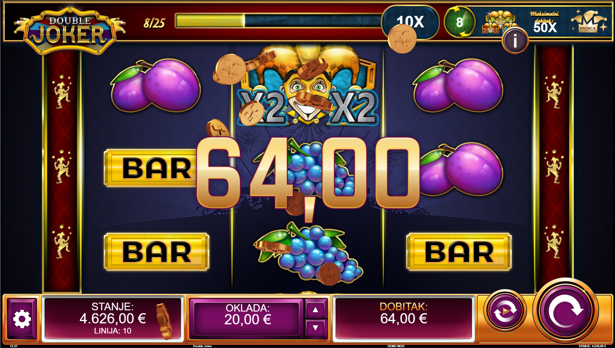 Dobrodošao u Double Joker, zabavnu avanturu inspiriranu gomilom sočnog voća i tajanstvenih jokera koji će ti uz nezaboravno igranje donjeti i velike dobitke! Primamljivo ilustrirano voće jednostavnog dizajna, kao i način igranja učiniti će dozu zabave i zanimacije nedostižnom! Kako uzbuđenju tu nebi bio kraj, pobrinuti će se joker simbol i igranje pretvoriti u super uzbudljivo te bogato po pitanju dobitaka! Kao jedan od najpopularnijih slotova, Double Joker odličan je izbor za sve igrače koji vole izvrstan omjer rizika i dobitaka.