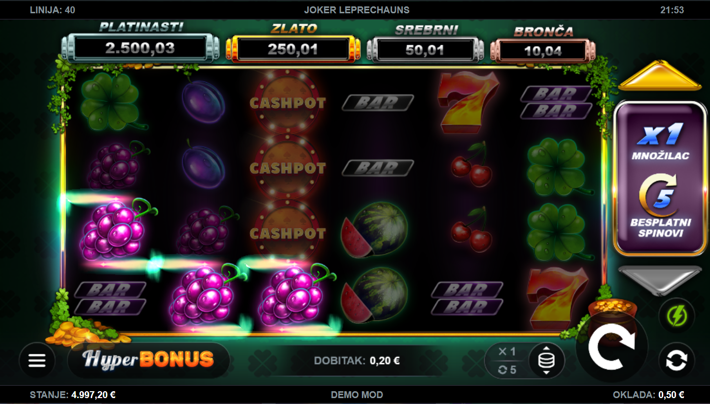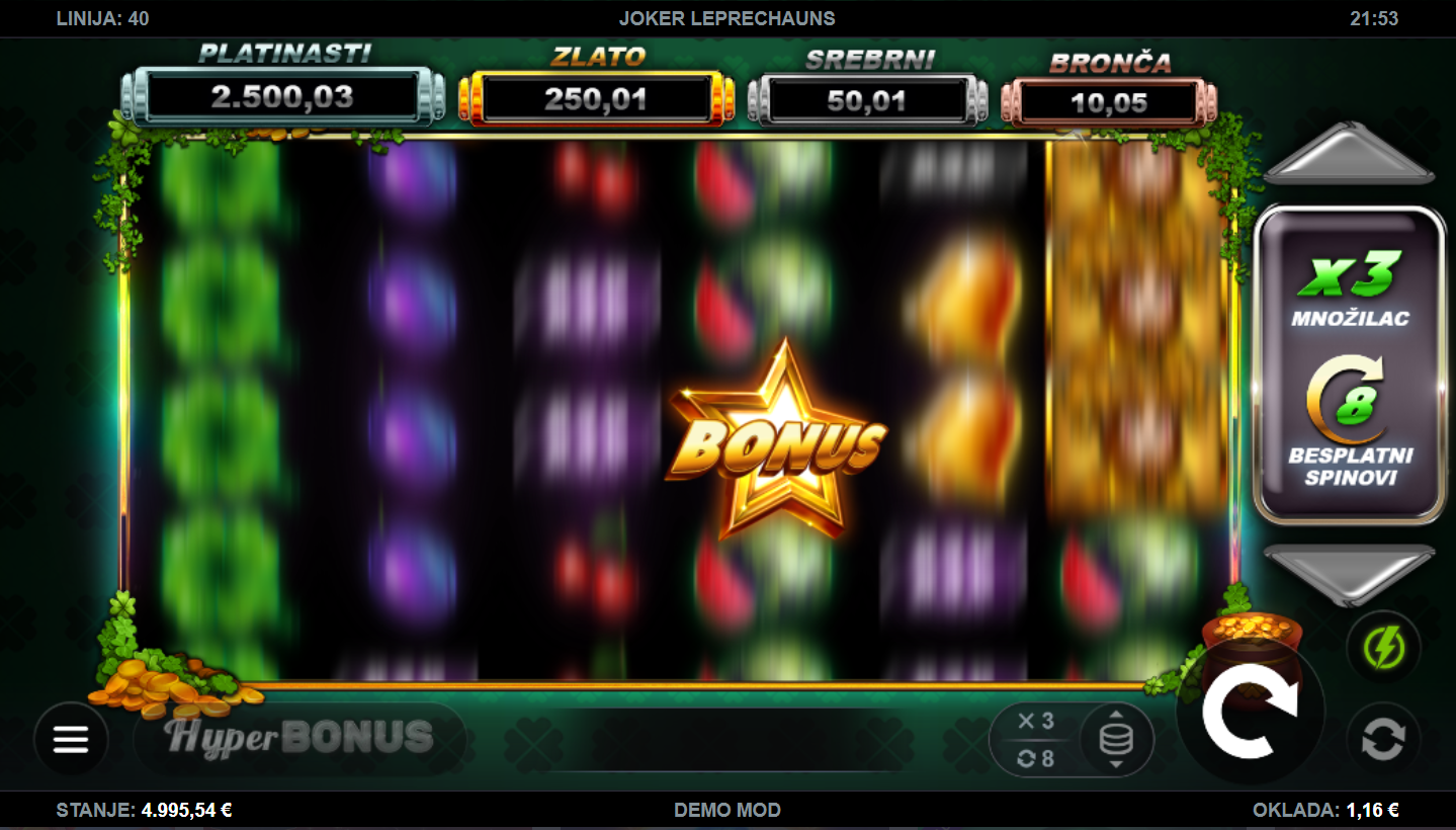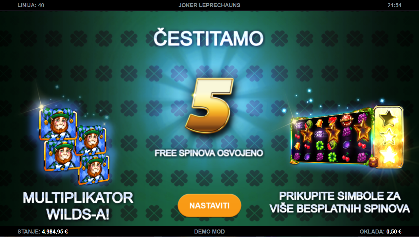 Zamisli da se irska sreća sudari s klasičnim slotovima, i tako dobiješ Joker Leprechauns. Ova igra, od providera Kalamba Games, donosi eksploziju boja, simbola i energije uz simpatične vilenjake koji čuvaju tvoje šanse za dobitak. Šest rola, blistavi simboli i razigrana glazba odmah te uvuku u zabavni svijet ovog šarenog slot iskustva. Igra balansira klasični stil s modernim bonusima. Ako tražiš veselu, ali napetu igru, ovo je tvoja zelena srećka!