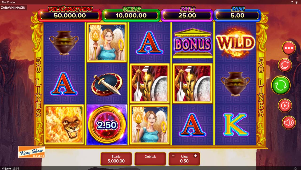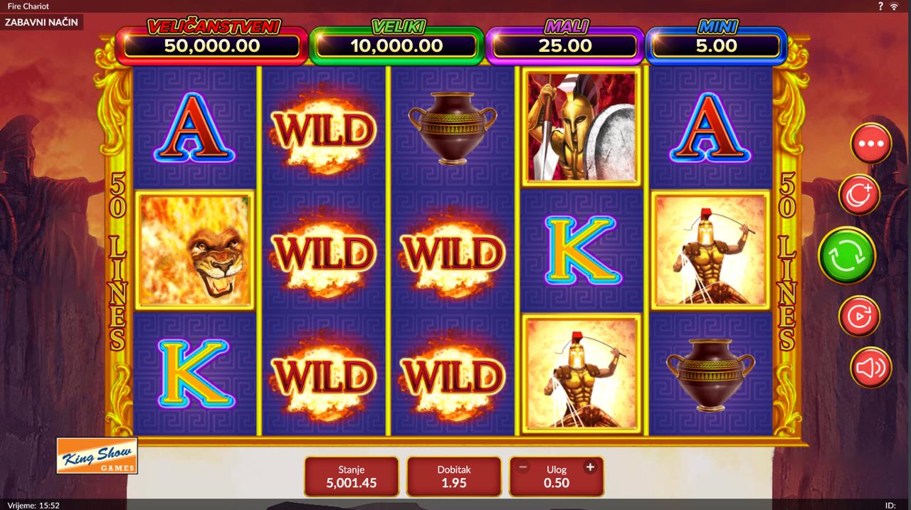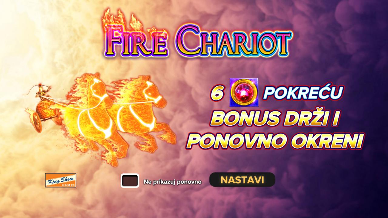 Fire Chariot igra se na 5 rola, a cilj je povezati iste simbole na aktivnim linijama, počevši s lijeve strane. Tematski simboli donose različite razine dobitaka, a jednostavna pravila omogućuju brzo i intuitivno igranje. Postavi željeni ulog, zavrti role i prepusti se vatrenom ritmu igre koji donosi novu priliku za dobitak pri svakom spinu.
