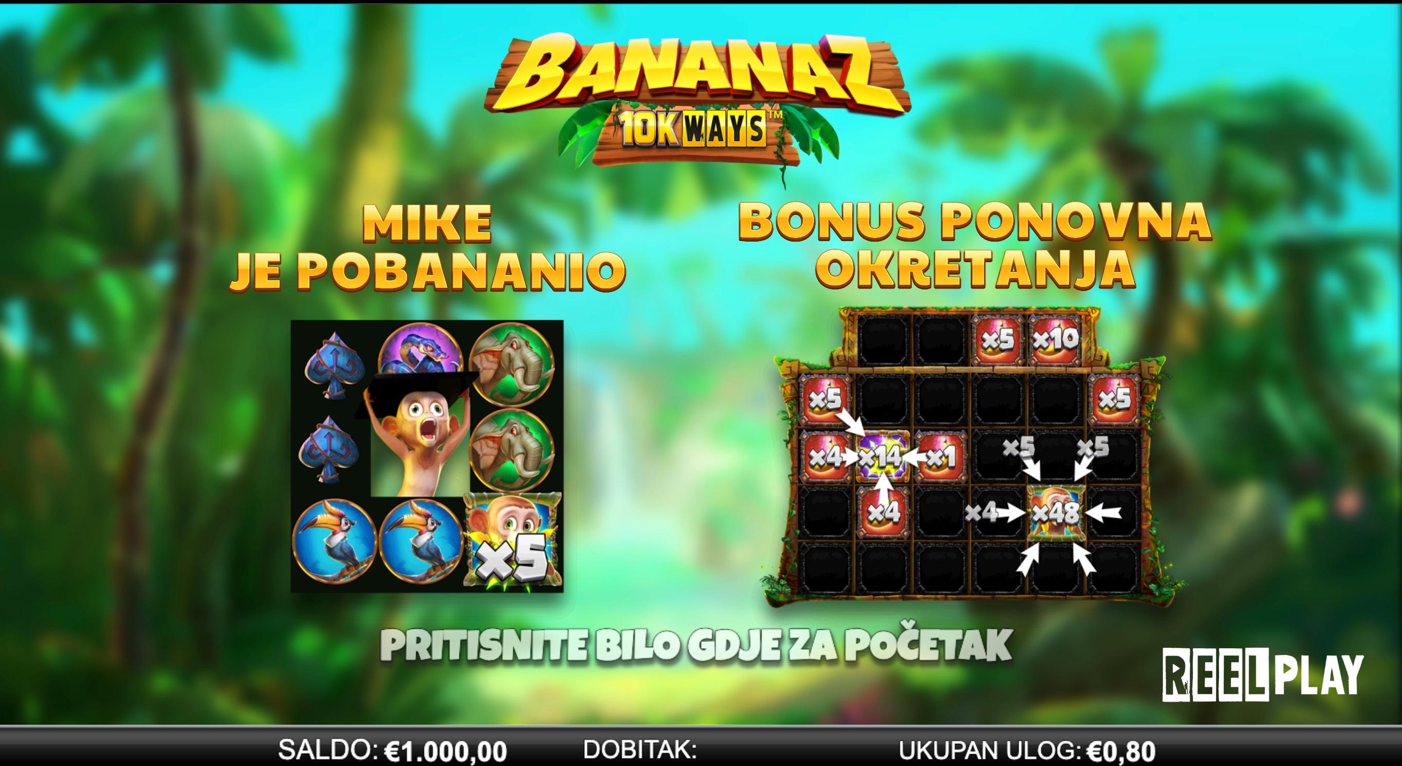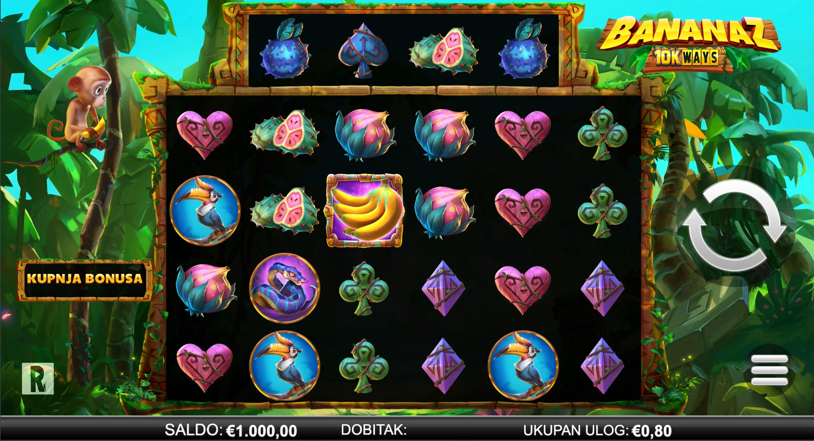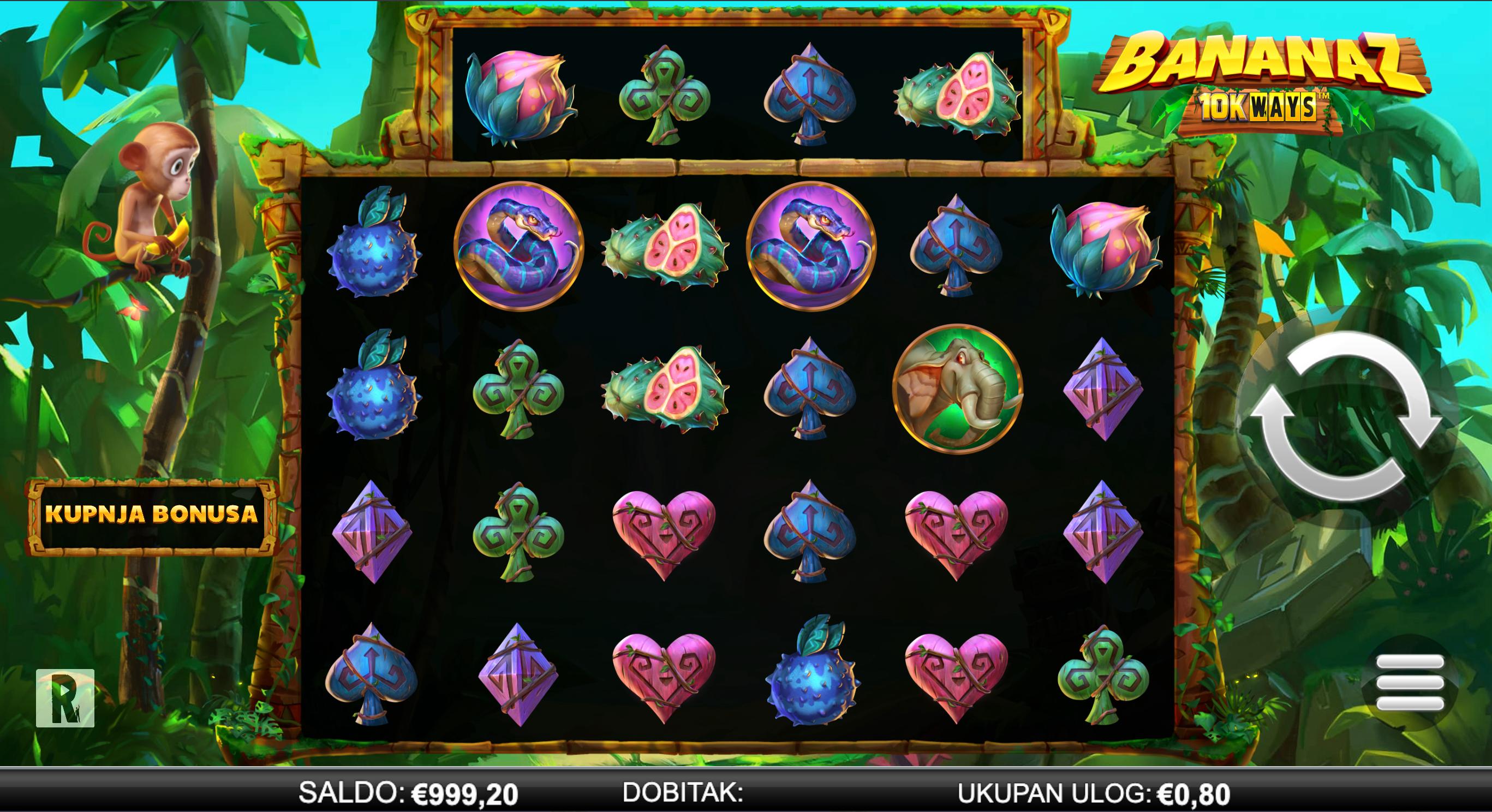 Odaberi ulog između 0,20 € i 12,00 € i pokreni kolute. Kombinacije simbola ostvaruju se na susjednim kolutima s lijeva na desno. Igra donosi kaskadne dobitke — kada se formira dobitak, simboli nestaju i novi padnu, povećavajući šanse za lančane isplate. Bonus runda aktivira se putem scatter simbola i tijekom nje su aktivni multiplikatori te poseban majmun-simbol koji pomaže u ostvarivanju dobitaka.