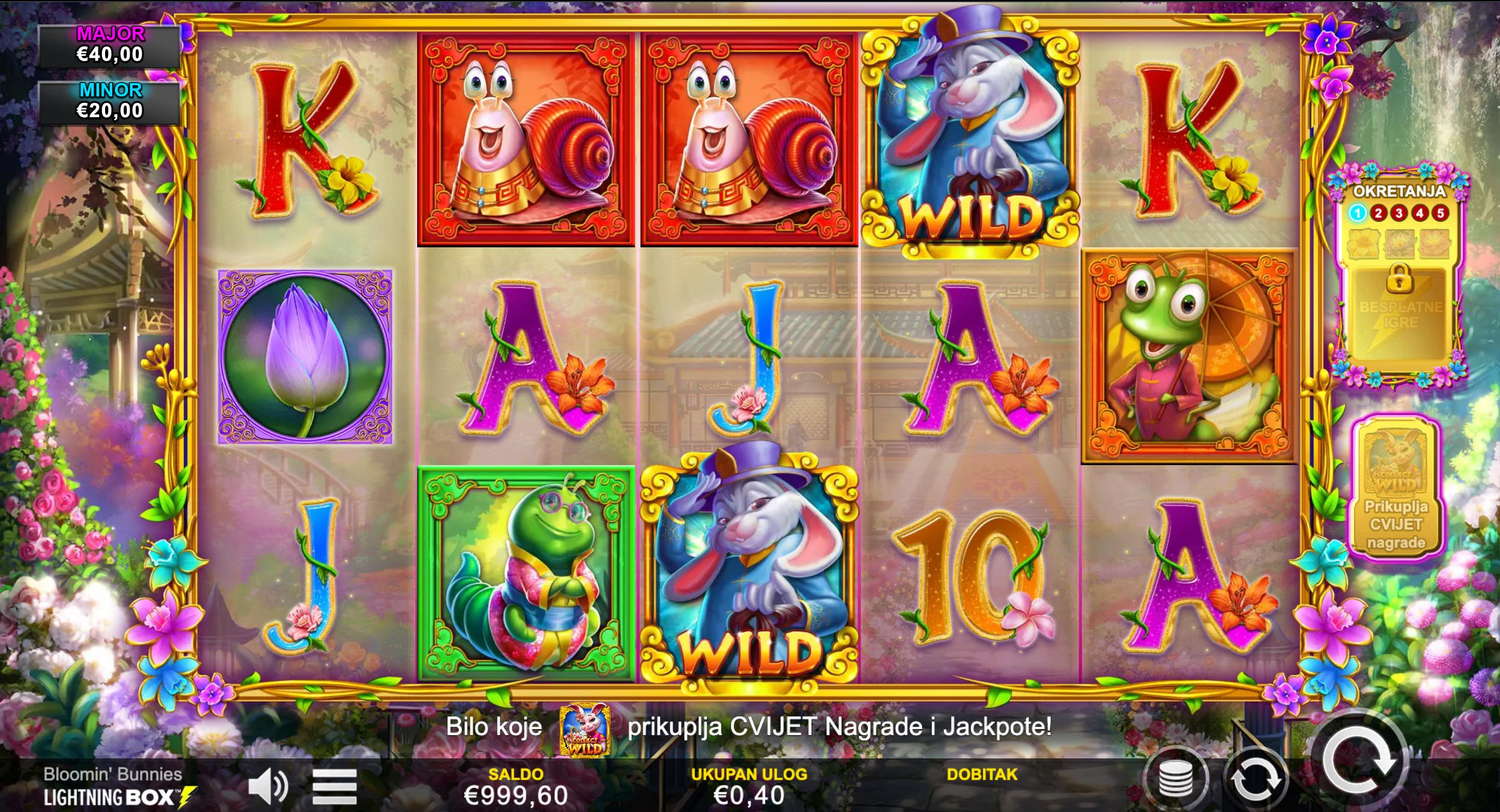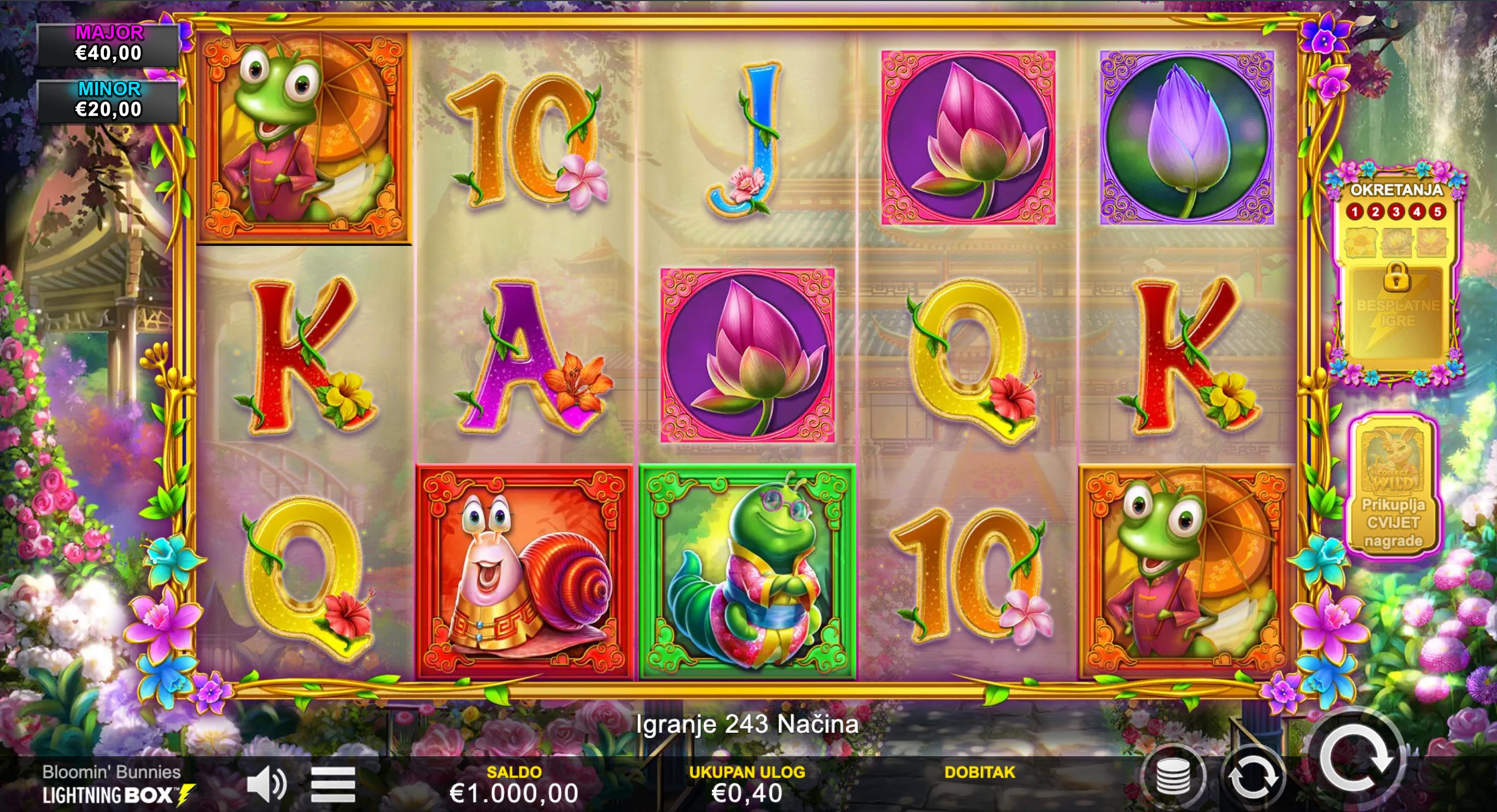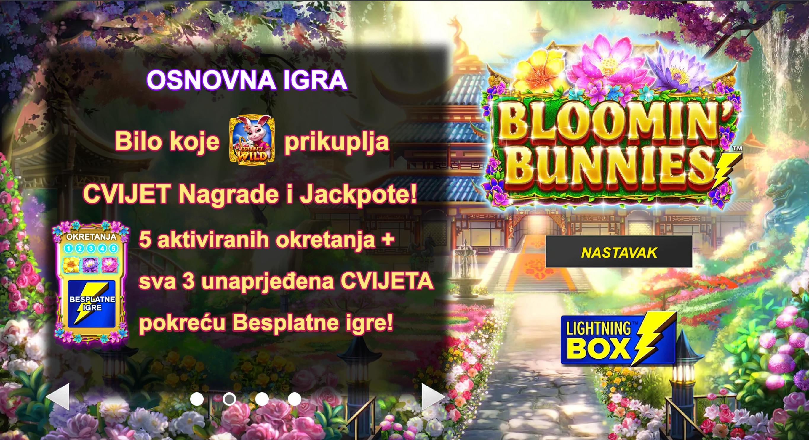 Bloomin’ Bunnies je šareni video slot koji donosi igru sanim simbolima, bonusima i dinamikom vrt-teme. Igra pruža mnoštvo uzbuđenja uz minimalni ulog od 0,20 €, a maksimalni ulog iznosi 60,00 €. Igra nema jackpot.