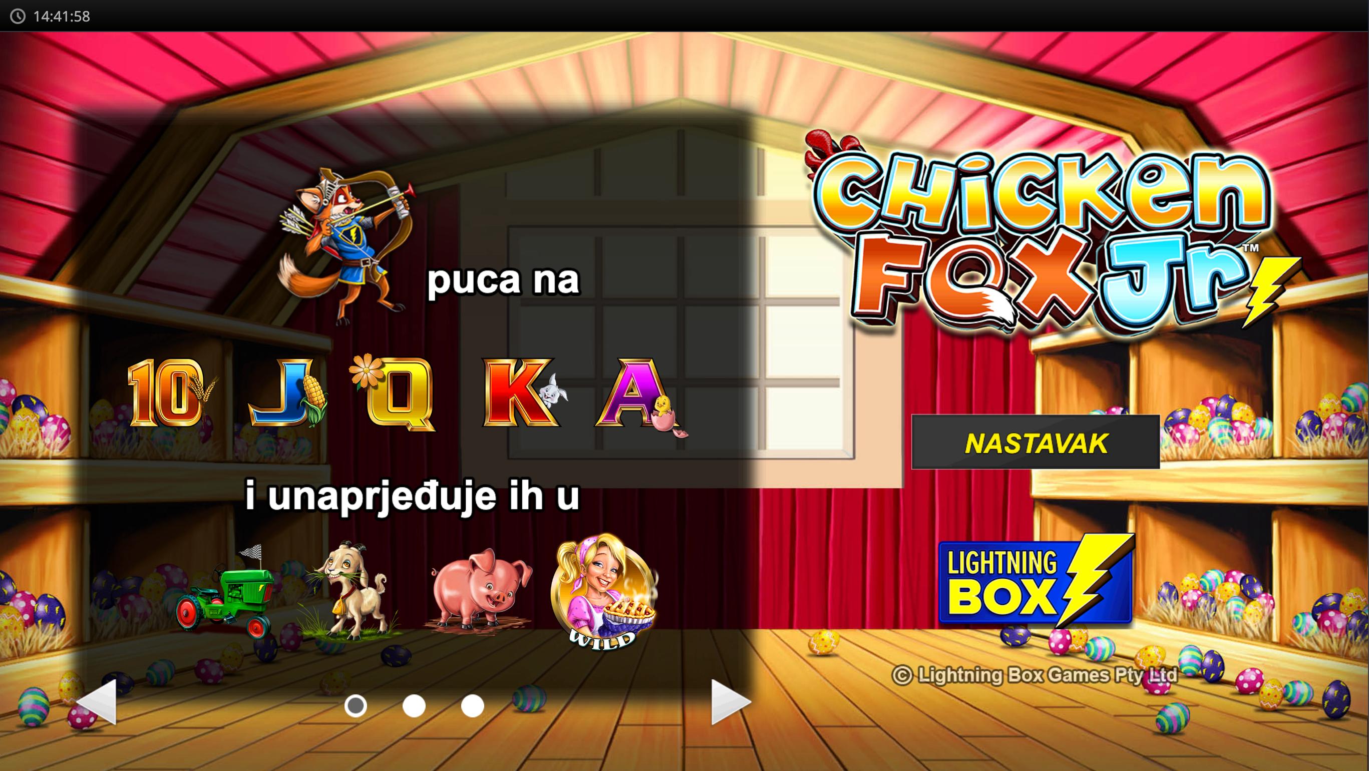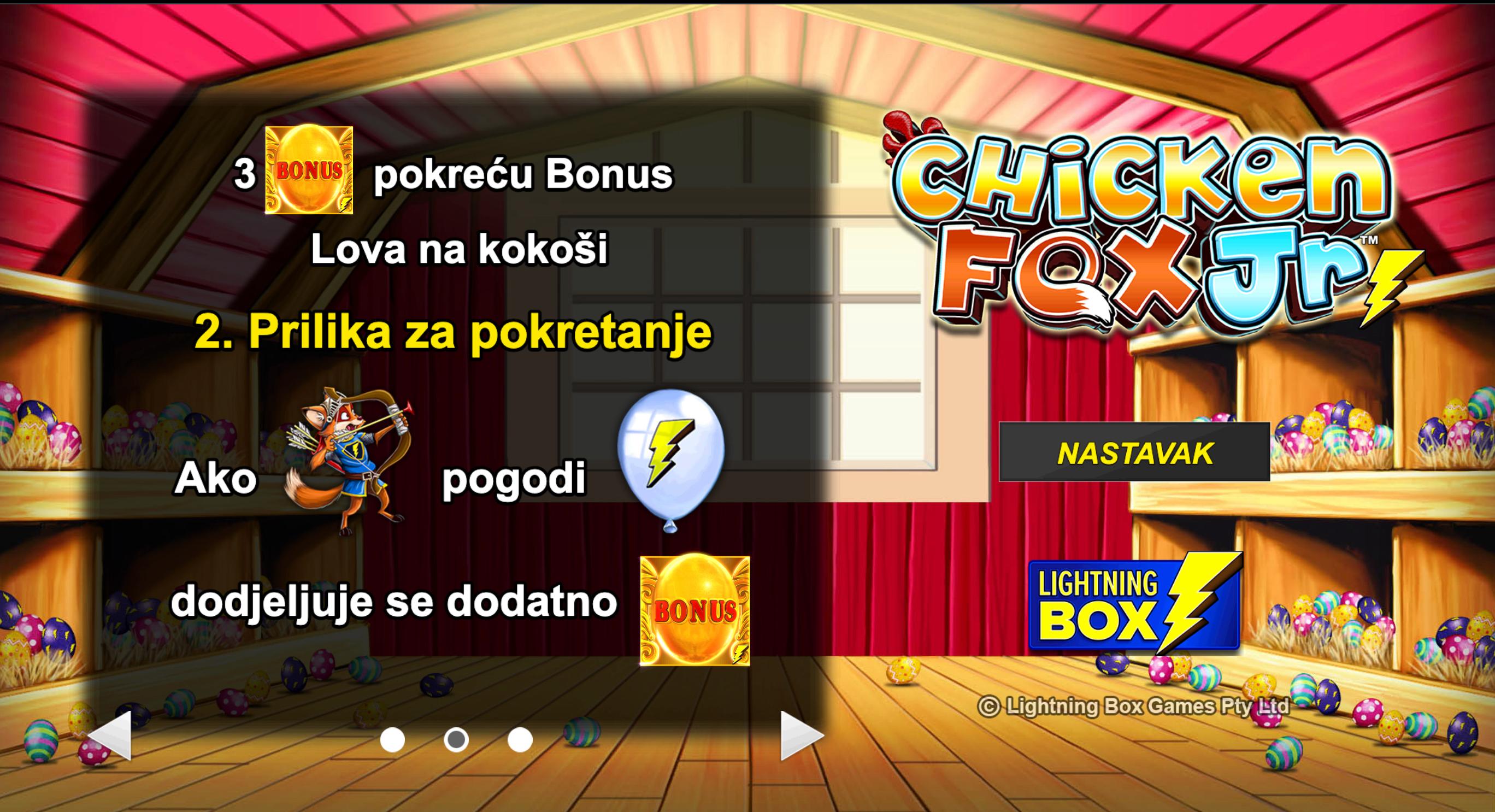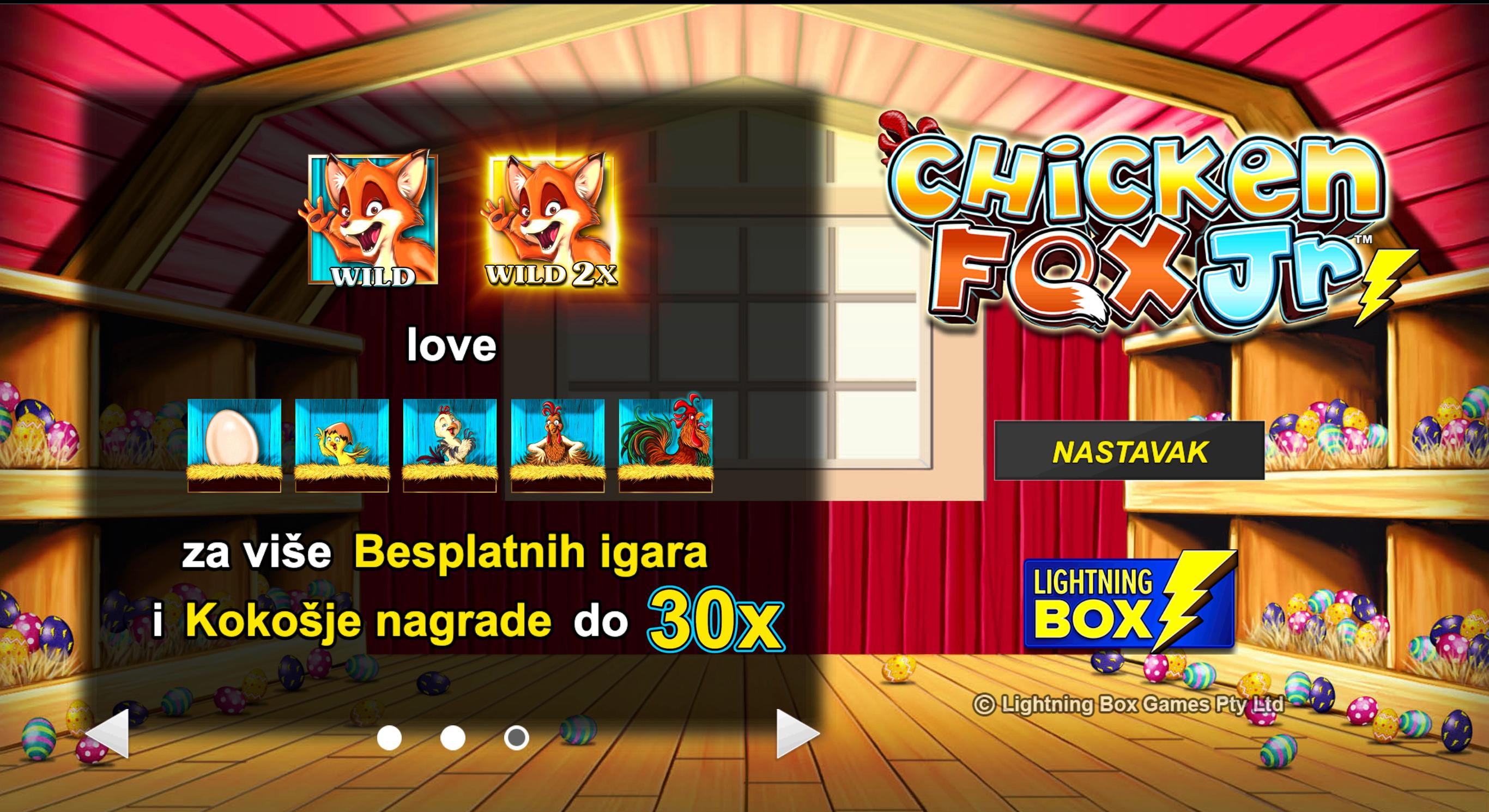 Chicken Fox Jr je slot igra providera Light & Wonder, smještena na farmu punu simbola zabave – lisice, kokoši, traktori i ostalo. Igra ima 5 koluta i 20 isplatnih linija.