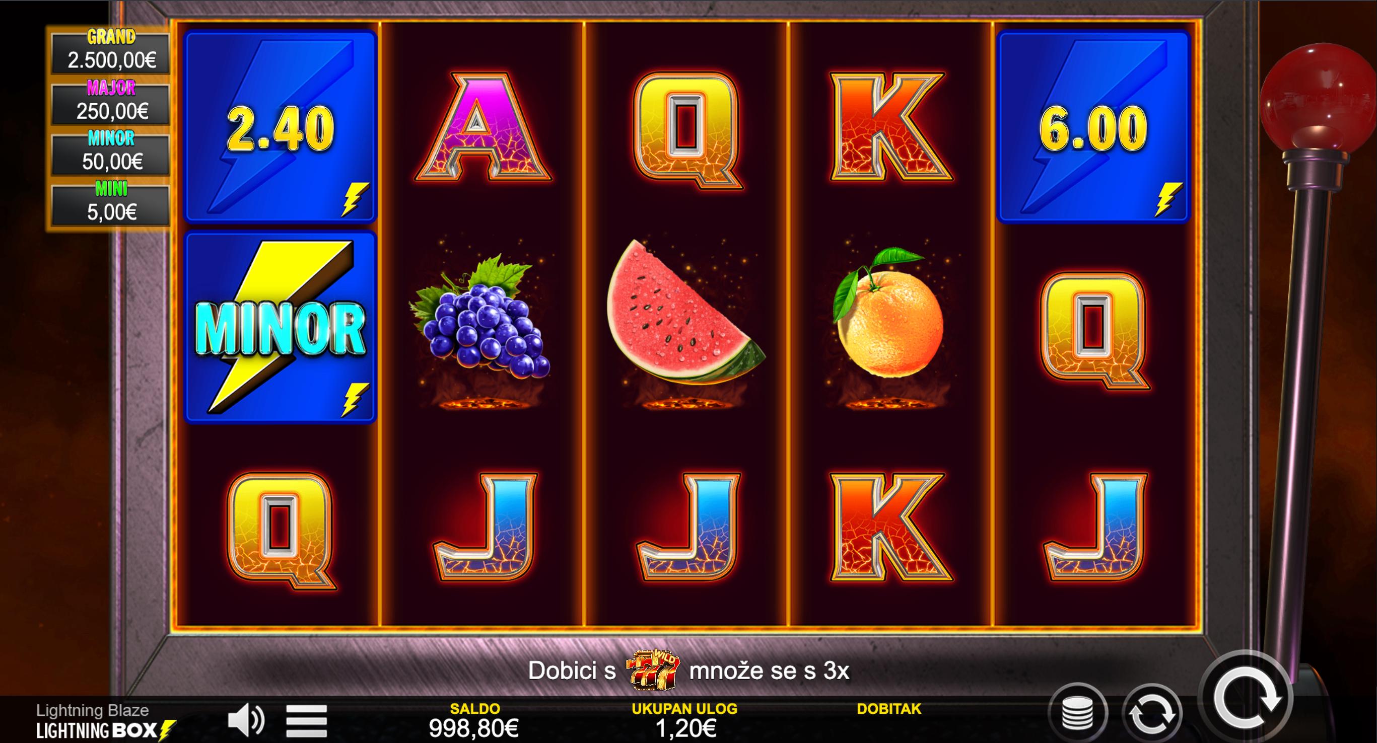 Lightning Blaze je klasični voćni slot sa modernim značajkama: 5 koluta, 3 reda i 40 isplatnih linija. U igri se pojavljuju simboli voća, sedmice, zvona i simbola munje koji pokreću specijalne funkcije.