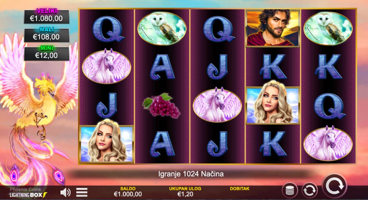 PHOENIX COINS se igra na standardnoj slot strukturi s ciljem da se spoje isti simboli na susjednim rolama s lijeva na desno kako bi se ostvario dobitak. Simboli visoke vrijednosti i posebni Feniks simboli donose veće isplate. Ova verzija igre nema bonus funkcije, besplatne vrtnje ni jackpot, što ju čini savršenom za igrače koji preferiraju jednostavne slotove. Minimalni ulog od 0,40 € i maksimalni od 80,00 € pružaju fleksibilnost, a svaki spin donosi jasnu i brzu igru s fokusom na stabilne isplate.