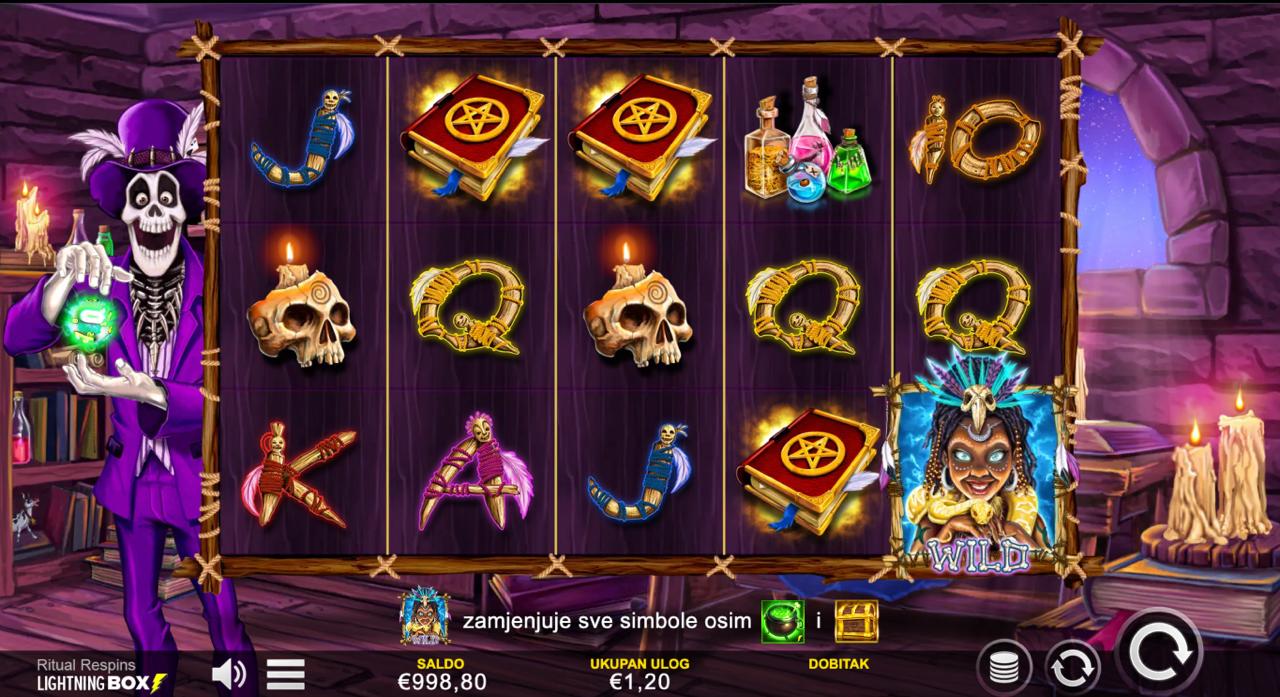 RITUAL RESPINS se igra na klasičnoj slot mreži: odaberi svoj ulog (između 0,30 € i 90,00 €), pokreni spin i gledaj simbole. Kada se pojave dobitne kombinacije, aktivira se funkcija respin — igra ti daje dodatni spin bez dodatnog uloga, čime dobivaš novu priliku za dobitak. Ova opcija čini igru uzbudljivijom i povećava šanse za veće isplate. Igra nema bonus rundi, besplatnih vrtnji ni jackpot — naglasak je na respin mehanici i standardnoj isplati.