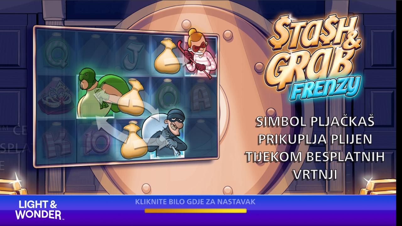Dobrodošli u svijet brzih pljački i napetih okreta — gdje svaki spin može donijeti neočekivani dobitak! STASH AND GRAB FRENZY dolazi od providera Light & Wonder (LnW) i donosi klasiku slot igara s energičnim ritmom i mogućnošću brzih dobitaka. Minimalni ulog iznosi 0,10 €, dok maksimalni iznosi 20,00 €, što igru čini dostupnom svima — od početnika do iskusnijih igrača. Igra nema jackpot, ali potencijal za dobitak je uvijek prisutan — svaki spin nosi šansu da “ukradeš” veliki dobitak. Ako voliš igre koje spajaju rizik, zabavu i mogućnost brzog profita — STASH AND GRAB FRENZY je dobar izbor!