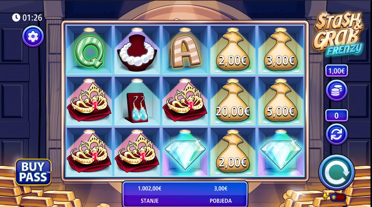 STASH AND GRAB FRENZY se igra na standardnoj slot mreži: odabereš ulog (između 0,10 € i 20,00 €), pokreneš spin i čekaš da se simboli poravnaju u dobitnu kombinaciju. Svaki spin je samostalan događaj, bez dodatnih bonus funkcija ili kompliciranih pravila — jednostavno, brzo i transparentno. Igra nema besplatnih vrtnji, bonus rundi ni jackpot — sve ovisi o tvojoj sreći i izboru uloga.