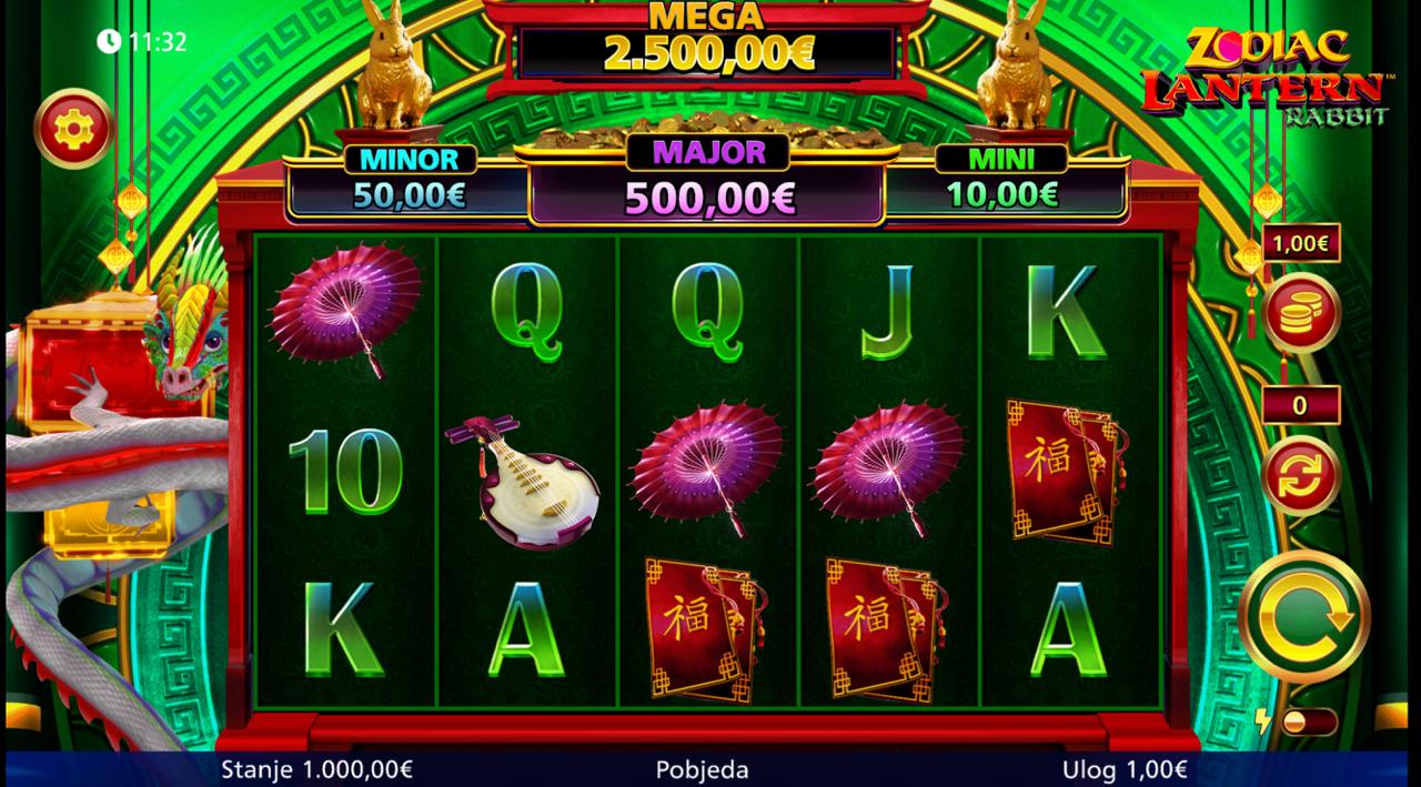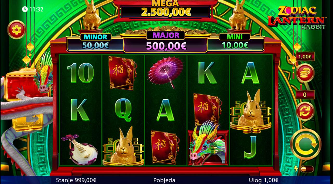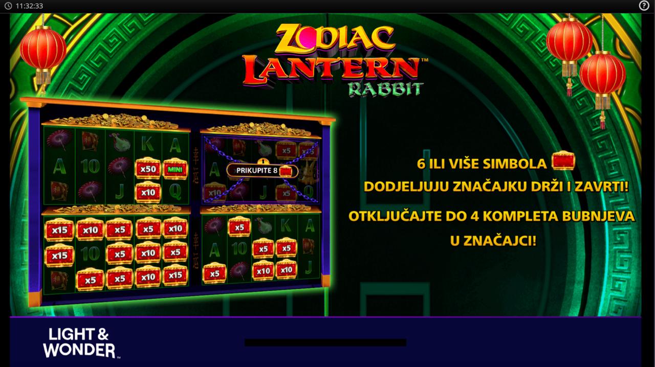ZODIAC LANTERN RABBIT se igra na standardnoj mreži slot rola: odaberi svoj ulog u rasponu od 0,20 € do 40,00 €, zatim pokreni spin i prati kako se simboli raspoređuju. Dobitna kombinacija simbola (prema pravilima isplatnih linija) donosi isplatu. Igra ne uključuje bonus funkcije, besplatne vrtnje niti jackpot — fokus je na čistom slot gameplayu i sreći za svakim spinom.