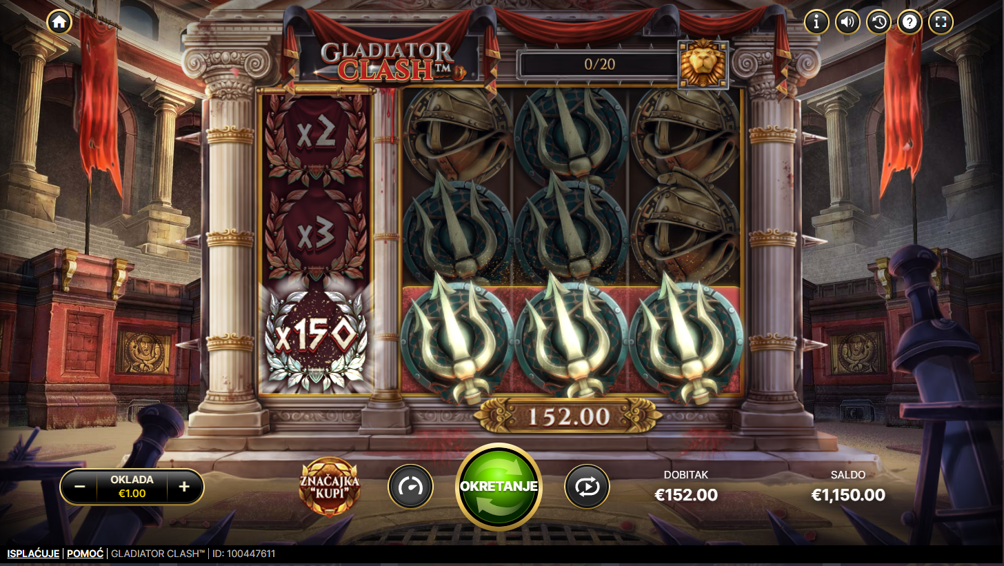 Gladiator Clash vodi te ravno u srce arene, gdje legendarni ratnici love slavu i bogatstvo! NetEnt je spojio epsku temu gladijatora s modernim slot mehanikama i dinamičnom grafikom. Svaki spin je poput borbe na život i smrt: publika navija, a ti ciljaš na velike nagrade. Simboli kaciga, oružja i hrabrih boraca donose pravi spektakl. Ako voliš akciju i adrenalin, ovo je tvoja pozornica!