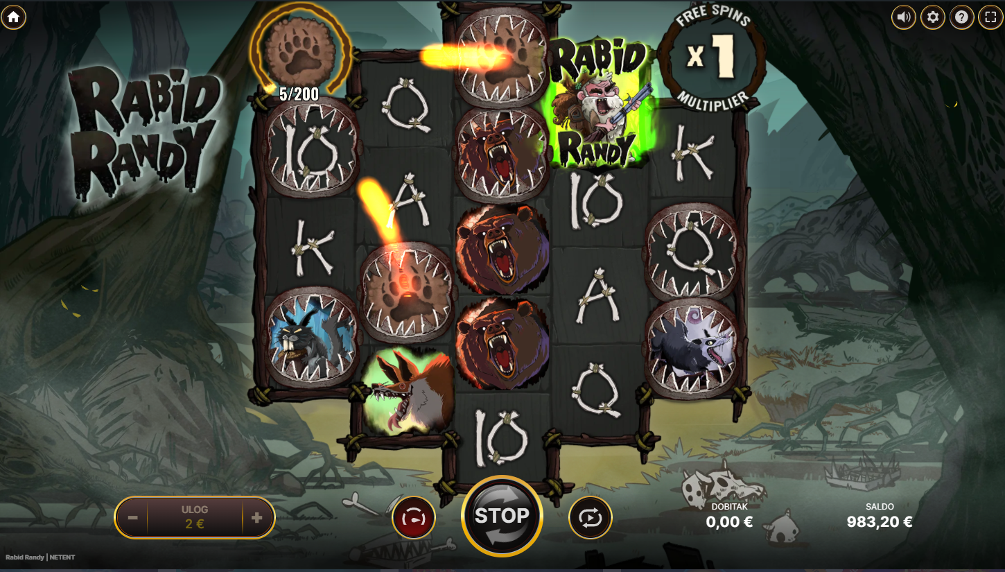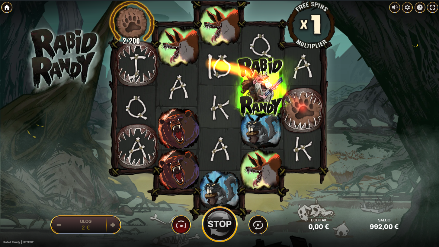 Igranje Rabid Randyja je jednostavno, a opet prepuno iznenađenja. Pojavljuju se Paw i Hot Paw simboli koji stvaraju okvire, a oni se mogu aktivirati i donijeti nevjerojatne multiplikatore. Kad uhvatiš tri Randy simbola, ulaziš u Free Spins rundu gdje akcija postaje još ljuća. Samo odaberi svoj ulog, zavrti i pusti da Randy pokaže koliko je stvarno nabrijan.