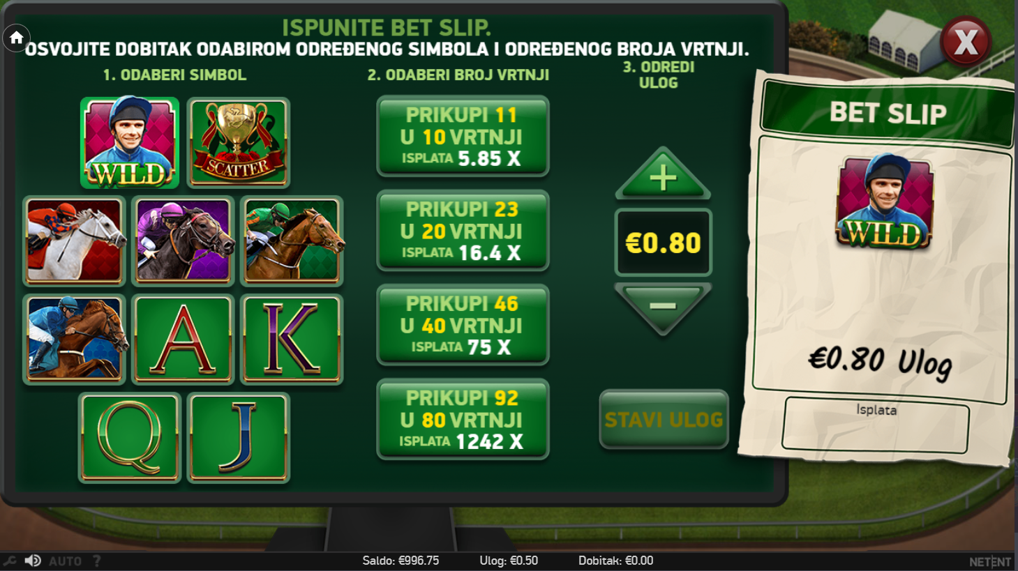 Zavrti kolutove i iskoristi nasumične wild simbole koji se mogu pojaviti bilo kada. Aktiviraj Bet Slip opciju da prognoziraš pojavljivanje simbola i osvojiš dodatne nagrade. Ako prikupiš dovoljno scatter simbola, ulaziš u Peter’s Classic Cup, bonus igru u kojoj biraš svog konja i juriš dobitke do 5000 puta uloga!