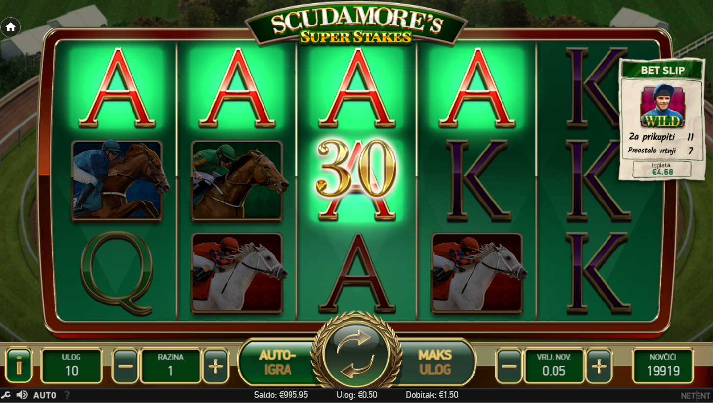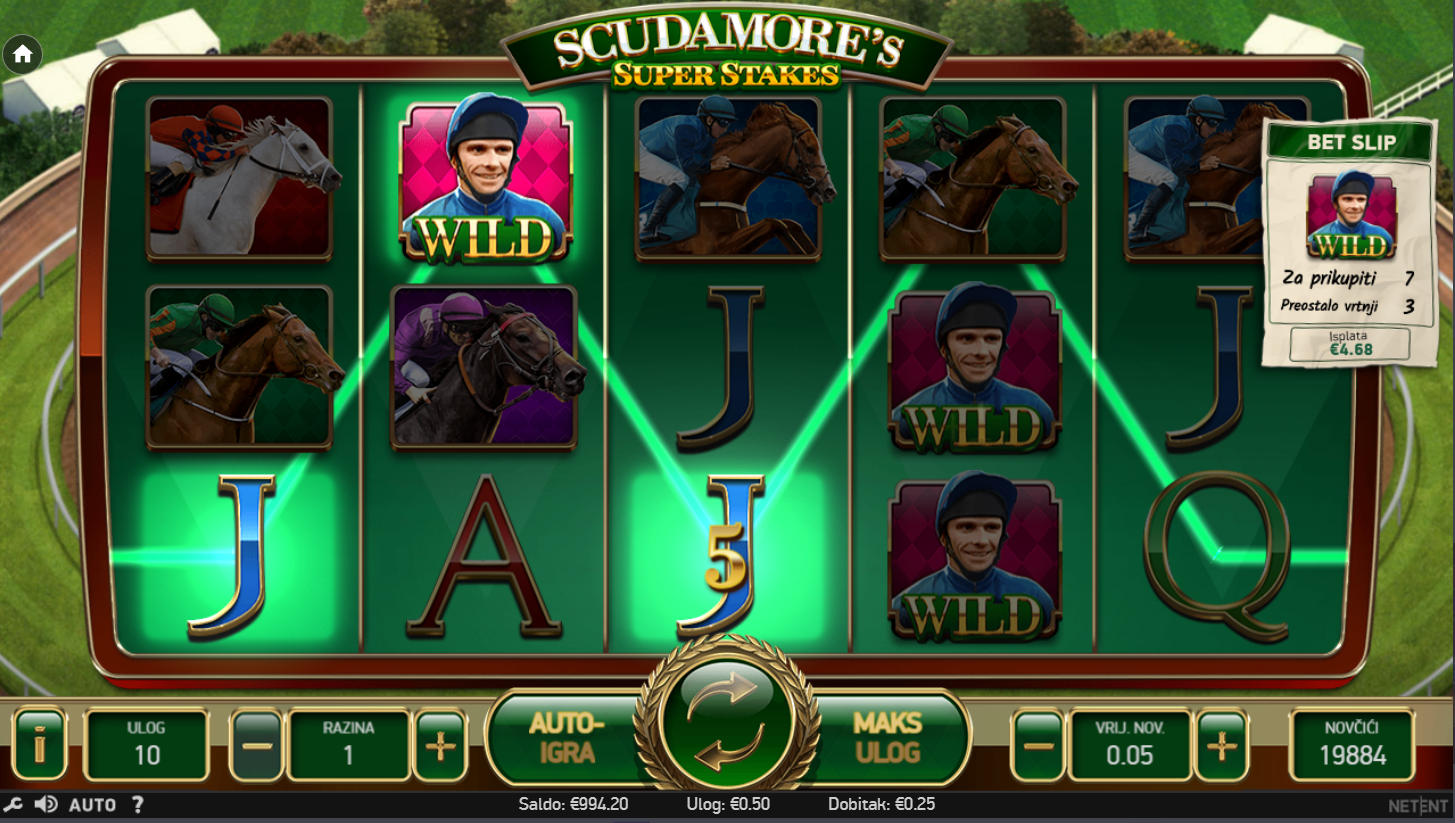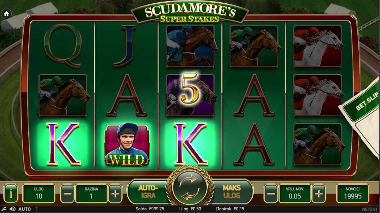 Scudamore’s Super Stakes i NetEnt te vode pravo na hipodrom, gdje konji i džokeji diktiraju ritam kolutova! Slot s 5 kolutova i 20 linija spaja uzbuđenje utrka i bogate bonus značajke. Svaka vrtnja donosi novi val adrenalina i priliku za velike dobitke.