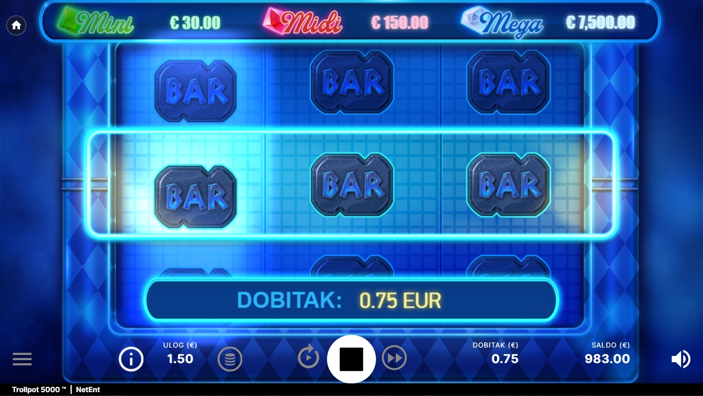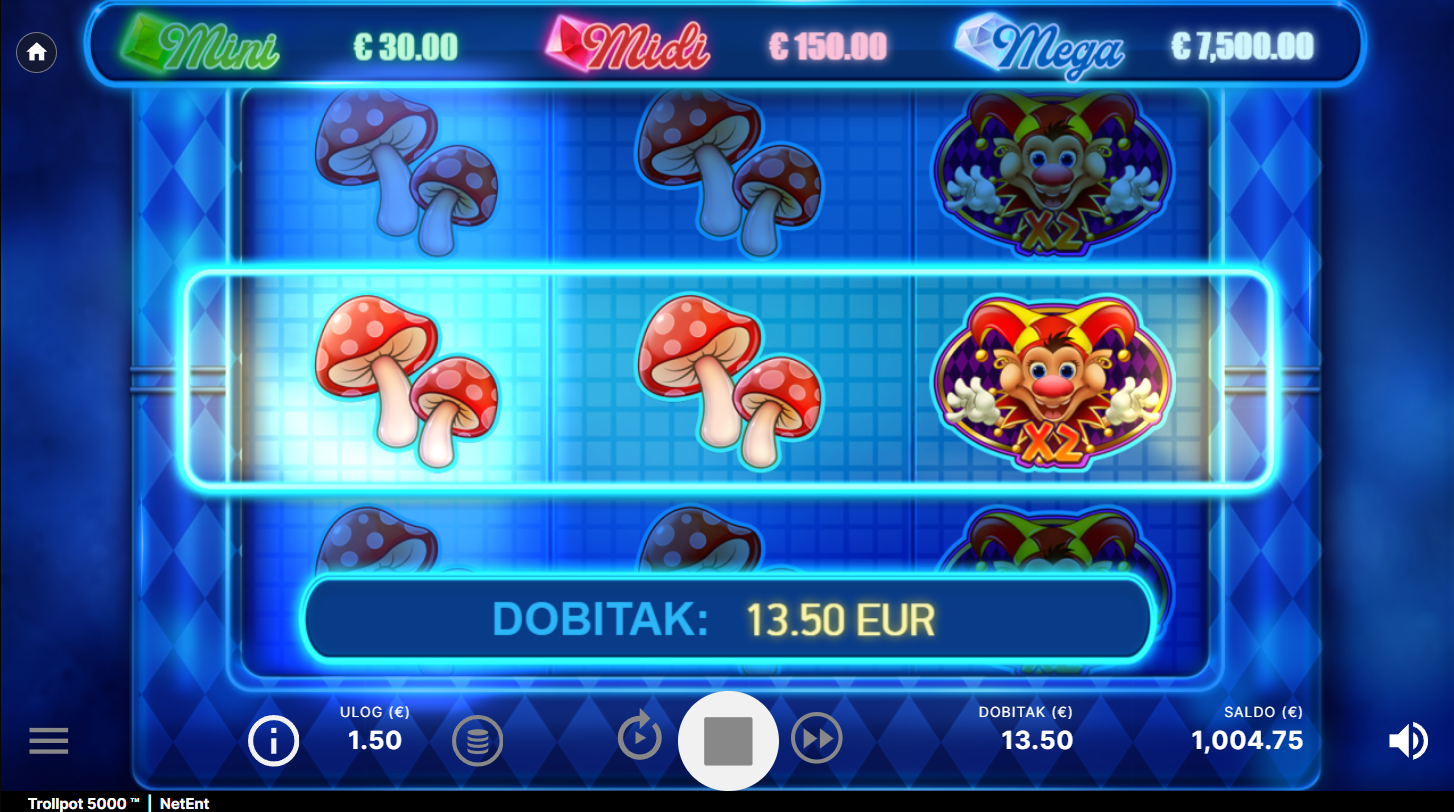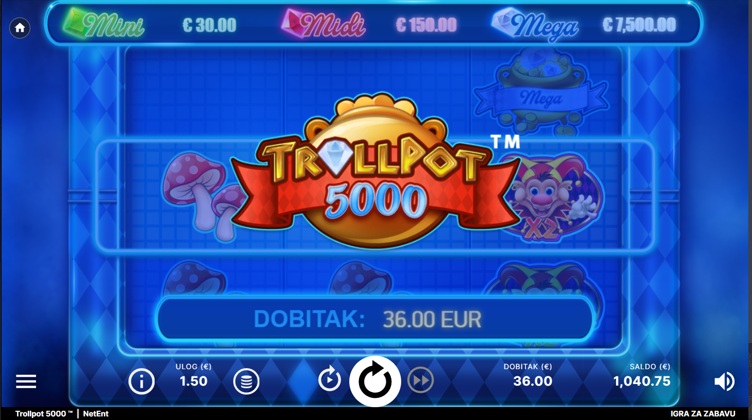 Trollpot 5000 ima tri fiksna jackpota: Mini (40×), Midi (200×) i Mega (5000×) tvog uloga.