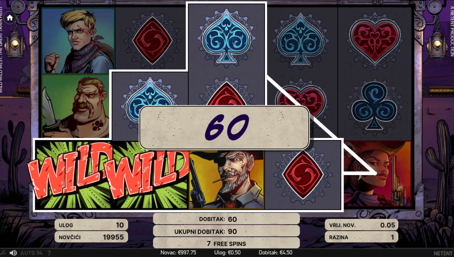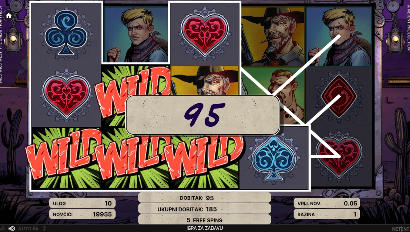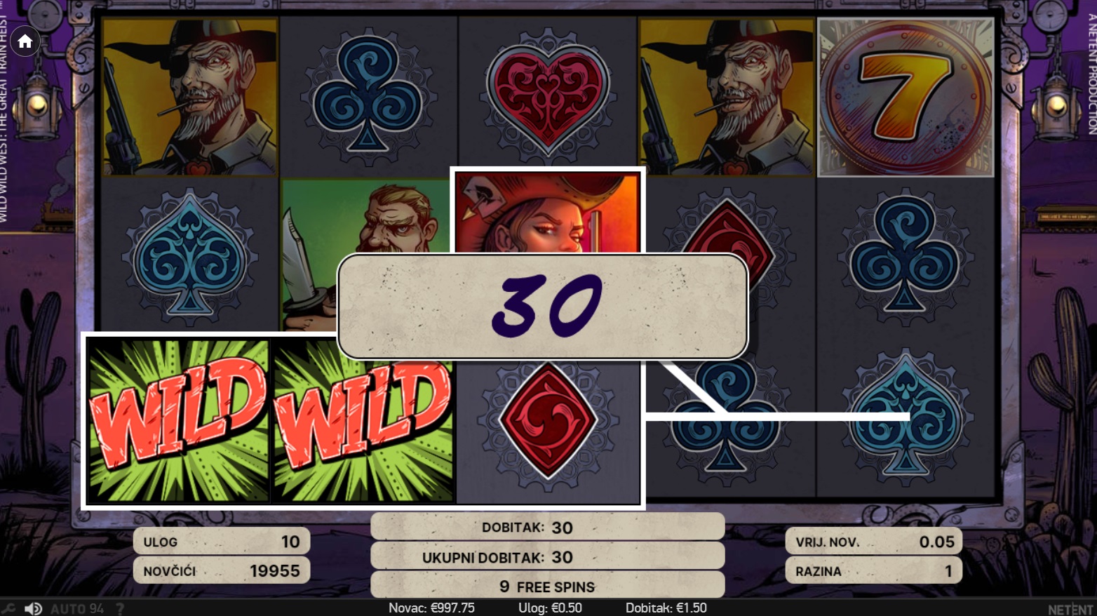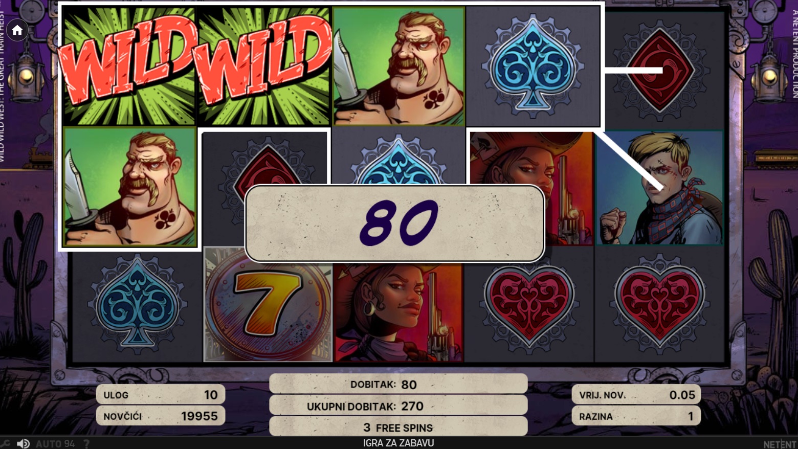 U igri Wild Wild West: The Great Train Heist, krećeš na uzbudljivo putovanje Divljim zapadom, gdje te čekaju opasne pljačke i nevjerojatni dobitci. Ovaj video automat s 5 valjaka i 3 retka nudi 10 fiksnih isplatnih linija, omogućujući ti da se upustiš u avanturu s različitim vrijednostima uloga. Uz bogatu ponudu Wild značajki, Free Spinova i bonus igru Pick and Click, svaka vrtnja donosi priliku za velike dobitke. Grafika i zvučni efekti vjerno dočaravaju atmosferu Divljeg zapada, čineći igru nezaboravnim iskustvom.