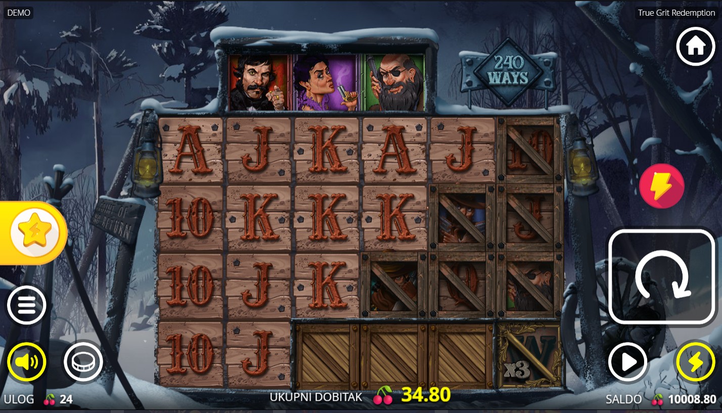 True Grit Redemption se igra na 6 valjaka i 5 redova. Cilj igre je složiti identične simbole slijeva nadesno i stvoriti dobitne kombinacije. Wild simboli zamjenjuju ostale simbole i povećavaju šanse za dobitke, dok 3 ili više scatter simbola pokreću rundu besplatnih vrtnji s dodatnim značajkama i množiteljima. Igra je puna bogatih značajki koje ti omogućavaju velike nagrade.