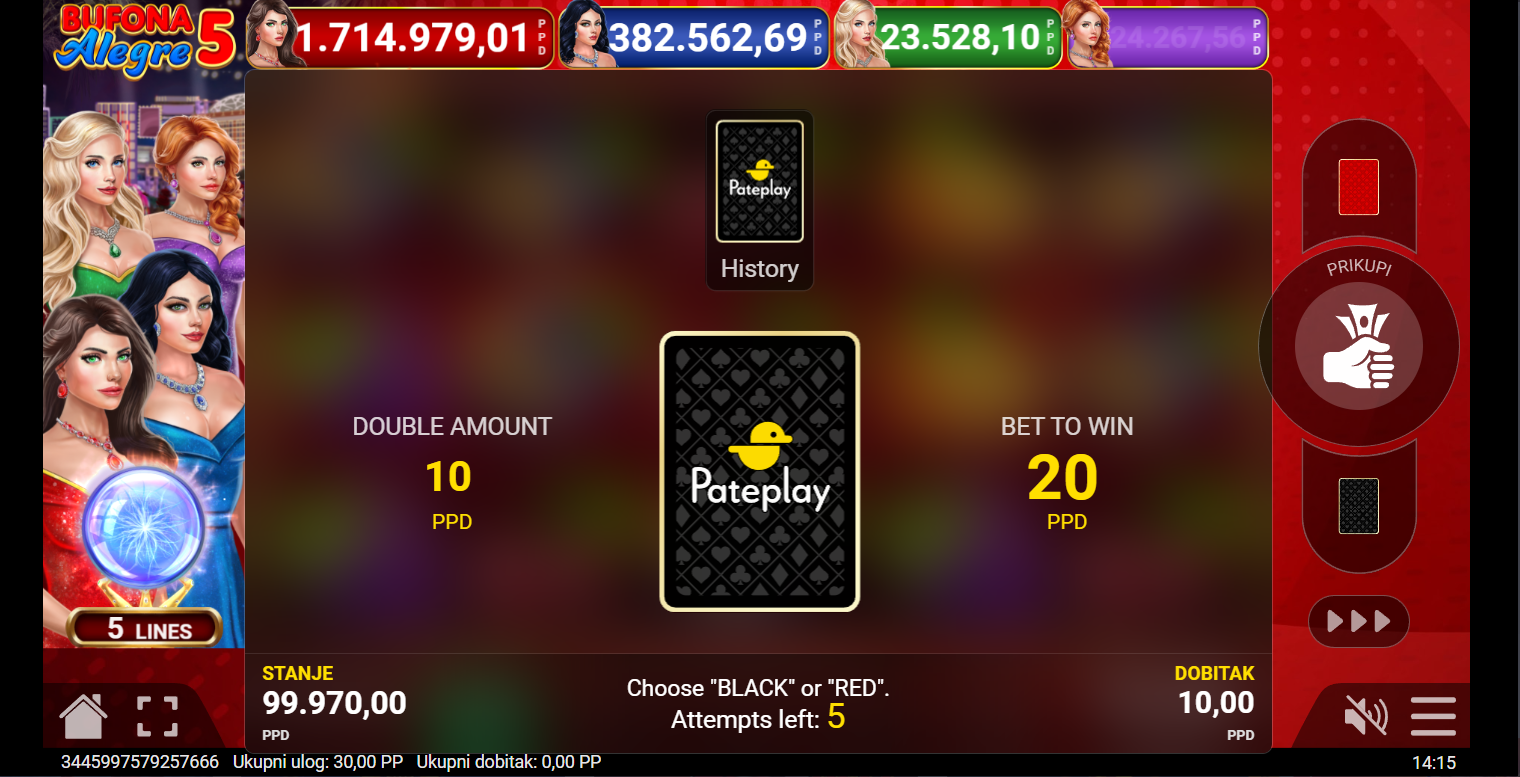 Dobrodošao u karneval sreće i boja s Bufona Alegre 5! Ova šarena slot igra od Pateplay donosi klasičan stil s modernim šarmom i veselim bufonom koji zna kako podići raspoloženje. Svaka vrtnja pršti bojama, uzbuđenjem i potencijalnim dobicima koji rastu s osmijehom na licu! Ako voliš jednostavnu, brzu i zabavnu igru, ovaj slot je prava karnevalska poslastica!