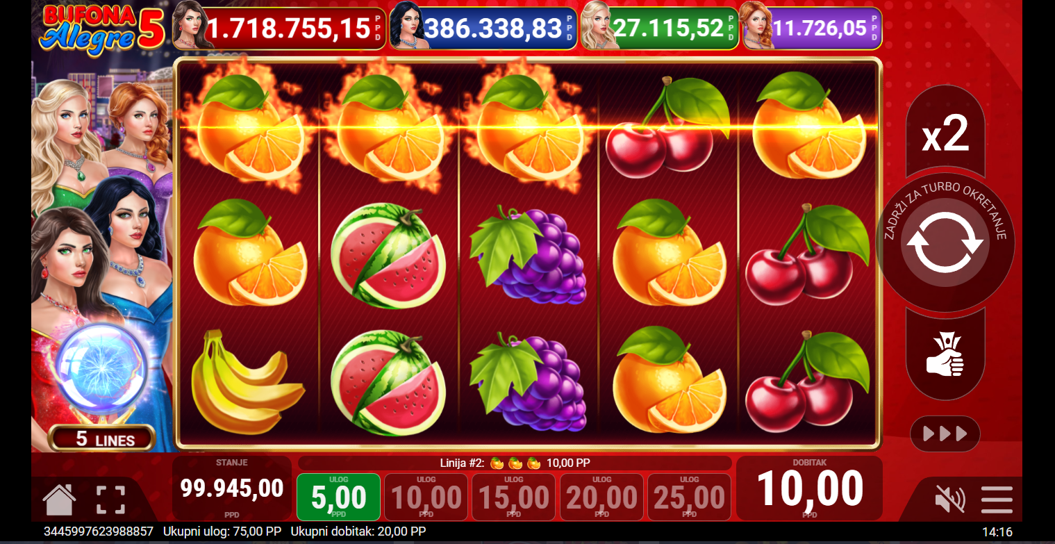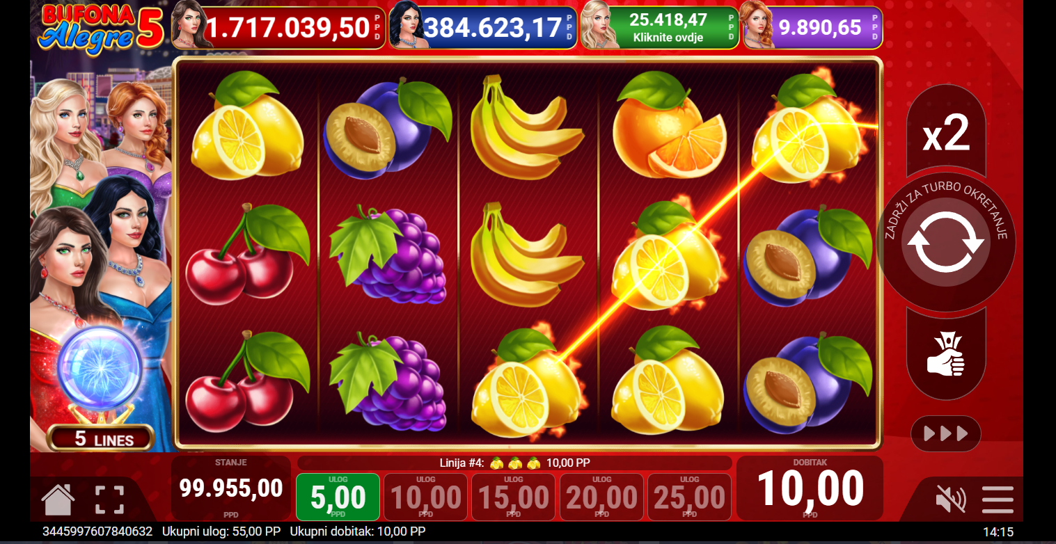 Bufona Alegre 5 ima RTP oko 96% i srednju volatilnost, što znači da donosi balans između čestih manjih i povremenih velikih isplata. Idealna je za igrače koji žele brzu, vedru i nepretencioznu slot zabavu. Kad bufoni zaplešu, znaš da se sreća smije i tebi!